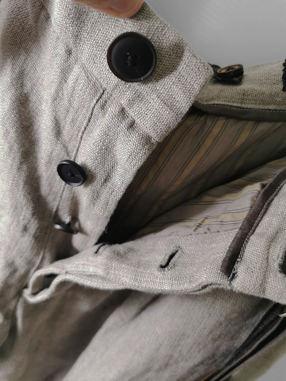 This super limited edition GBS Evolution IX EV9P09 extreme handmade suspender trouser design is one of only 5 pieces of its kind made by hand in the entire world. It was created from a classic tailored single pleated tapered leg trouser pattern from our extensive tailoring research, and cut using an all new pure linen tick stripe weave midweight luxury suiting cloth woven only for us by the world’s leading research fabric maker--Luigi Parisotto in Sarcedo Vicenza--combined with exquisite yarn-dyed striped pure cupro Bemberg-type linings made specially for us by Ezio Ghiringhelli in Varese, then specially dyed by hand in our world-famous GBS Superworkrooms at Cavarzere Venezia using a process that required over 10 hours of expert work to achieve its unique colors, patina effects, shaping, hearty feel and softness. The design features real hand made silk suspenders using our own pure Como silk fabrics and special silk woven tapes and trims that were made specially for us by the venerable Nastrificio Victor mills in Piove di Sacco di Padova, impeccable handbuilt hidden button fly front construction, handcut front and rear besom pockets, beautifully clean-finished interior construction with pure silk taped seams, real hand sewn pure GBS Como Silk taped hemlines (not machined), generous 2,5 centimeter seam allowances on major fitting seams that allow the trouser to be altered and let out, a special all hand sewn button story with advanced rubberized finish real horn buttons and stunning real burnt horn suspender buttons made only for us by the world’s greatest living buttonmakers--Claudio and Cinzia Fontana in Parma Italy--and of our signature real hand stitched buttonholes (each one required 10-14 minutes to cut and sew) in luxurious pure silk Bozzolo Reale Milano Seta threads. The piece also features our world leading pure silk hand dyed label created exclusively for us by Mion SpA in Torreglia which is the first label in the luxury industry to completely eliminate plastic polyester yarns in it--beautifully attached all by hand using pure silk thread.