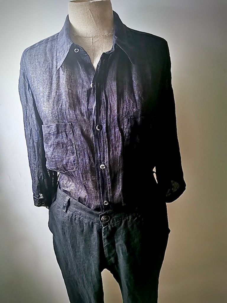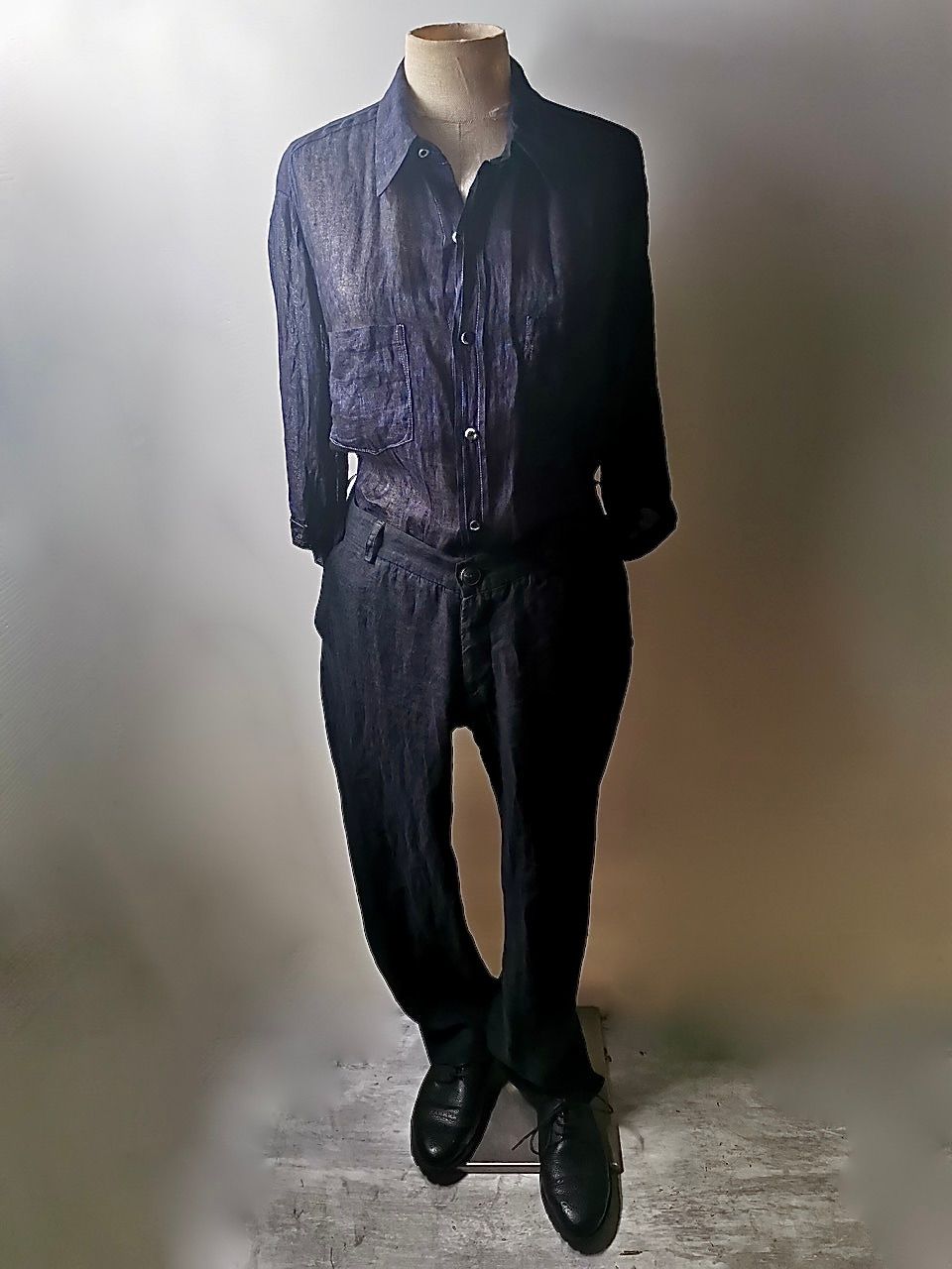 CUT from extrafine hand dyed Varese "Superleggero" Pure handkerchief linen suiting, this classic narrow leg plain front with diagonal slash pocket tailored trouser with back button besom pockets are the perfect matching trousers to pair with this jacket.