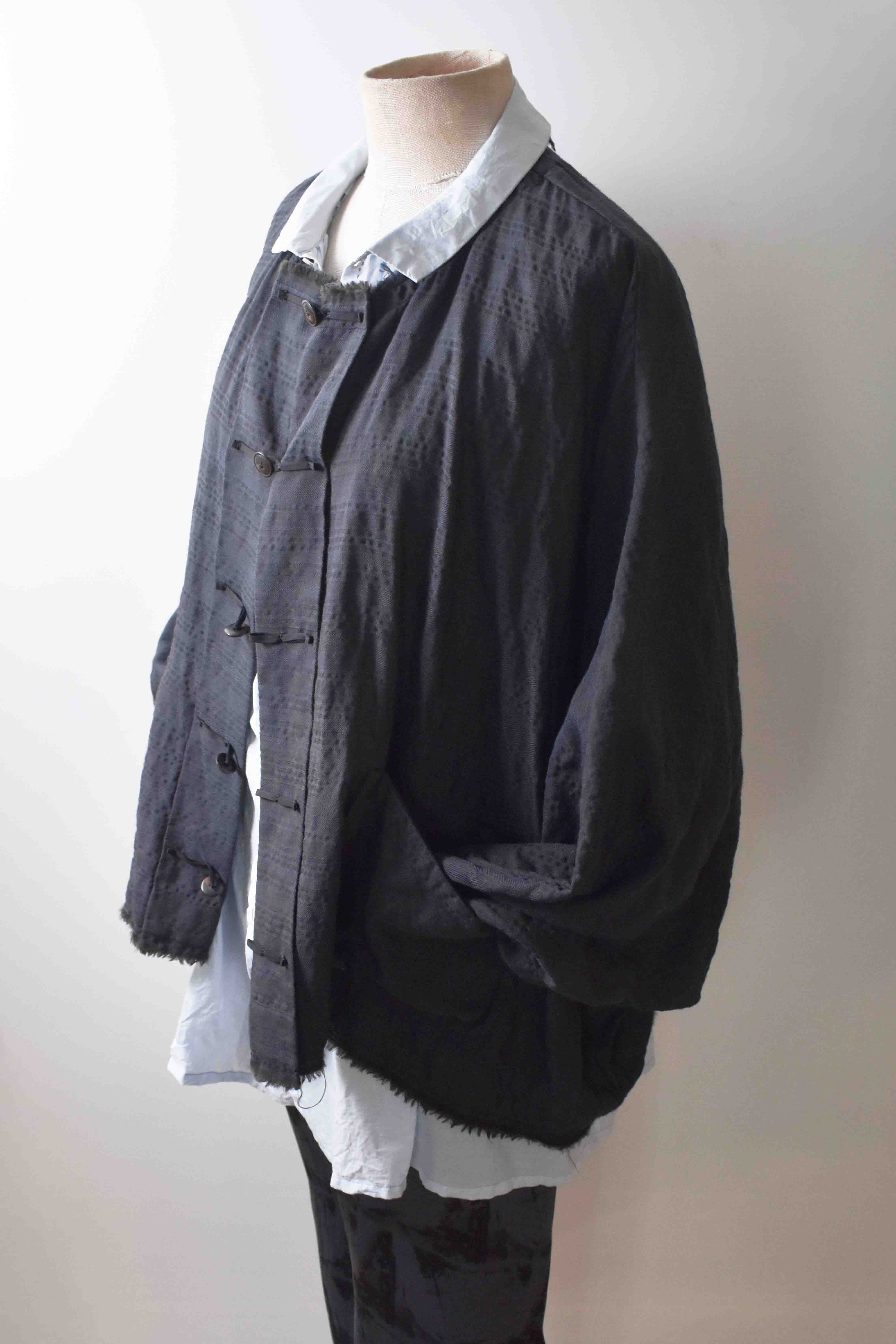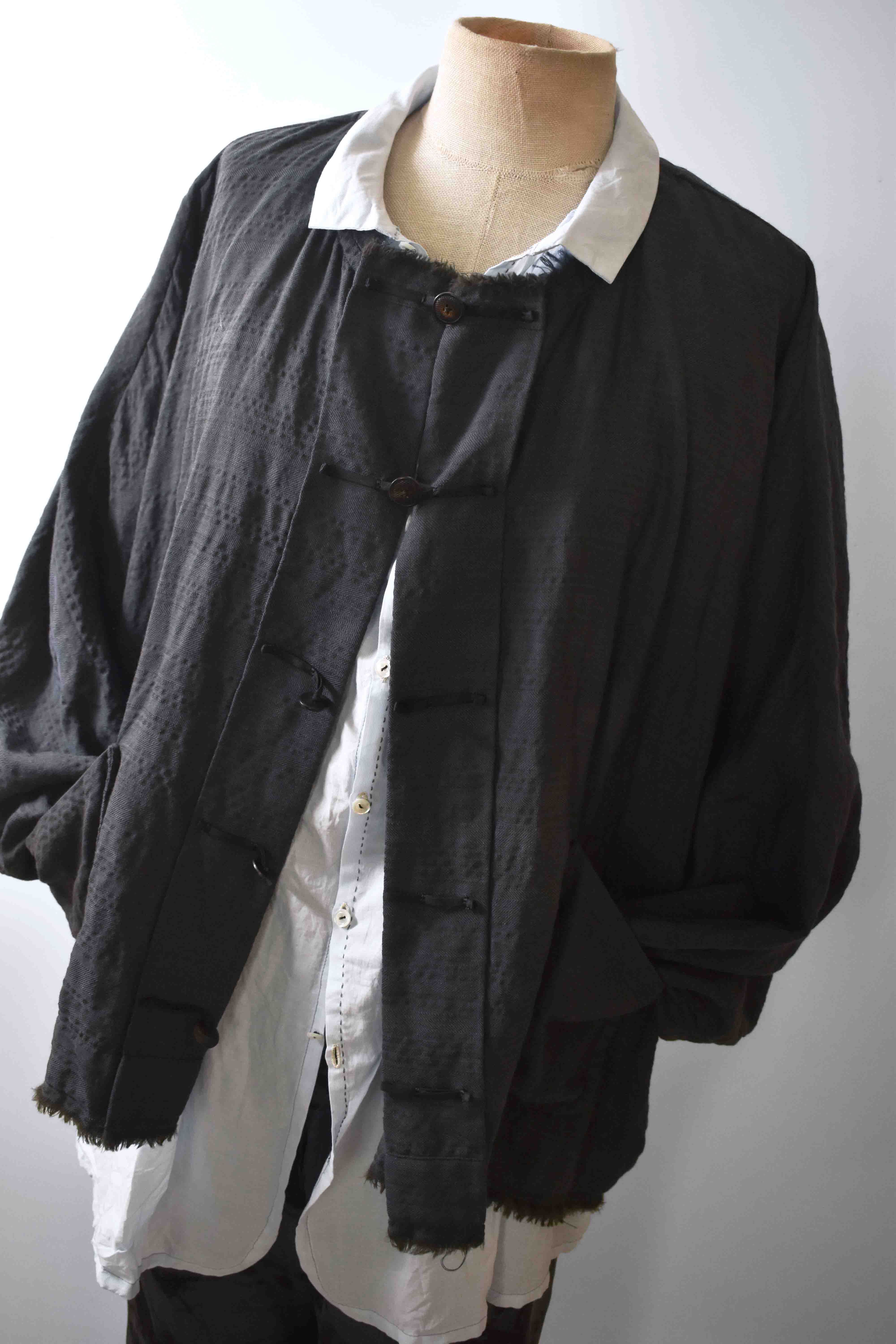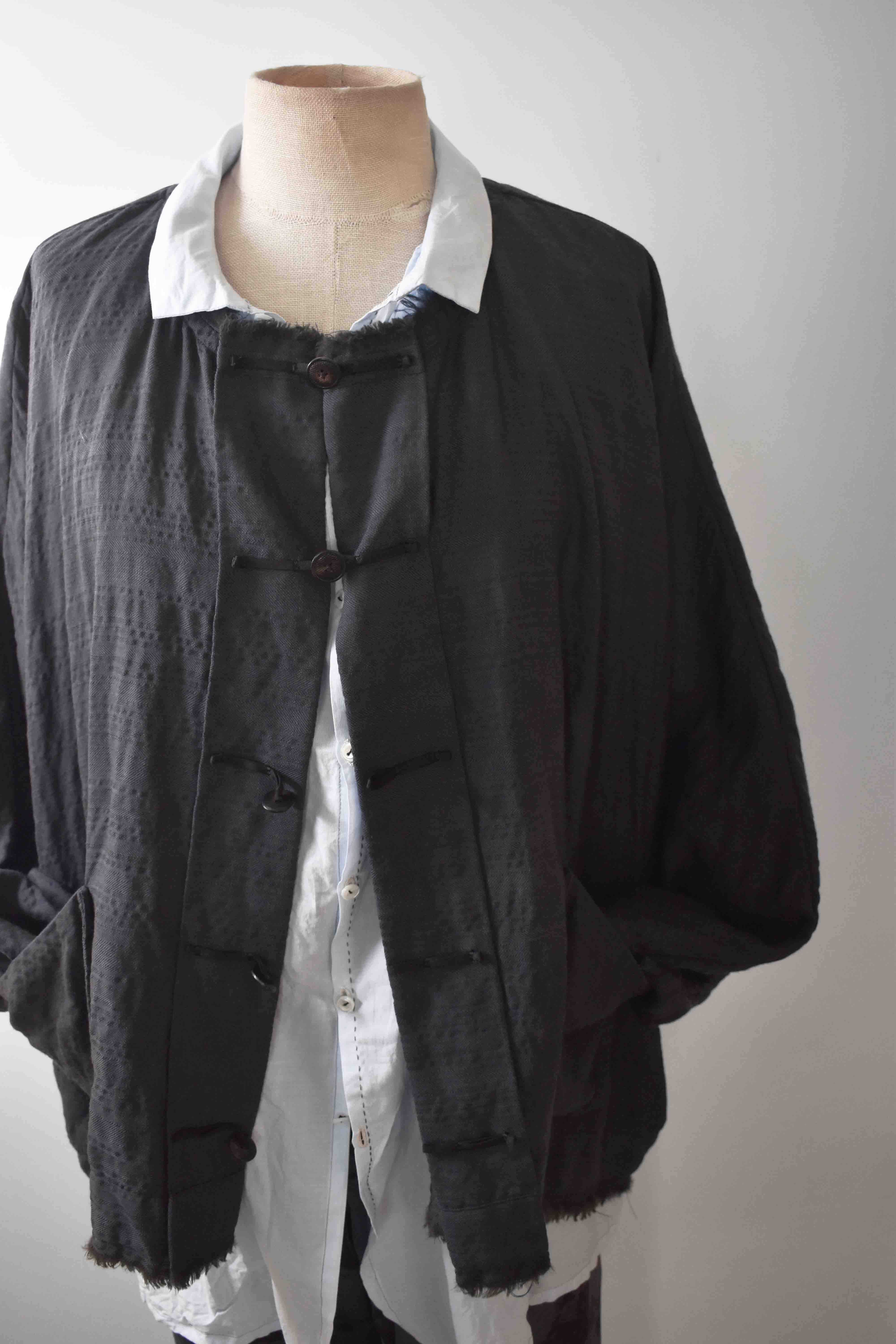 EXCLUSIVE ADVANCED DOLMAN SLEEVE WIDE BODY DESIGN - HAND DYED LUIGI PARISOTTO SUPERLIGHT PURE WOOL SUITING WITH SPECIAL DESIGN SILK HANDSTITCHED FRONT CLOSURES & FONTANA SPECIAL DESIGN REAL HORN BUTTONS