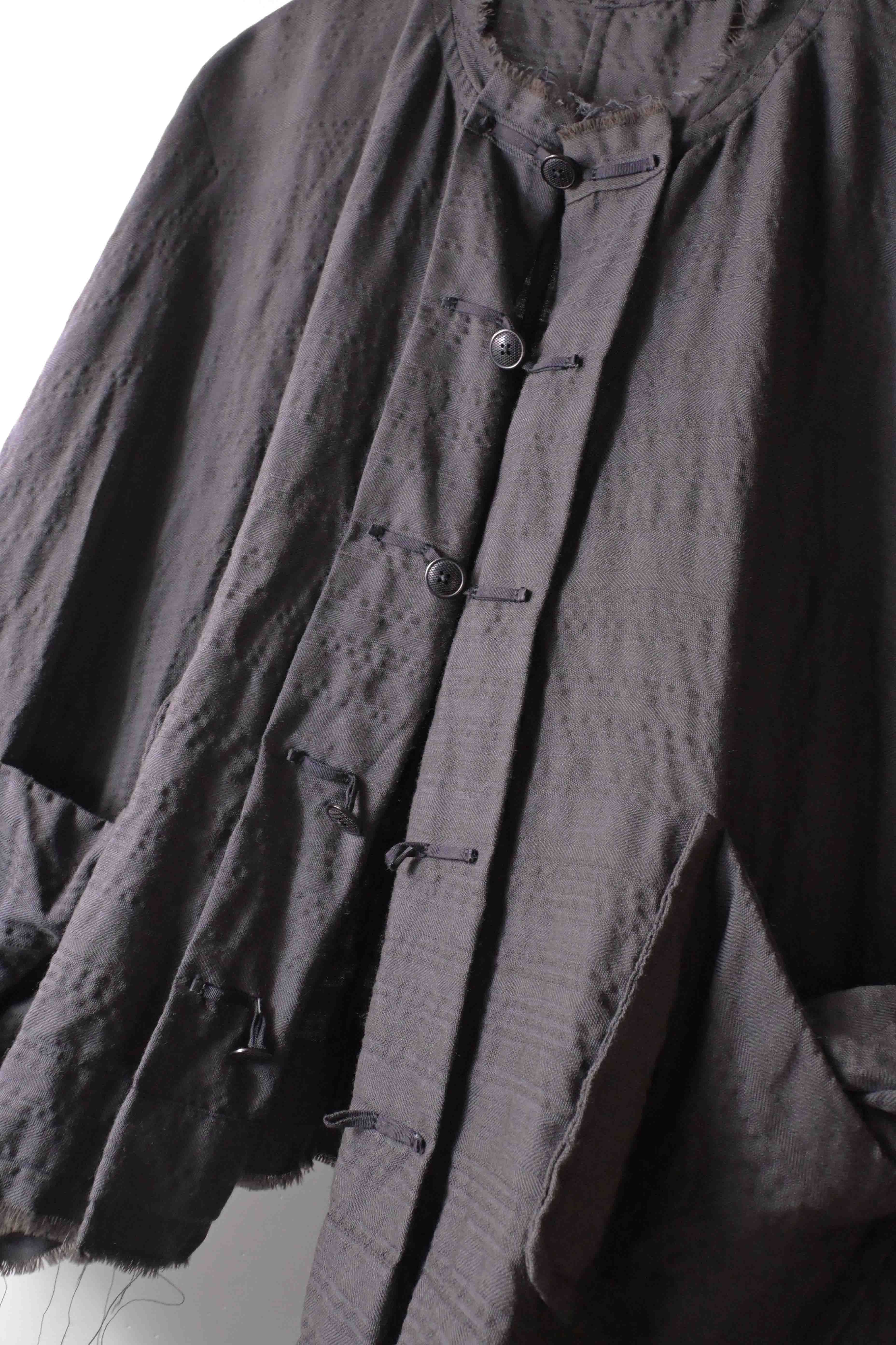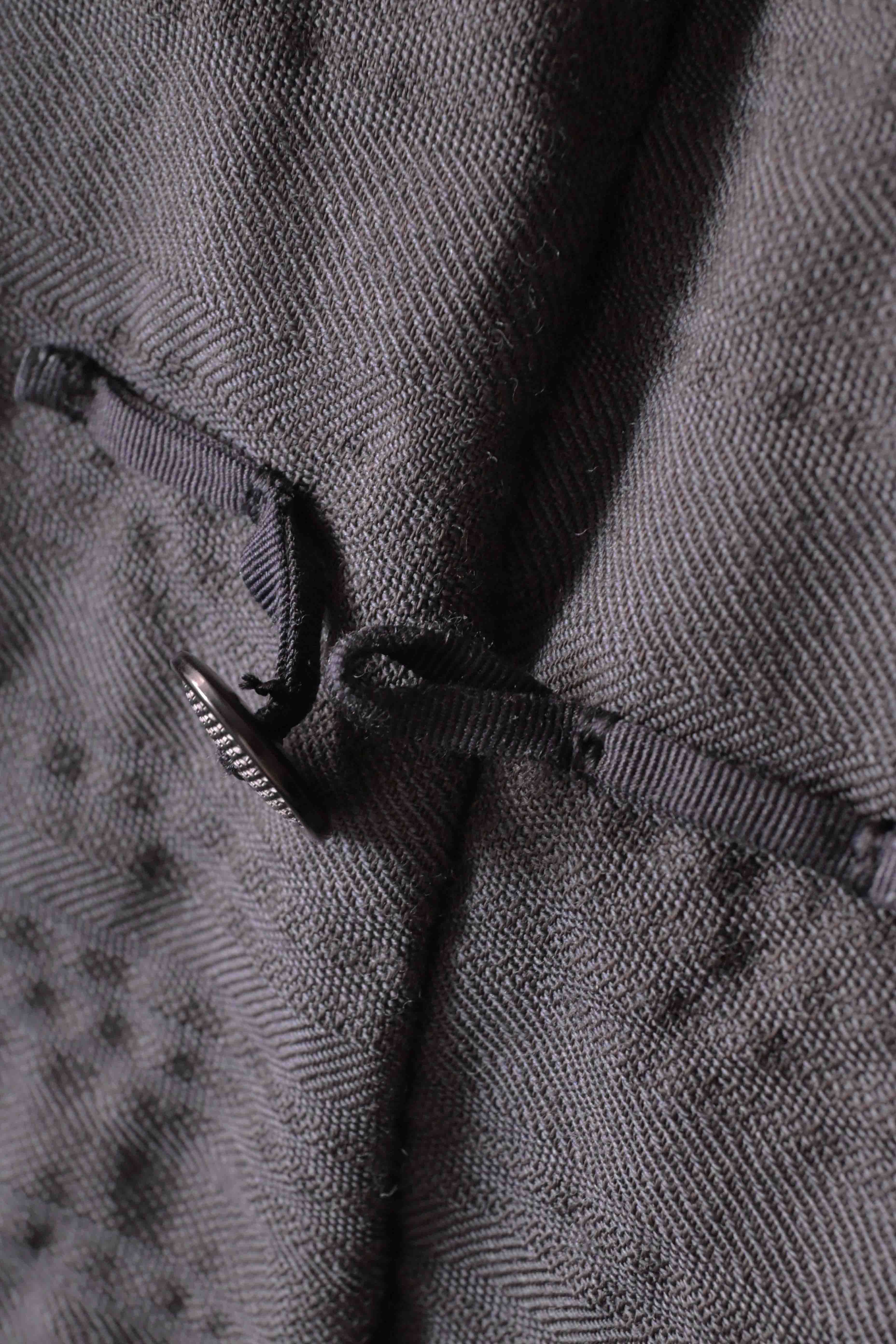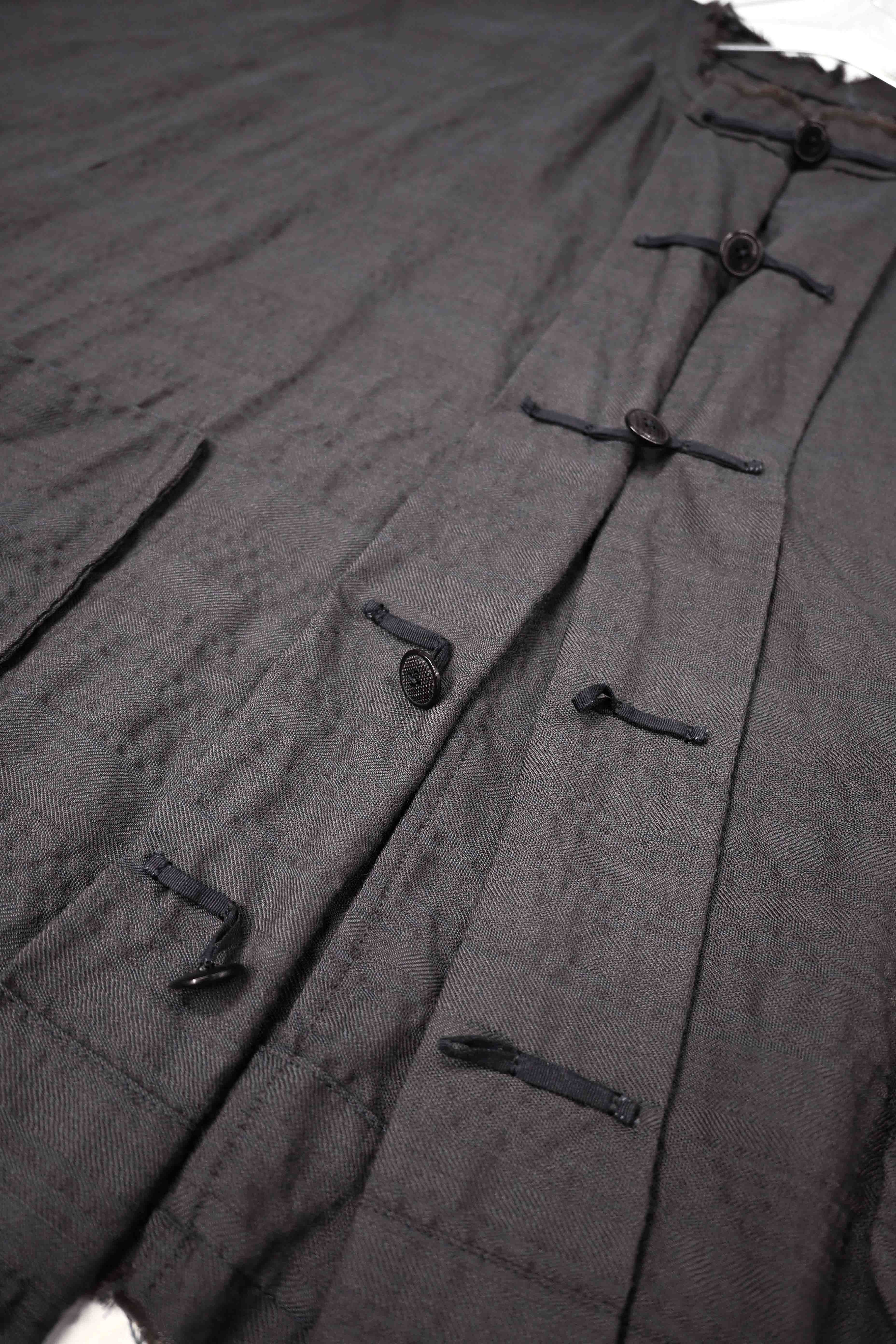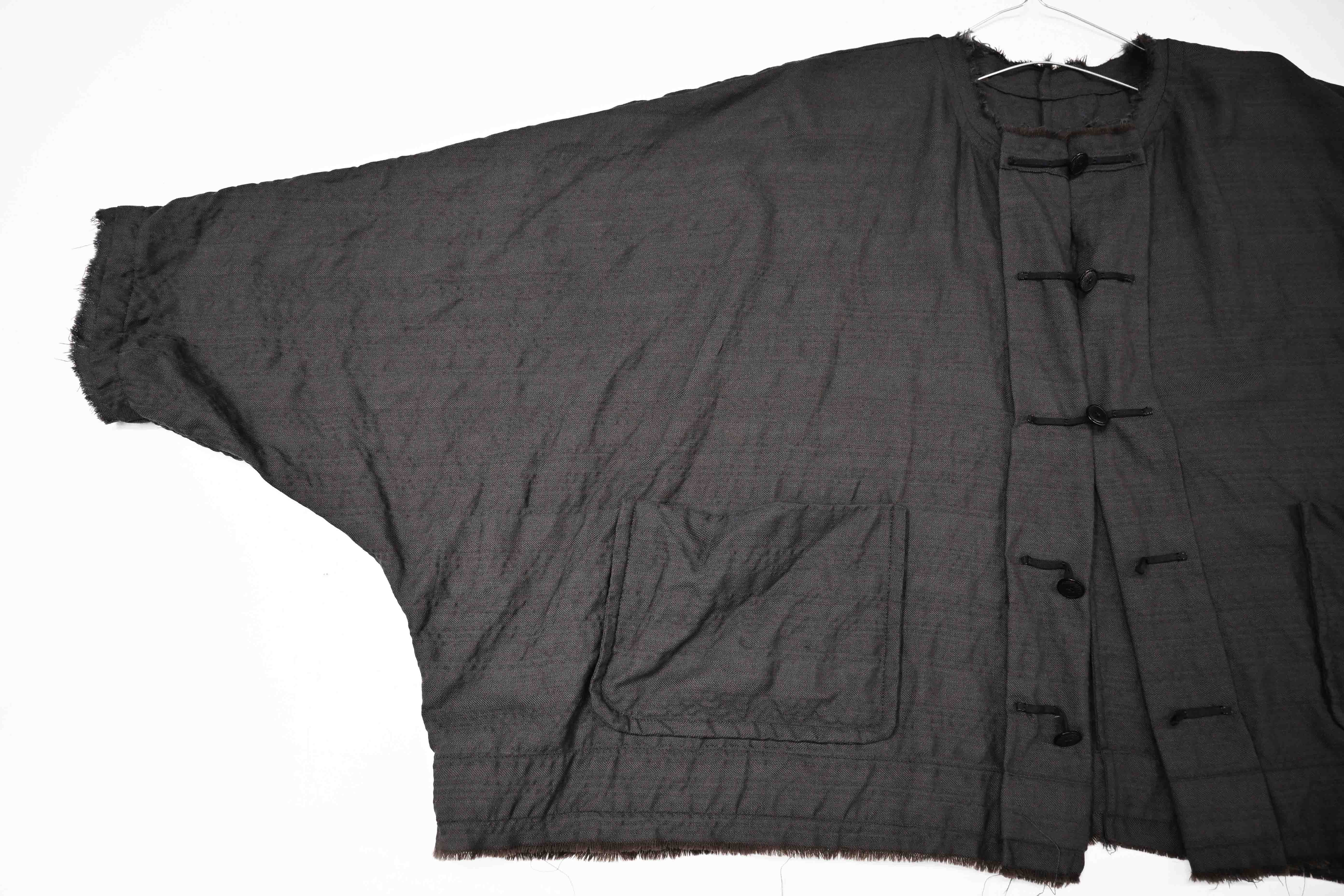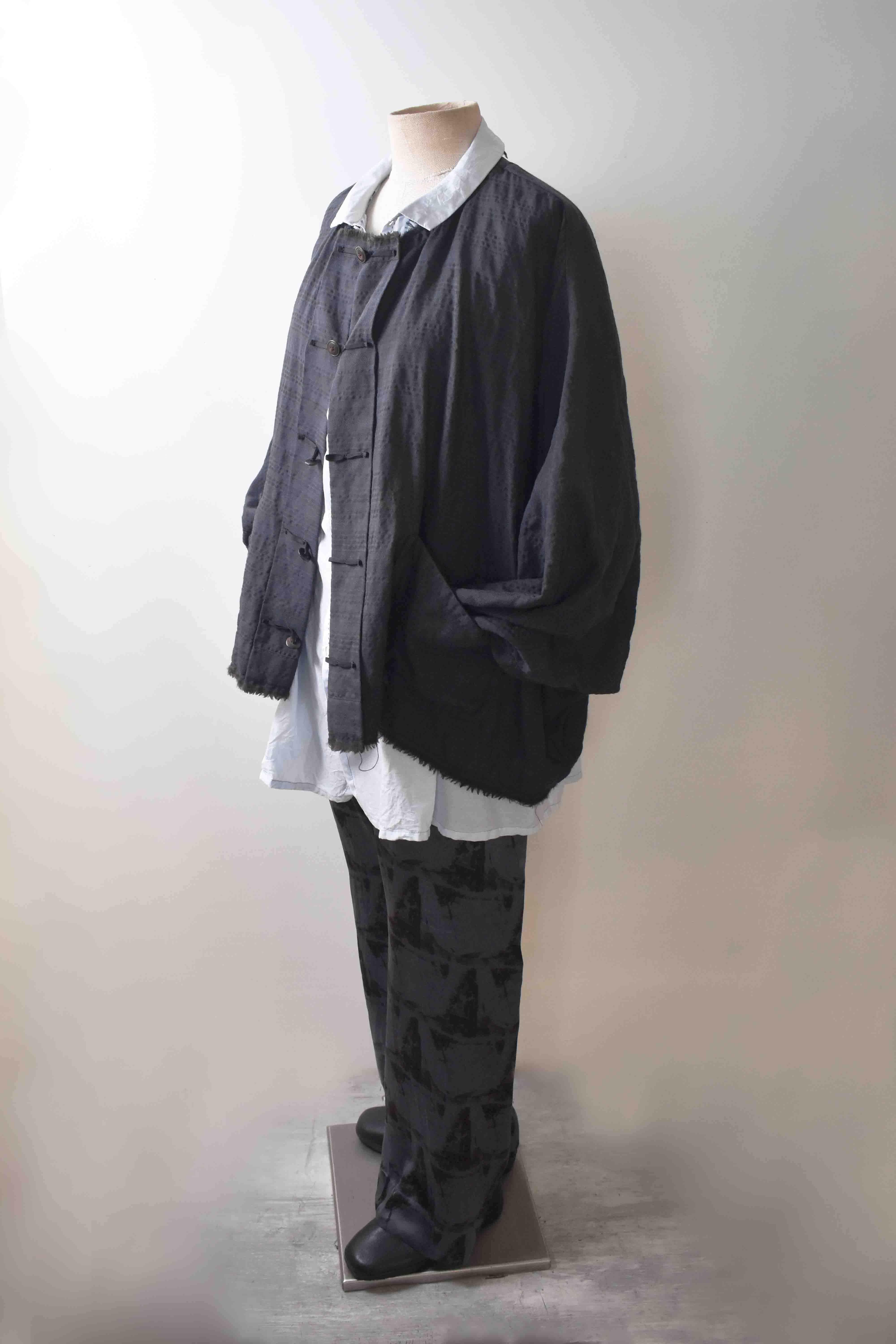 This super limited edition GBS Evolution IX.2 EV9WJ03 handmade jacket design is the only piece of its kind made by hand in the entire world. It was created exclusively from our original modified dolman sleeved wide body Asian historical jacket pattern from our extensive tailoring research, and cut using an elegant lightweight 100% pure wool broken herringbone weave luxury suiting fabric woven only for us by the world's leading research fabric maker---Luigi Parisotto in Sarcedo, Vicenza Italy---then specially dyed by hand in our world-famous GBS Superworkrooms at Cavarzere Venezia using a process that required over 15 hours of expert work to achieve its unique colors, patina effects, shaping, drape and incredible softness. The stunning design features an advanced wide body asiatic silhouette with dolman sleeve styling, handcut oversized fully-self-lined pockets, real single-needle tailored double-stitched seaming throughout the garment performed by a single-needle sewing machine authentic to the period (that takes more than twice as long to create the garment than using typical double-needle equipment), and a first in the industry technique method on bodice and sleeve hems of specially pleated and stitched fabric seaming performed entirely using expert single-needle tailoring with taglio-vivo hemwork that provides greatly increased protection and resistance to fabric unraveling versus normal unfinished taglio-vivo applications, impeccable clean-finished interior construction, and an exquisitely elegant new interpretation of the classic tángzhuāng knotted front closure system using extensive handstitched and hand dyed pure silk grosgrain woven tapes and gorgeous artisan-made incision-cut real horn button designs made only for us by the world’s greatest living buttonmakers—Claudio and Cinzia Fontana in Parma, Italy. all entirely handstitched in pure silk Bozzolo Reale Milano Seta threads (which required at least 25 minutes to create each closure assembly). The piece also features our world leading pure silk hand dyed label created exclusively for us by Mion SpA in Torreglia which is the first label in the luxury industry to completely eliminate plastic polyester yarns in it—also beautifully attached entirely by hand using pure silk threads. Variations in color and color density are not imperfections or irregularities, but specific characteristics of the special fabric, hand dyeing processes, and hand making technique.