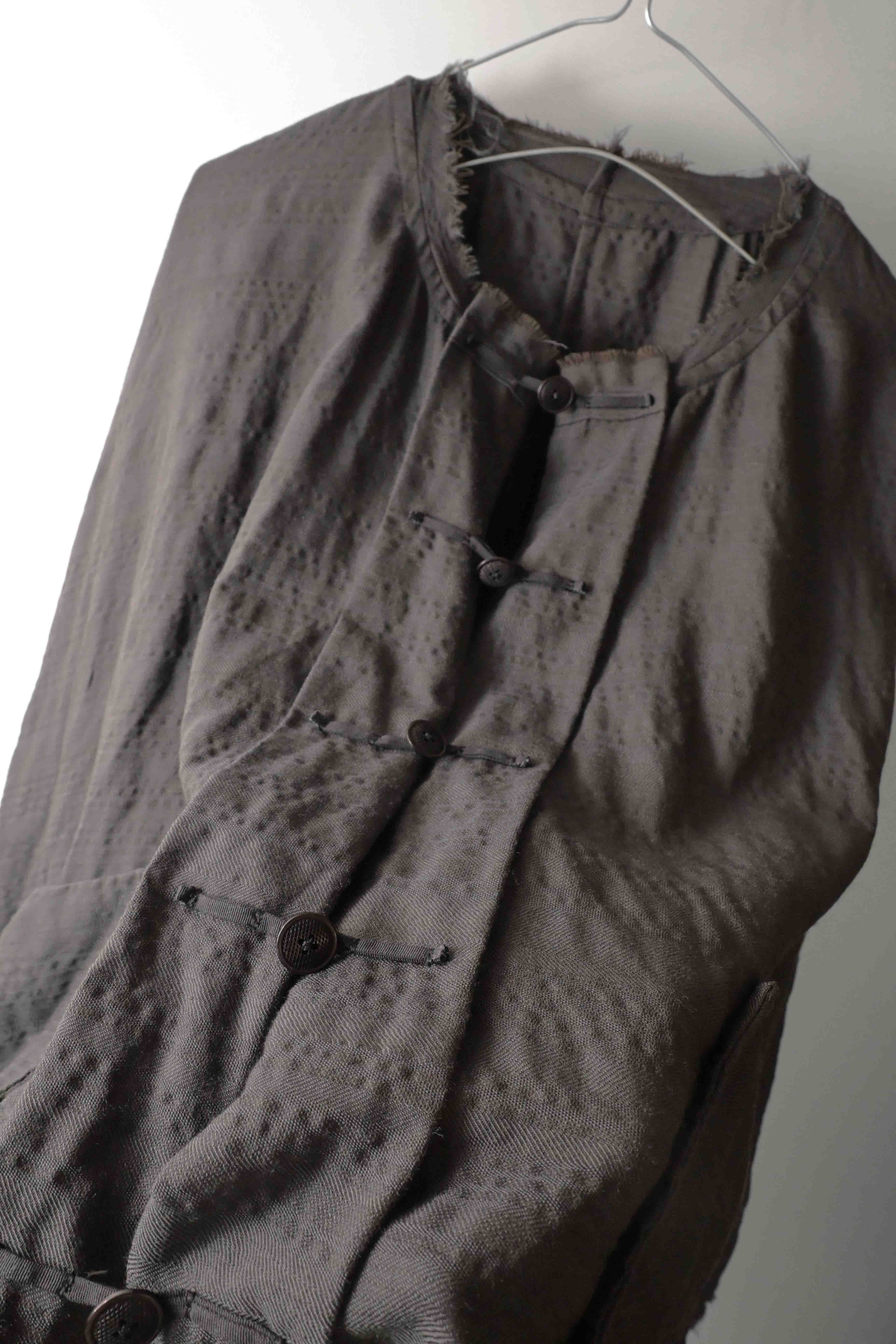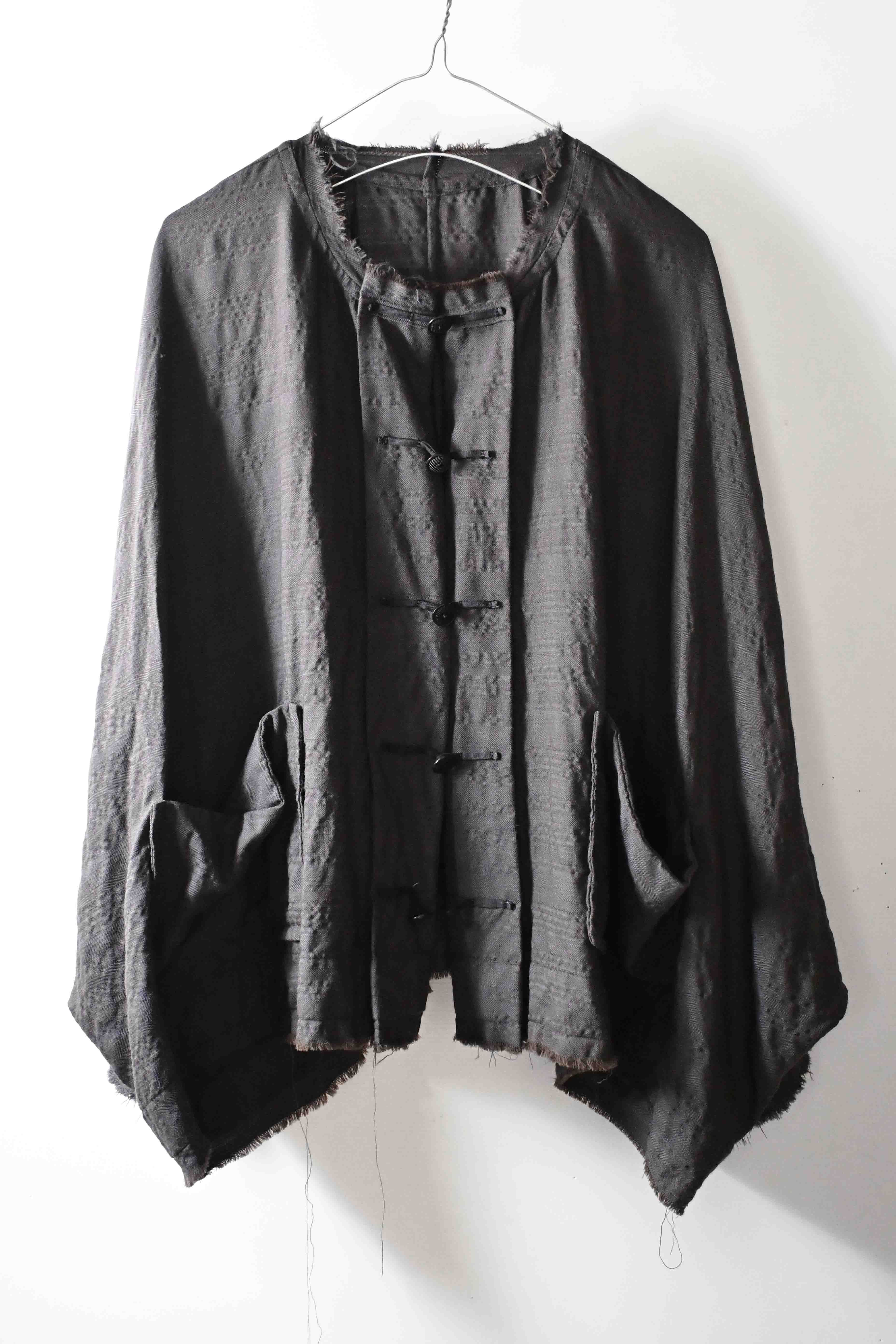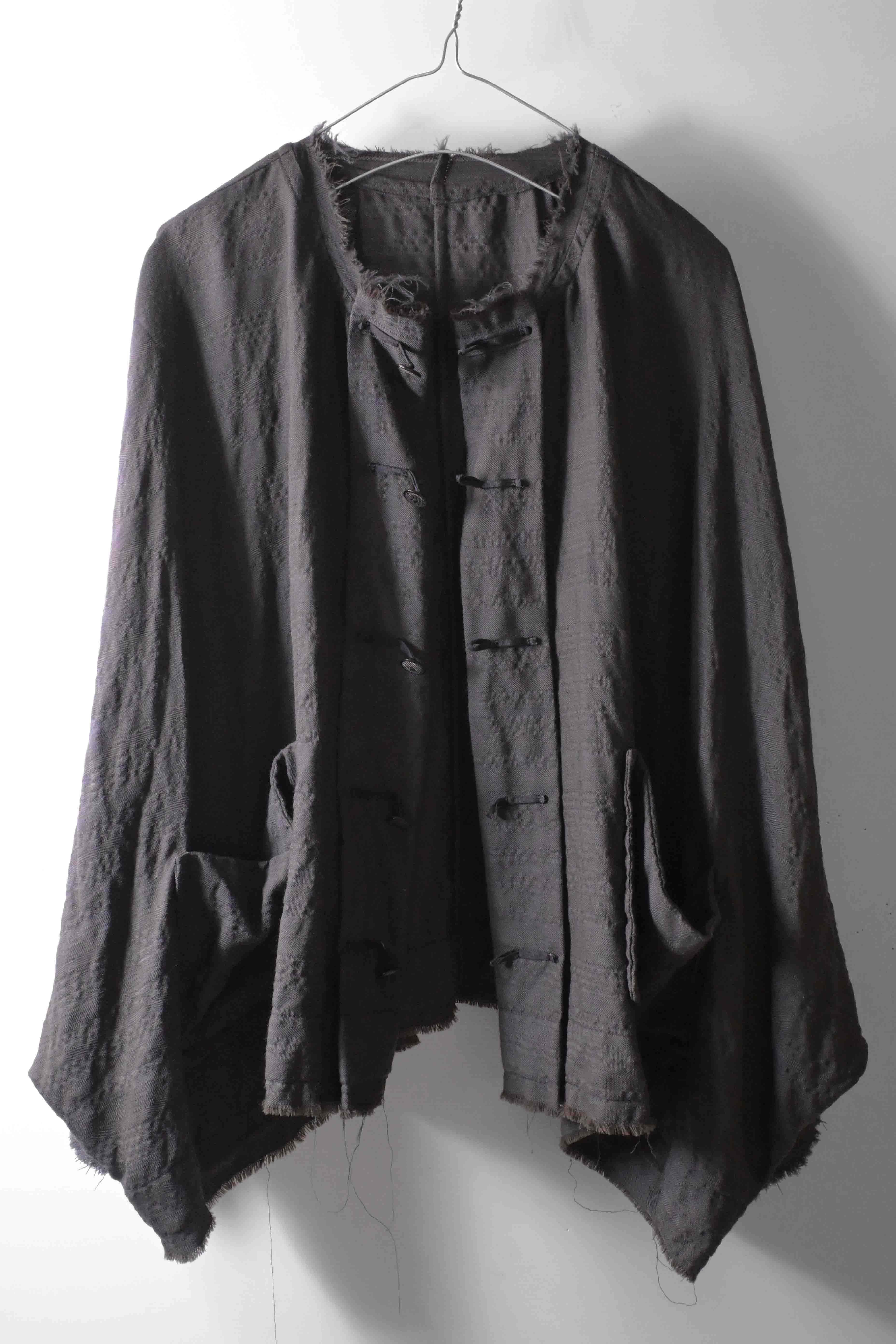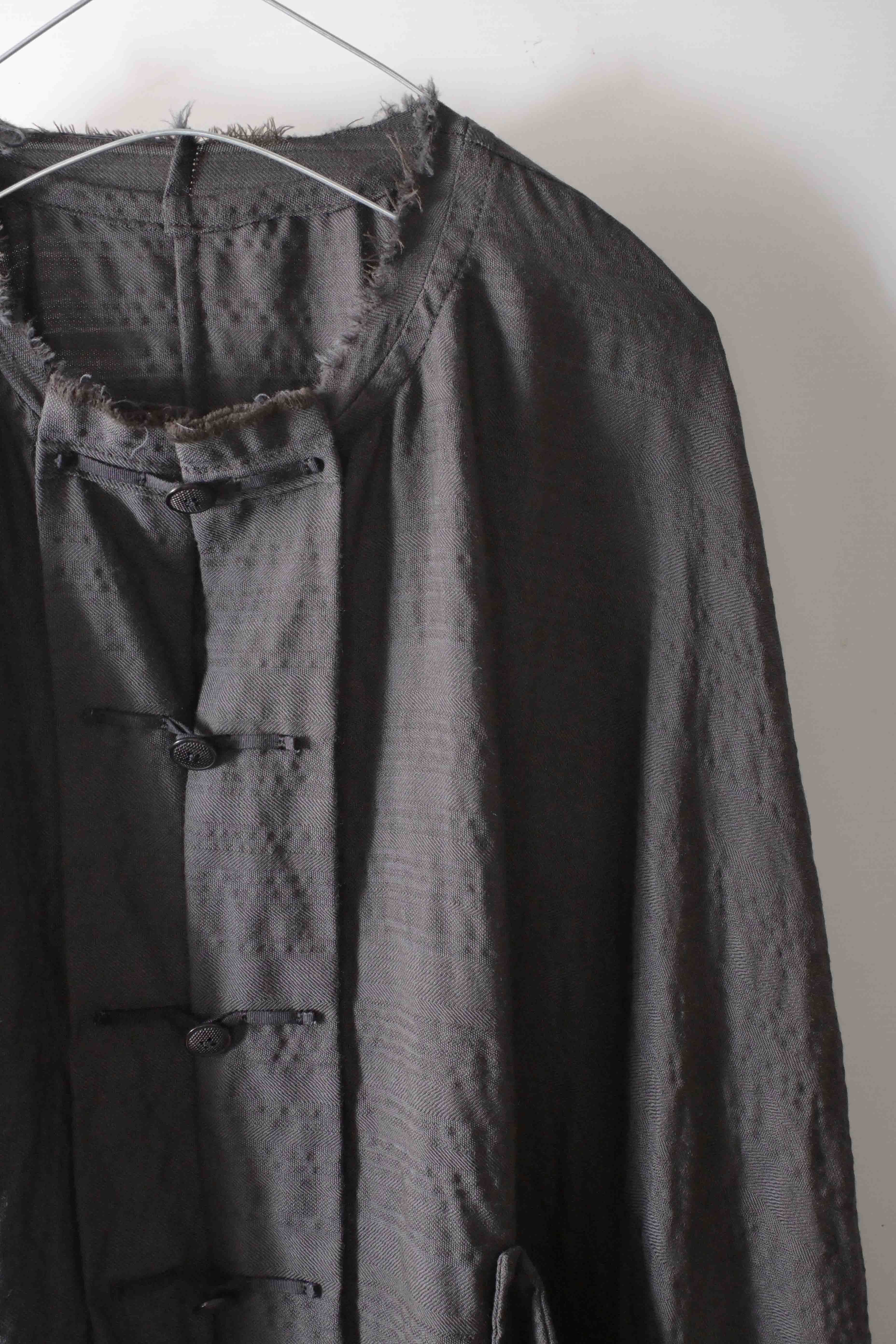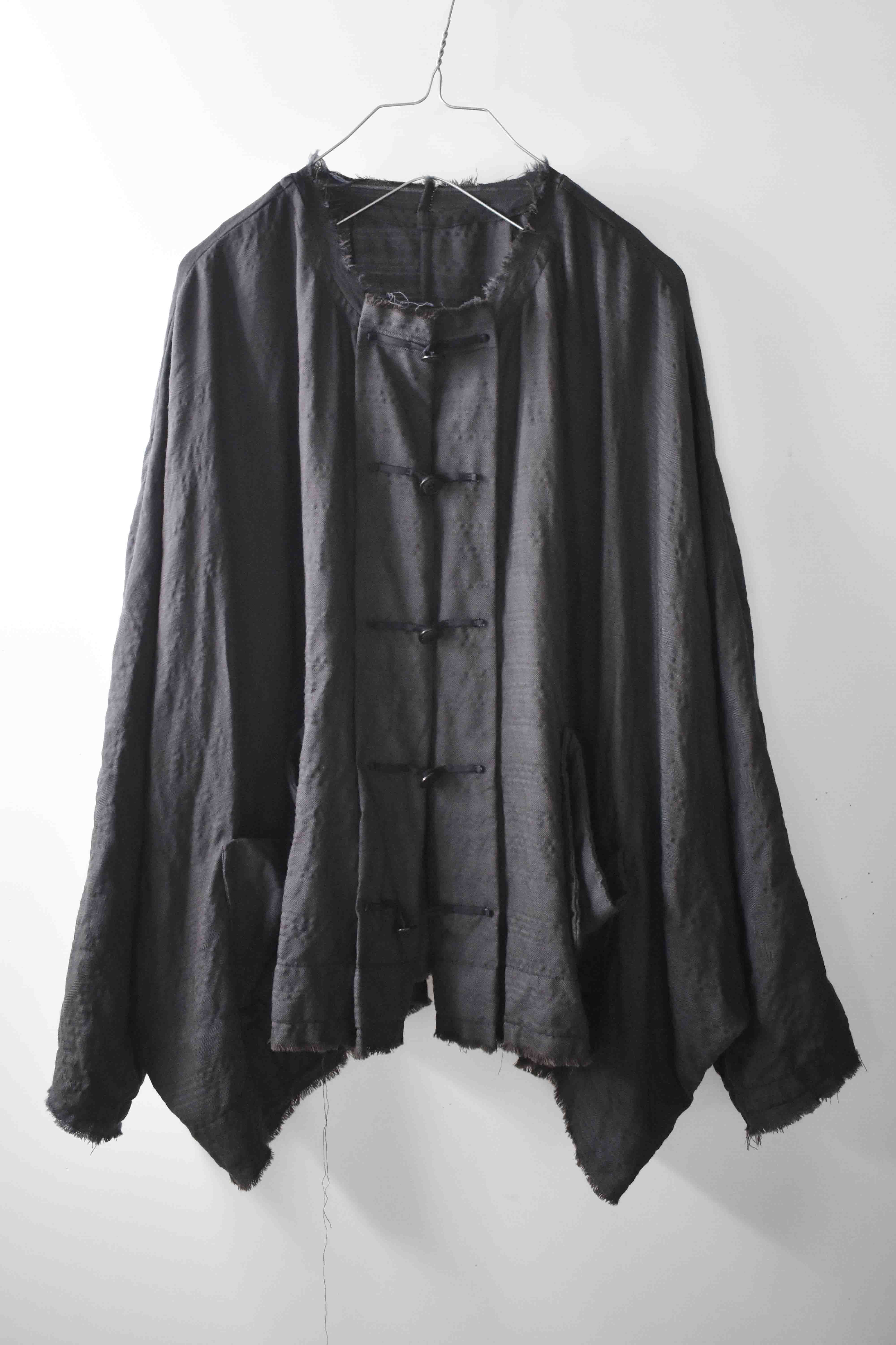 This super limited edition GBS Evolution IX.2 EV9WJ03 handmade jacket design is the only piece of its kind made by hand in the entire world. It was created exclusively from our original modified dolman sleeved wide body Asian historical jacket pattern from our extensive tailoring research, and cut using an elegant lightweight 100% pure wool broken herringbone weave luxury suiting fabric woven only for us by the world's leading research fabric maker---Luigi Parisotto in Sarcedo, Vicenza Italy---then specially dyed by hand in our world-famous GBS Superworkrooms at Cavarzere Venezia using a process that required over 15 hours of expert work to achieve its unique colors, patina effects, shaping, drape and incredible softness. The stunning design features an advanced wide body asiatic silhouette with dolman sleeve styling, handcut oversized fully-self-lined pockets, real single-needle tailored double-stitched seaming throughout the garment performed by a single-needle sewing machine authentic to the period (that takes more than twice as long to create the garment than using typical double-needle equipment), and a first in the industry technique method on bodice and sleeve hems of specially pleated and stitched fabric seaming performed entirely using expert single-needle tailoring with taglio-vivo hemwork that provides greatly increased protection and resistance to fabric unraveling versus normal unfinished taglio-vivo applications, impeccable clean-finished interior construction, and an exquisitely elegant new interpretation of the classic tángzhuāng knotted front closure system using extensive handstitched and hand dyed pure silk grosgrain woven tapes and gorgeous artisan-made incision-cut real horn button designs made only for us by the world’s greatest living buttonmakers—Claudio and Cinzia Fontana in Parma, Italy. all entirely handstitched in pure silk Bozzolo Reale Milano Seta threads (which required at least 25 minutes to create each closure assembly). The piece also features our world leading pure silk hand dyed label created exclusively for us by Mion SpA in Torreglia which is the first label in the luxury industry to completely eliminate plastic polyester yarns in it—also beautifully attached entirely by hand using pure silk threads. Variations in color and color density are not imperfections or irregularities, but specific characteristics of the special fabric, hand dyeing processes, and hand making technique.