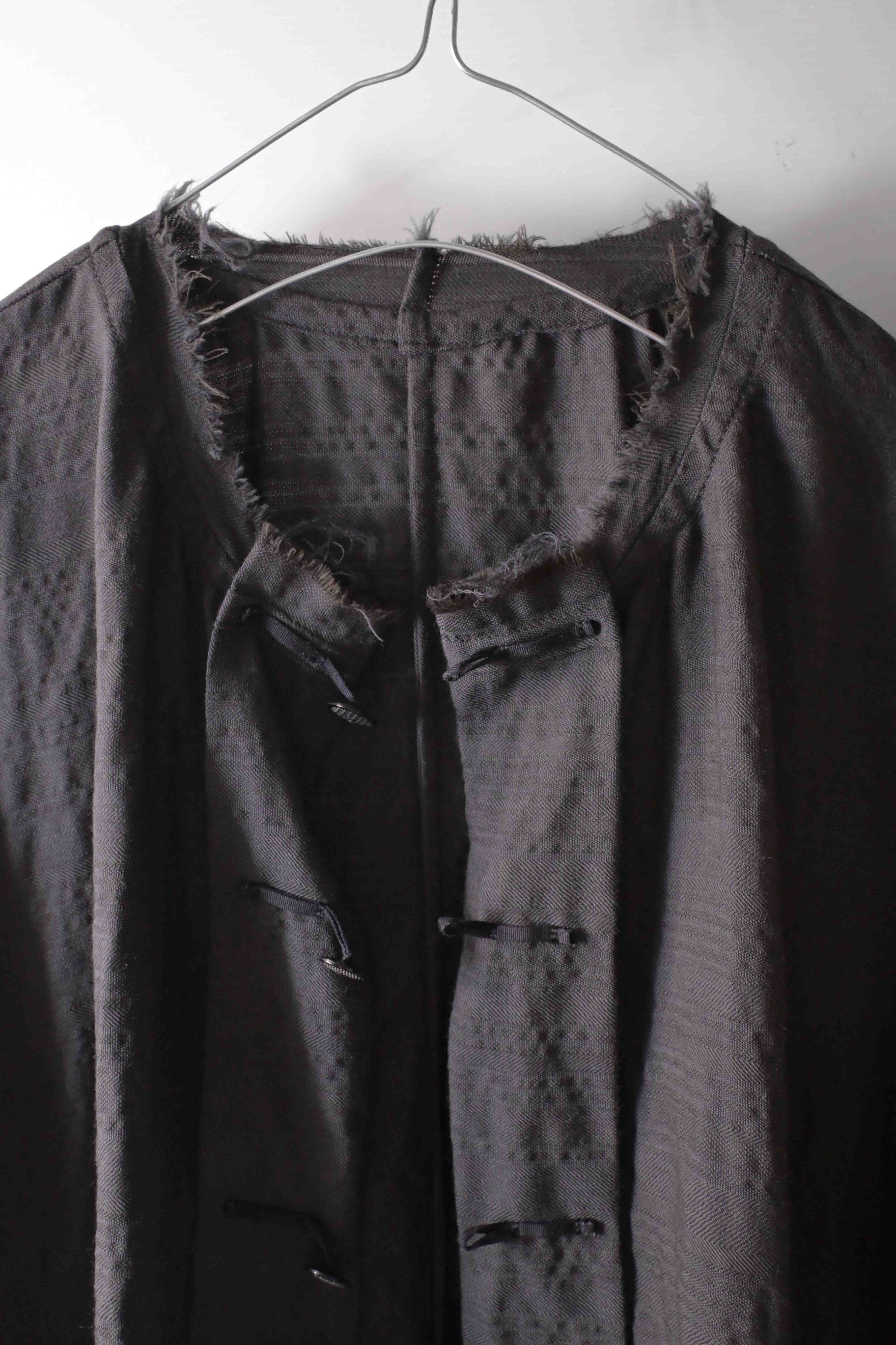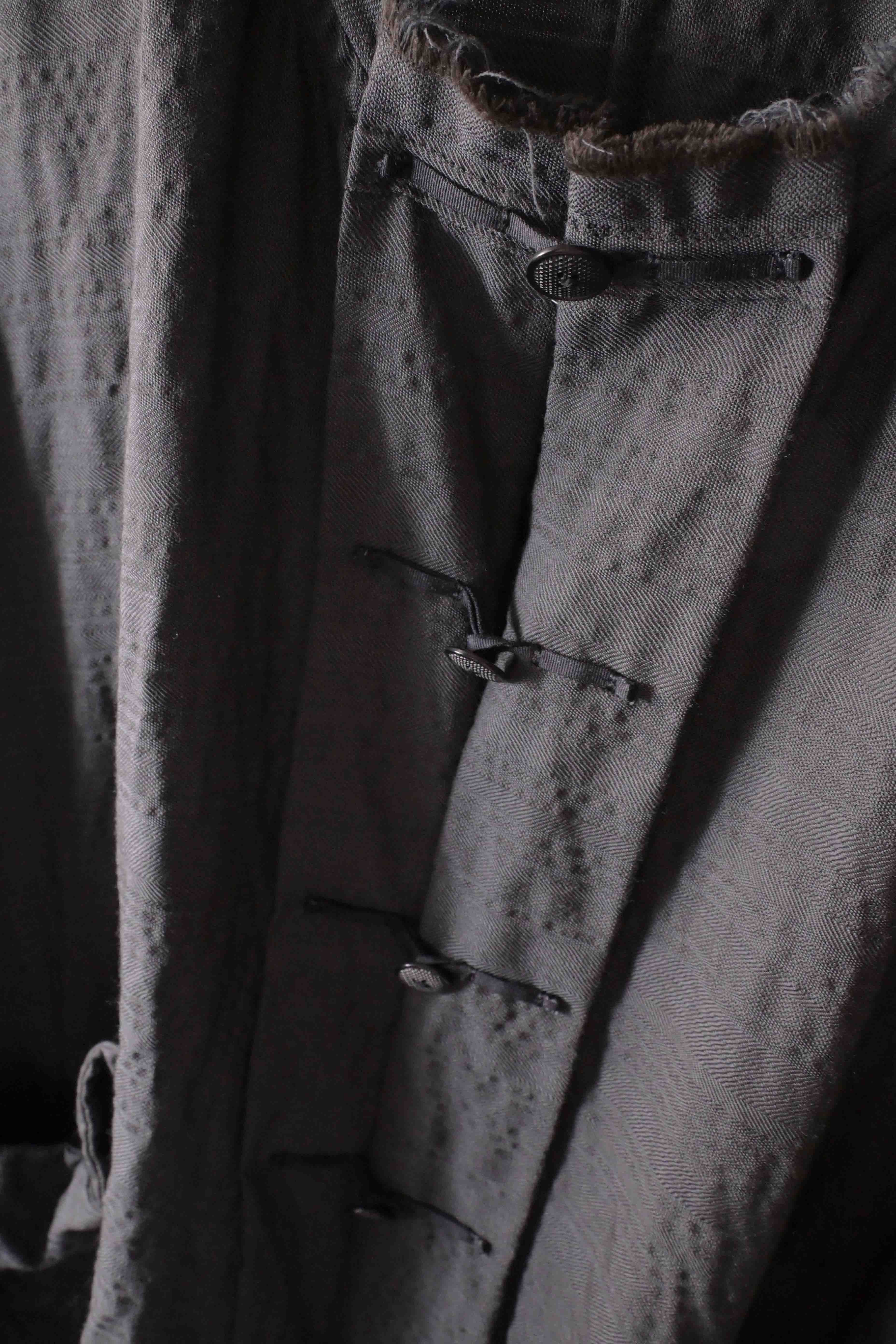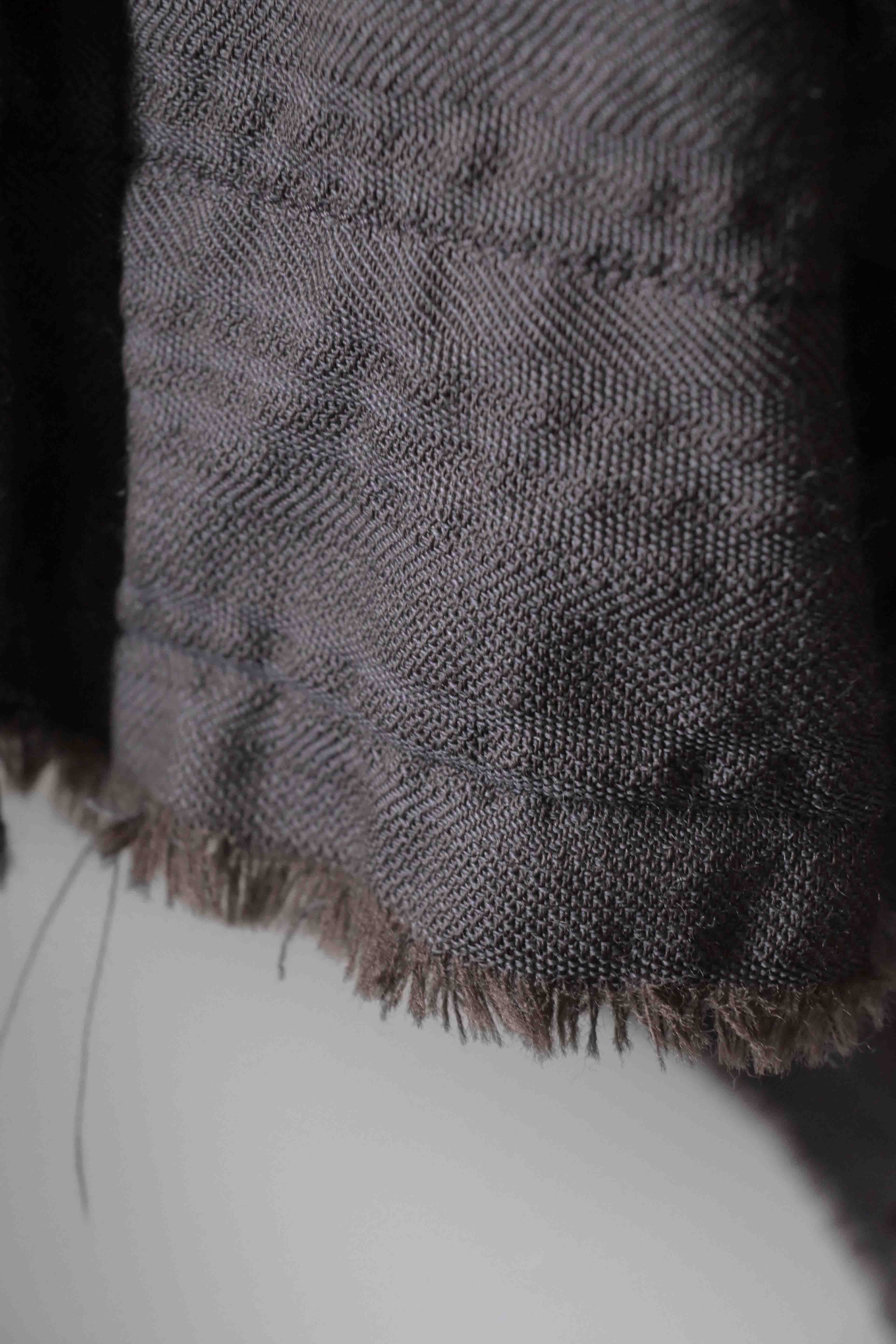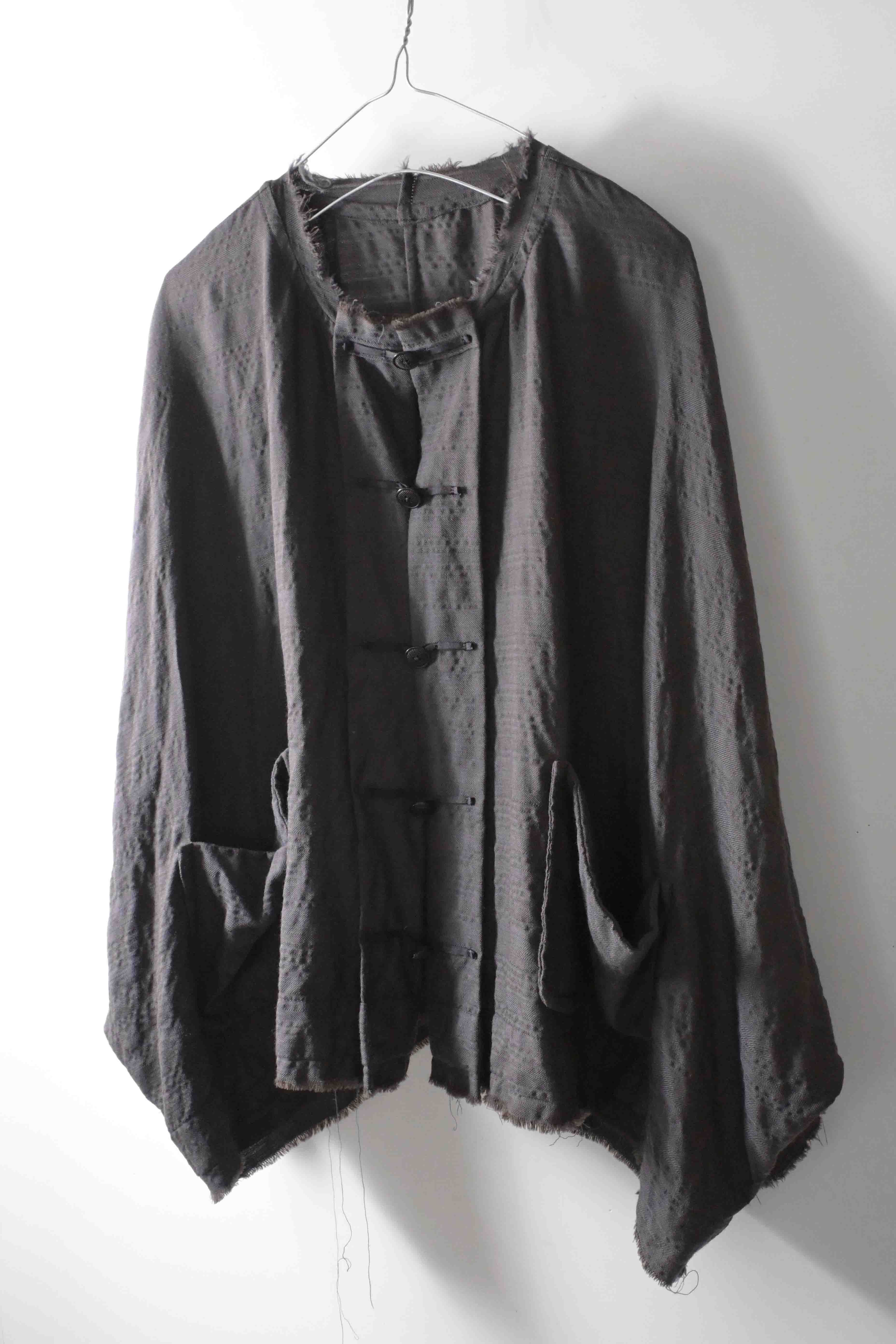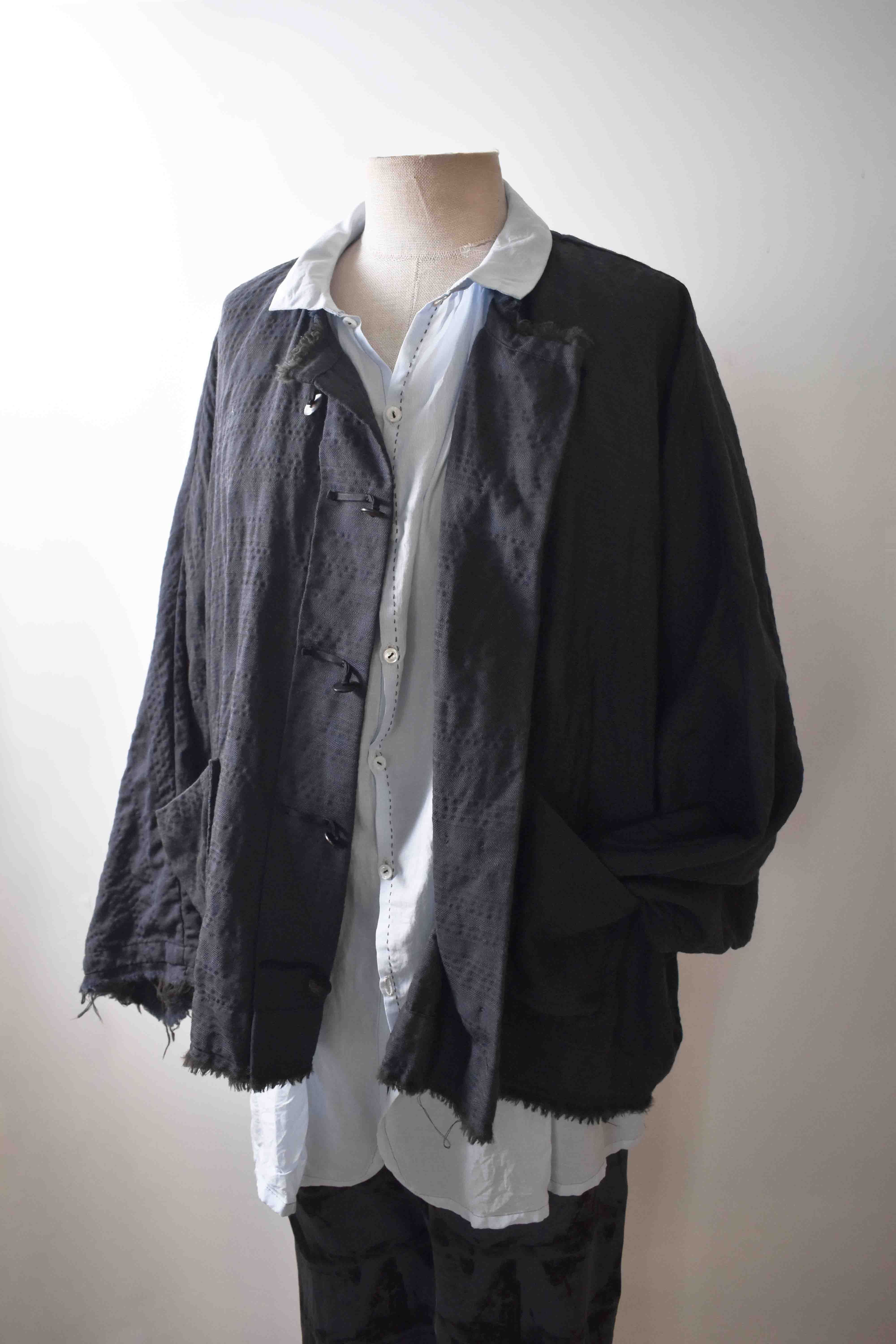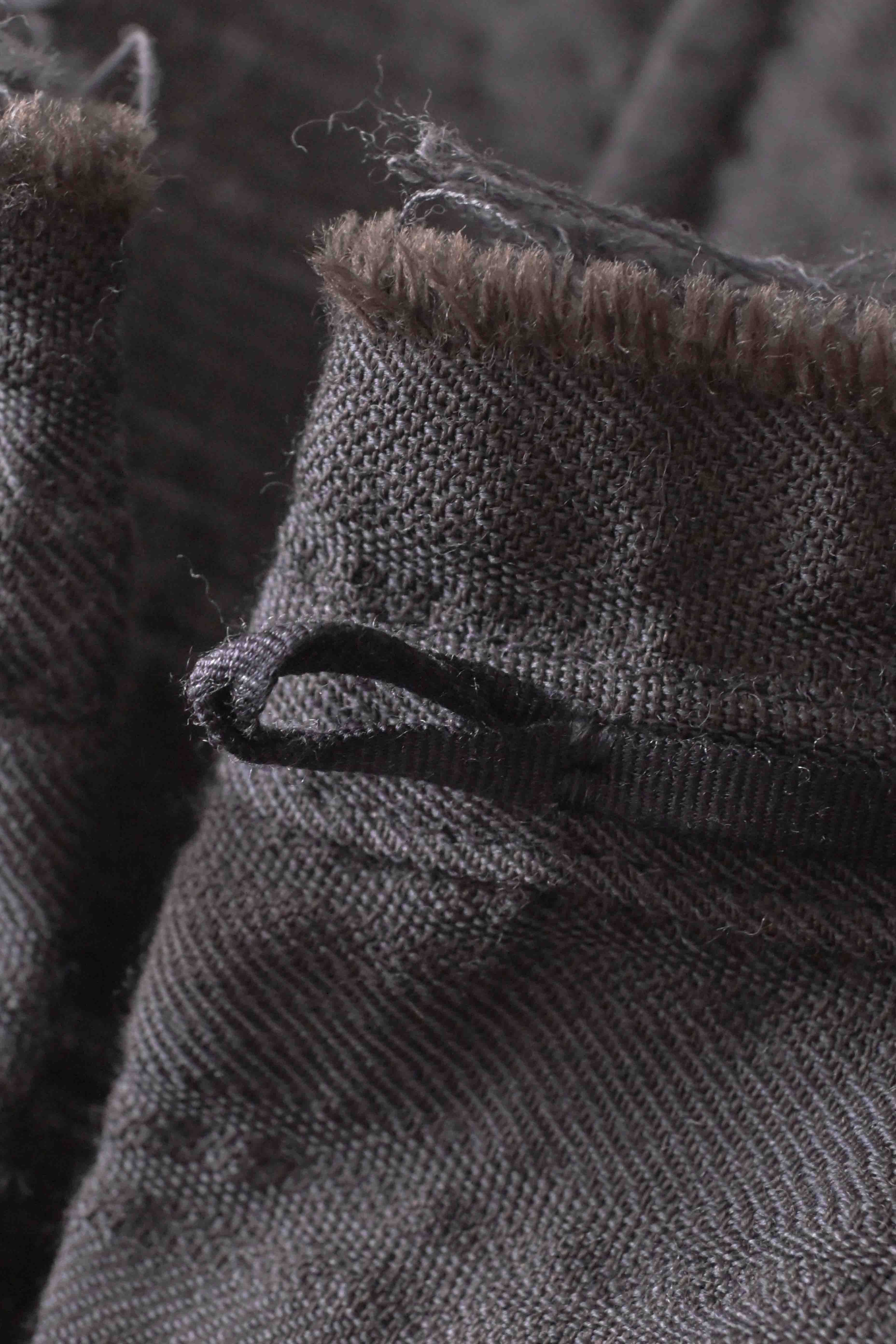 This super limited edition GBS Evolution IX.2 EV9WJ03 handmade jacket design is the only piece of its kind made by hand in the entire world. It was created exclusively from our original modified dolman sleeved wide body Asian historical jacket pattern from our extensive tailoring research, and cut using an elegant lightweight 100% pure wool broken herringbone weave luxury suiting fabric woven only for us by the world's leading research fabric maker---Luigi Parisotto in Sarcedo, Vicenza Italy---then specially dyed by hand in our world-famous GBS Superworkrooms at Cavarzere Venezia using a process that required over 15 hours of expert work to achieve its unique colors, patina effects, shaping, drape and incredible softness. The stunning design features an advanced wide body asiatic silhouette with dolman sleeve styling, handcut oversized fully-self-lined pockets, real single-needle tailored double-stitched seaming throughout the garment performed by a single-needle sewing machine authentic to the period (that takes more than twice as long to create the garment than using typical double-needle equipment), and a first in the industry technique method on bodice and sleeve hems of specially pleated and stitched fabric seaming performed entirely using expert single-needle tailoring with taglio-vivo hemwork that provides greatly increased protection and resistance to fabric unraveling versus normal unfinished taglio-vivo applications, impeccable clean-finished interior construction, and an exquisitely elegant new interpretation of the classic tángzhuāng knotted front closure system using extensive handstitched and hand dyed pure silk grosgrain woven tapes and gorgeous artisan-made incision-cut real horn button designs made only for us by the world’s greatest living buttonmakers—Claudio and Cinzia Fontana in Parma, Italy. all entirely handstitched in pure silk Bozzolo Reale Milano Seta threads (which required at least 25 minutes to create each closure assembly). The piece also features our world leading pure silk hand dyed label created exclusively for us by Mion SpA in Torreglia which is the first label in the luxury industry to completely eliminate plastic polyester yarns in it—also beautifully attached entirely by hand using pure silk threads. Variations in color and color density are not imperfections or irregularities, but specific characteristics of the special fabric, hand dyeing processes, and hand making technique.