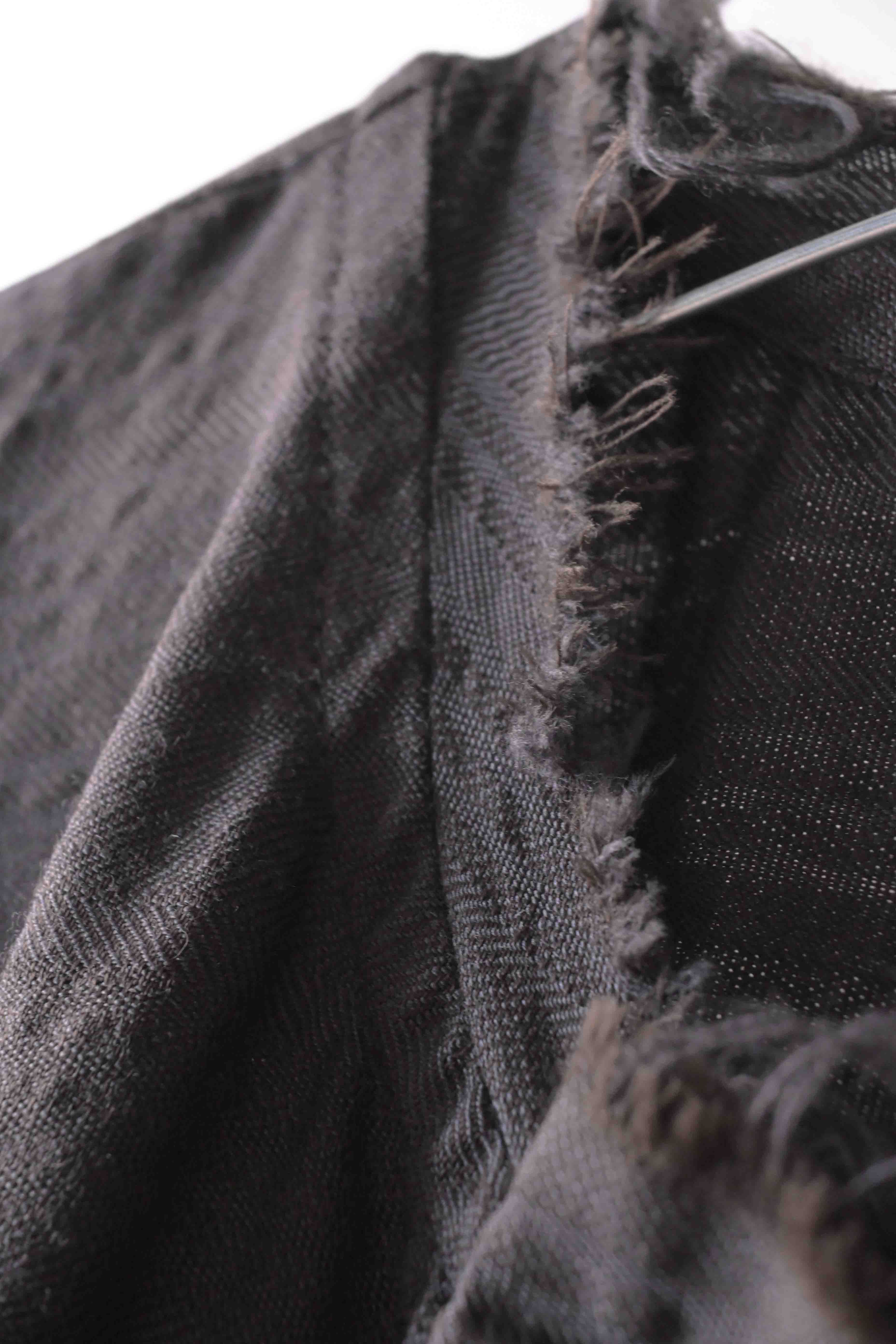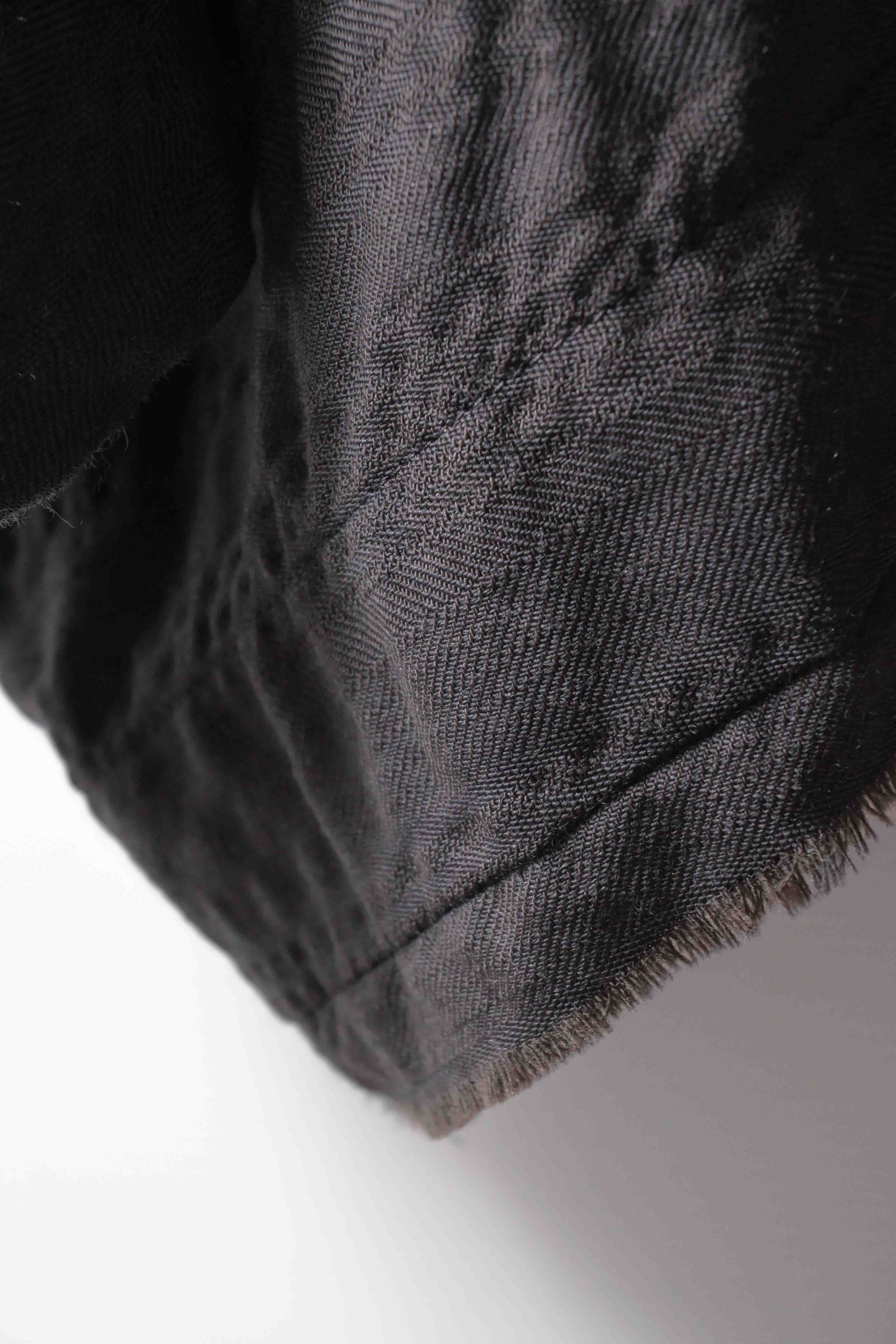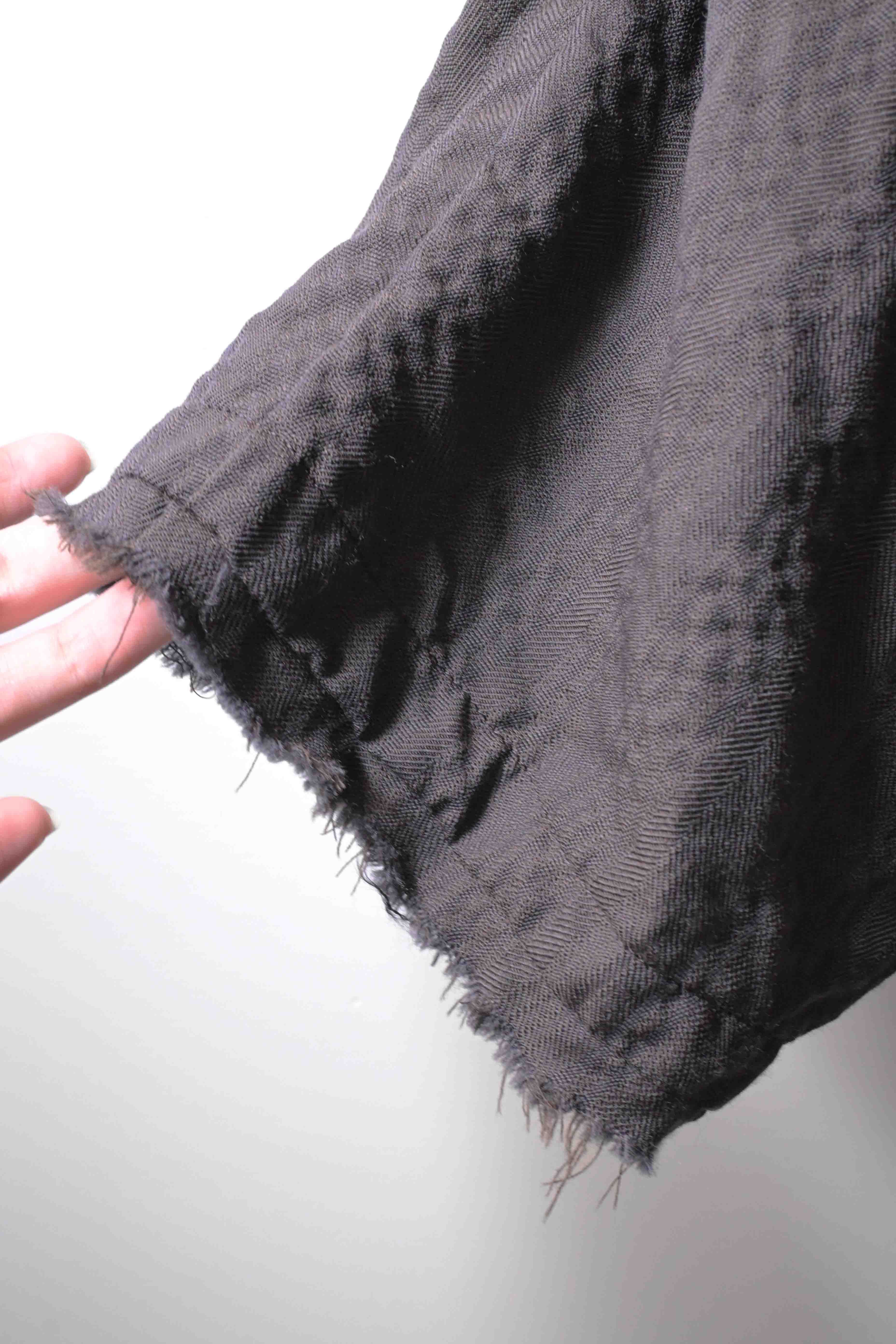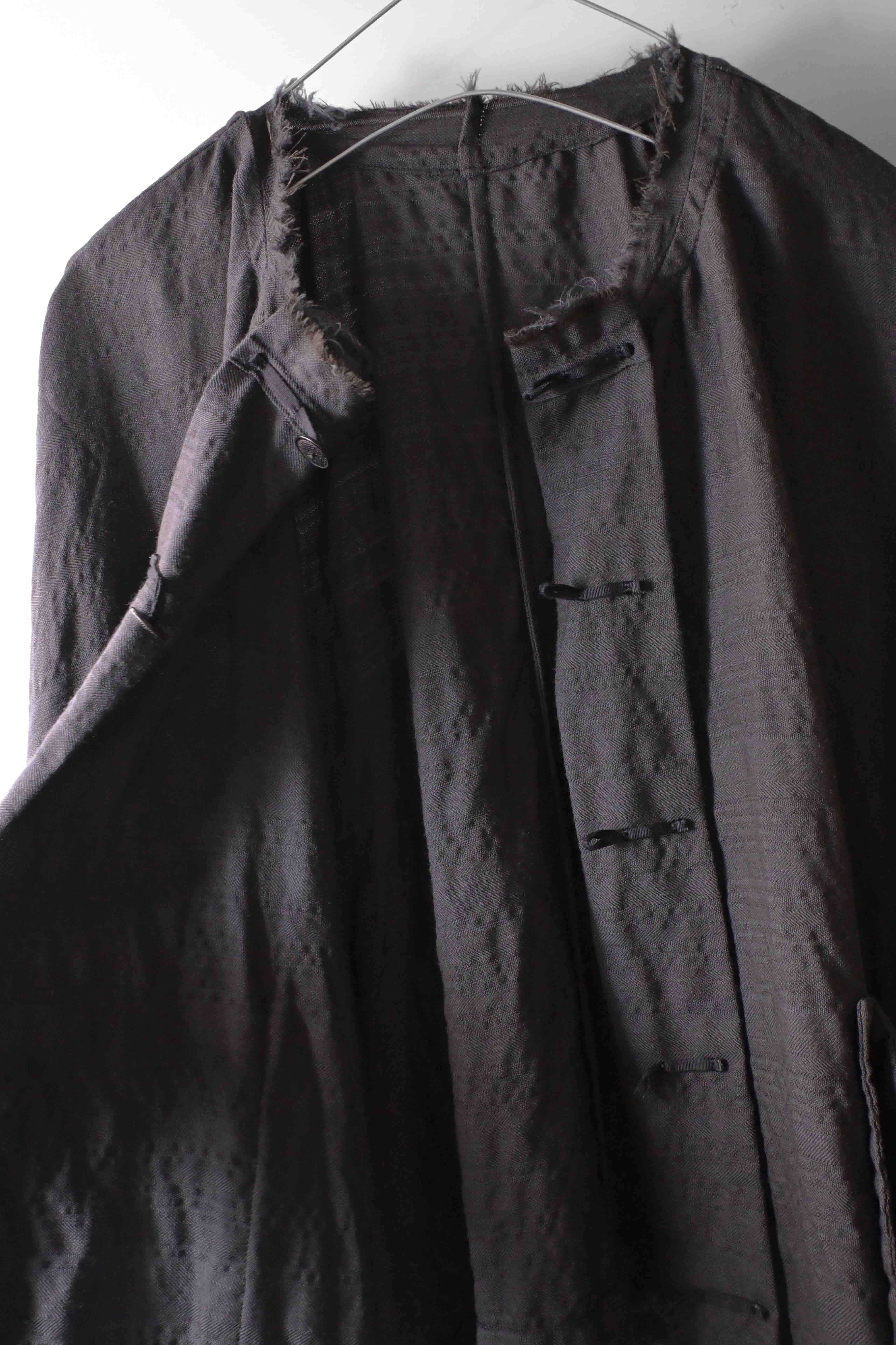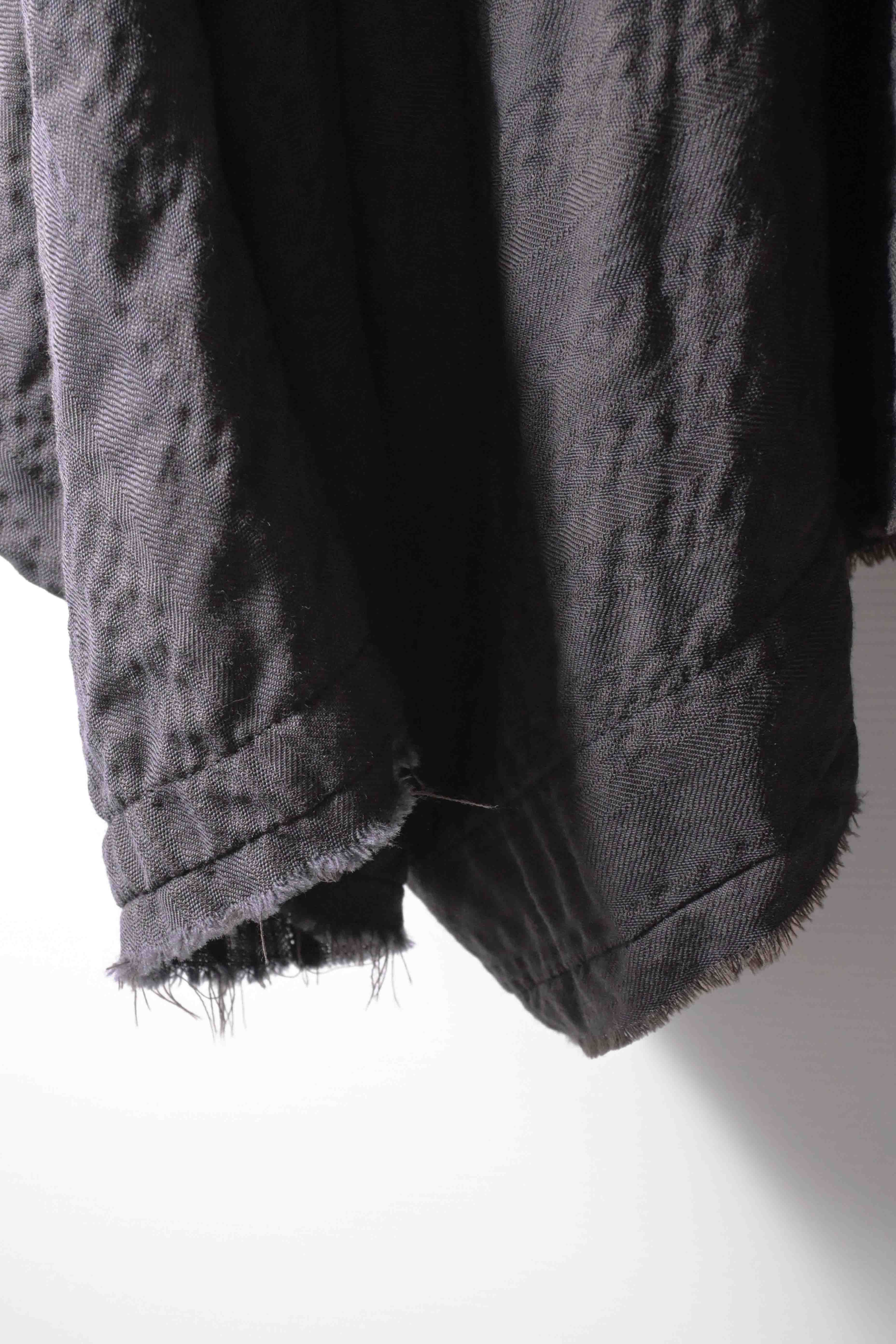 This super limited edition GBS Evolution IX.2 EV9WJ03 handmade jacket design is the only piece of its kind made by hand in the entire world. It was created exclusively from our original modified dolman sleeved wide body Asian historical jacket pattern from our extensive tailoring research, and cut using an elegant lightweight 100% pure wool broken herringbone weave luxury suiting fabric woven only for us by the world's leading research fabric maker---Luigi Parisotto in Sarcedo, Vicenza Italy---then specially dyed by hand in our world-famous GBS Superworkrooms at Cavarzere Venezia using a process that required over 15 hours of expert work to achieve its unique colors, patina effects, shaping, drape and incredible softness. The stunning design features an advanced wide body asiatic silhouette with dolman sleeve styling, handcut oversized fully-self-lined pockets, real single-needle tailored double-stitched seaming throughout the garment performed by a single-needle sewing machine authentic to the period (that takes more than twice as long to create the garment than using typical double-needle equipment), and a first in the industry technique method on bodice and sleeve hems of specially pleated and stitched fabric seaming performed entirely using expert single-needle tailoring with taglio-vivo hemwork that provides greatly increased protection and resistance to fabric unraveling versus normal unfinished taglio-vivo applications, impeccable clean-finished interior construction, and an exquisitely elegant new interpretation of the classic tángzhuāng knotted front closure system using extensive handstitched and hand dyed pure silk grosgrain woven tapes and gorgeous artisan-made incision-cut real horn button designs made only for us by the world’s greatest living buttonmakers—Claudio and Cinzia Fontana in Parma, Italy. all entirely handstitched in pure silk Bozzolo Reale Milano Seta threads (which required at least 25 minutes to create each closure assembly). The piece also features our world leading pure silk hand dyed label created exclusively for us by Mion SpA in Torreglia which is the first label in the luxury industry to completely eliminate plastic polyester yarns in it—also beautifully attached entirely by hand using pure silk threads. Variations in color and color density are not imperfections or irregularities, but specific characteristics of the special fabric, hand dyeing processes, and hand making technique.