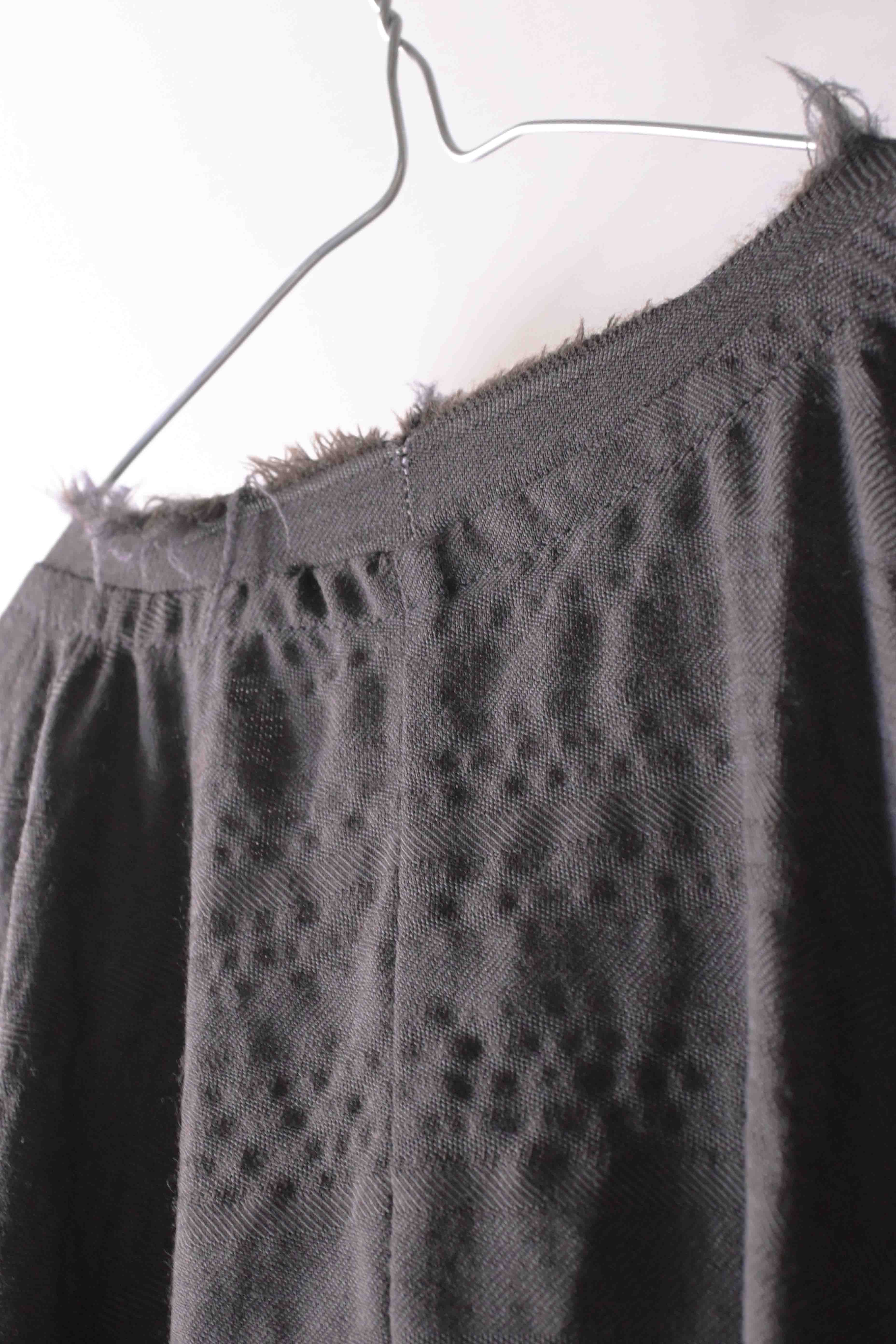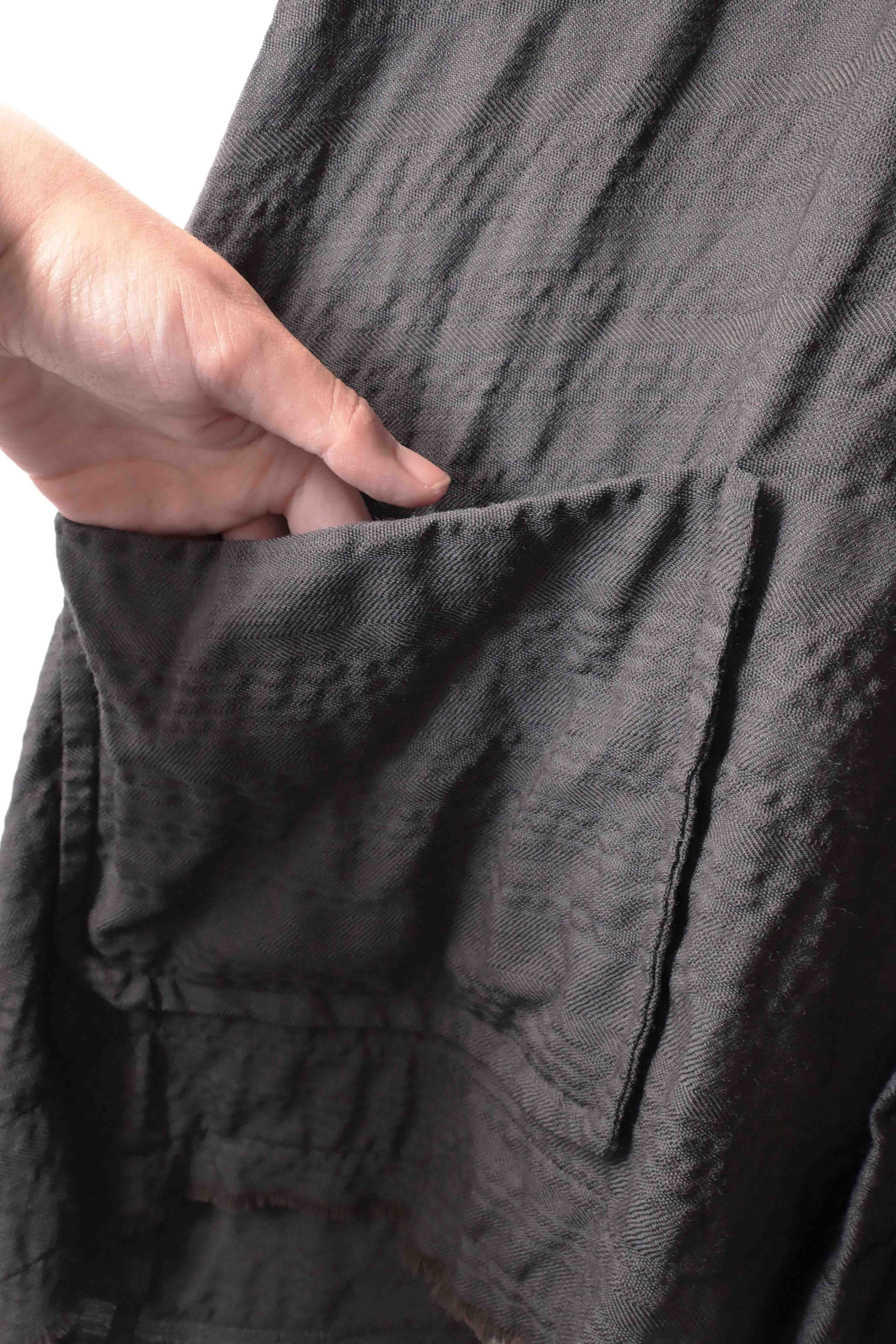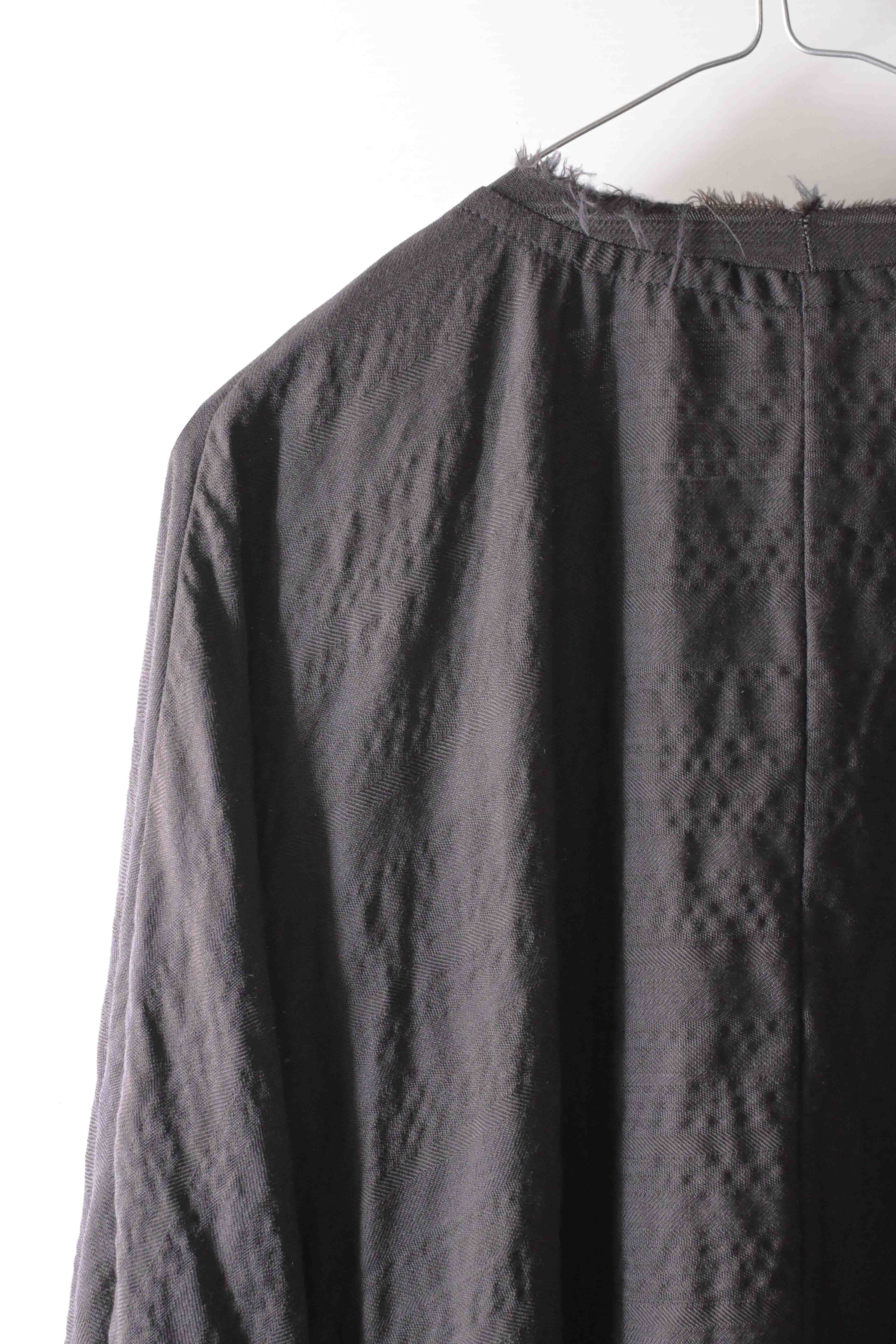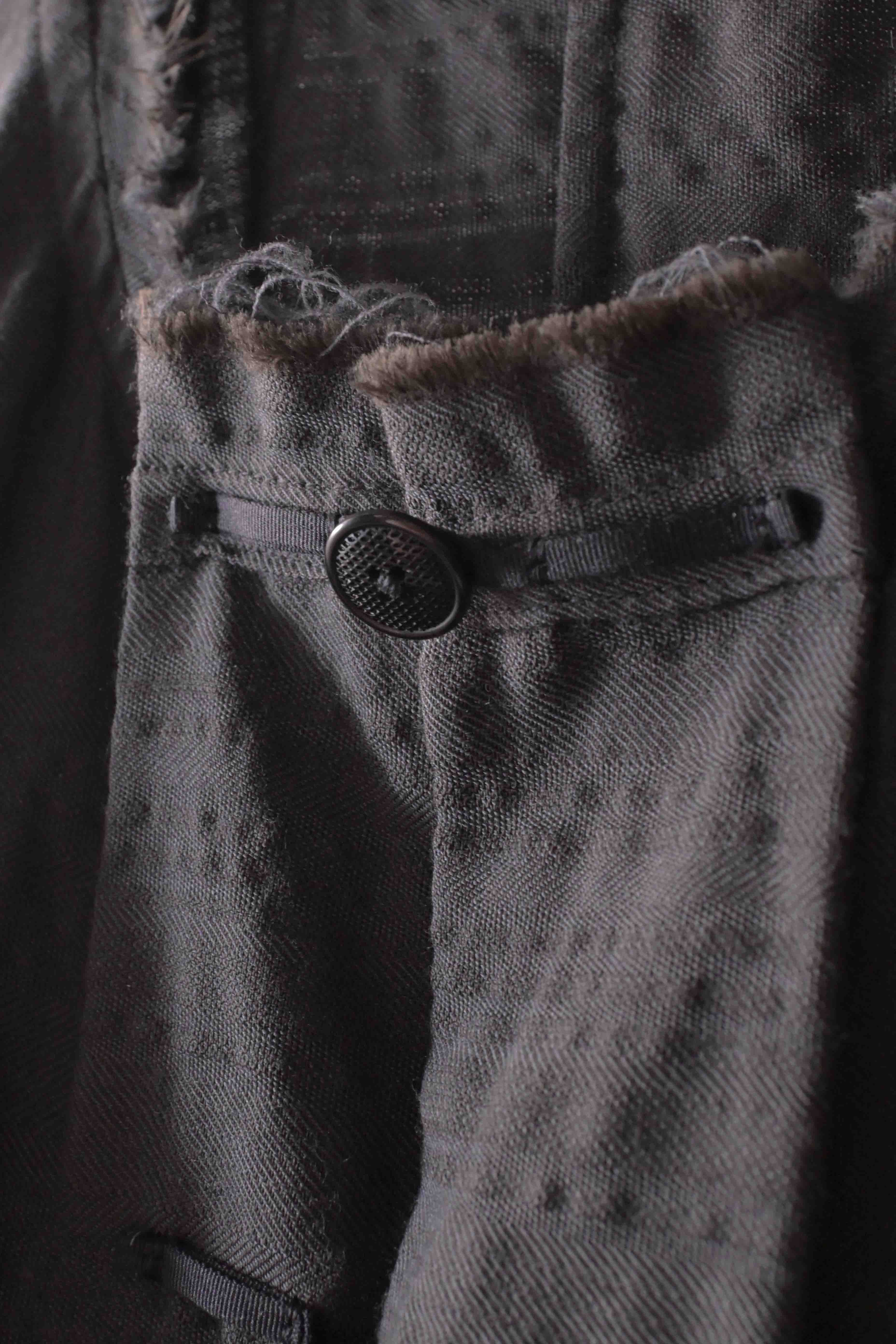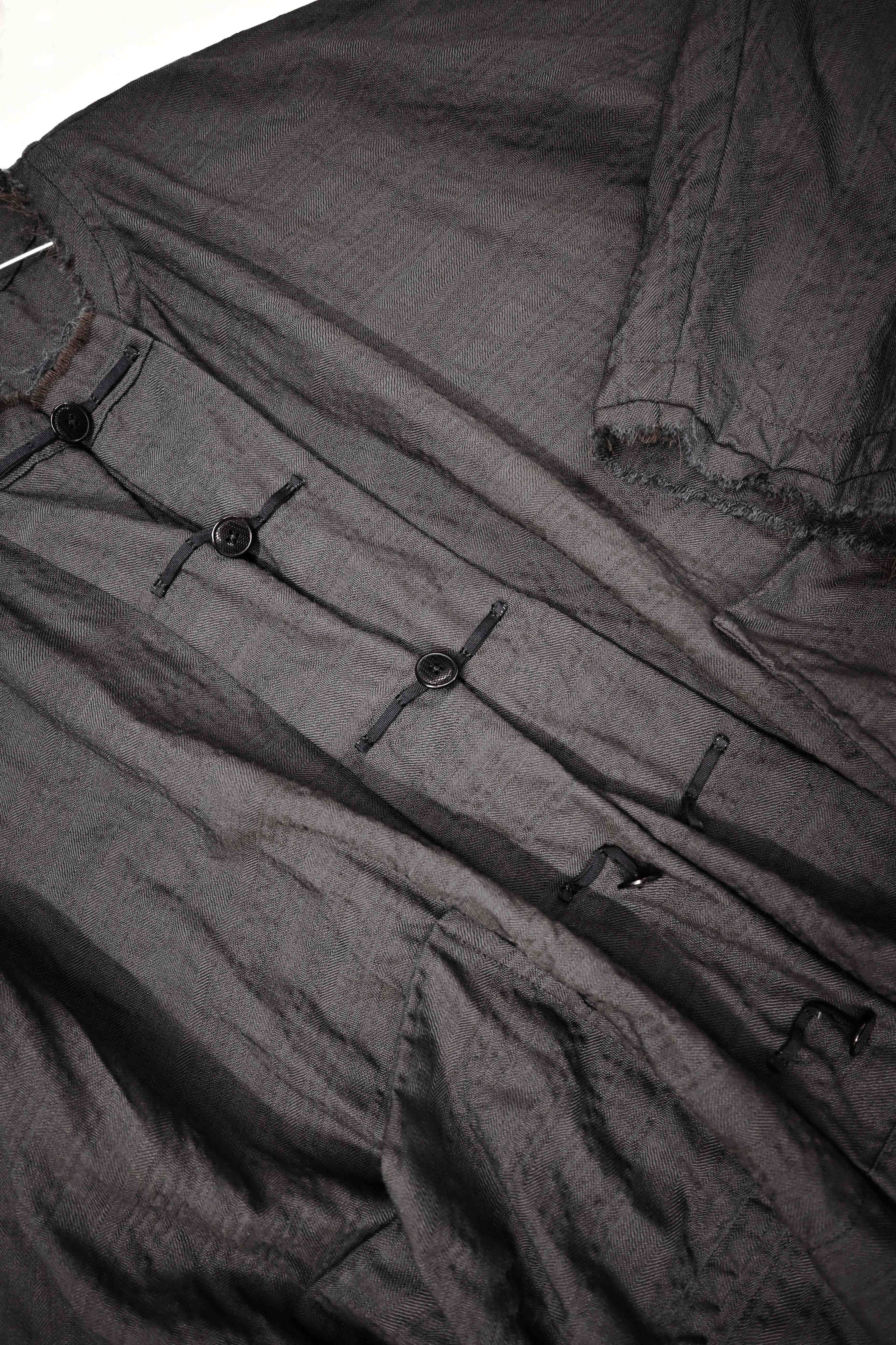 This super limited edition GBS Evolution IX.2 EV9WJ03 handmade jacket design is the only piece of its kind made by hand in the entire world. It was created exclusively from our original modified dolman sleeved wide body Asian historical jacket pattern from our extensive tailoring research, and cut using an elegant lightweight 100% pure wool broken herringbone weave luxury suiting fabric woven only for us by the world's leading research fabric maker---Luigi Parisotto in Sarcedo, Vicenza Italy---then specially dyed by hand in our world-famous GBS Superworkrooms at Cavarzere Venezia using a process that required over 15 hours of expert work to achieve its unique colors, patina effects, shaping, drape and incredible softness. The stunning design features an advanced wide body asiatic silhouette with dolman sleeve styling, handcut oversized fully-self-lined pockets, real single-needle tailored double-stitched seaming throughout the garment performed by a single-needle sewing machine authentic to the period (that takes more than twice as long to create the garment than using typical double-needle equipment), and a first in the industry technique method on bodice and sleeve hems of specially pleated and stitched fabric seaming performed entirely using expert single-needle tailoring with taglio-vivo hemwork that provides greatly increased protection and resistance to fabric unraveling versus normal unfinished taglio-vivo applications, impeccable clean-finished interior construction, and an exquisitely elegant new interpretation of the classic tángzhuāng knotted front closure system using extensive handstitched and hand dyed pure silk grosgrain woven tapes and gorgeous artisan-made incision-cut real horn button designs made only for us by the world’s greatest living buttonmakers—Claudio and Cinzia Fontana in Parma, Italy. all entirely handstitched in pure silk Bozzolo Reale Milano Seta threads (which required at least 25 minutes to create each closure assembly). The piece also features our world leading pure silk hand dyed label created exclusively for us by Mion SpA in Torreglia which is the first label in the luxury industry to completely eliminate plastic polyester yarns in it—also beautifully attached entirely by hand using pure silk threads. Variations in color and color density are not imperfections or irregularities, but specific characteristics of the special fabric, hand dyeing processes, and hand making technique.