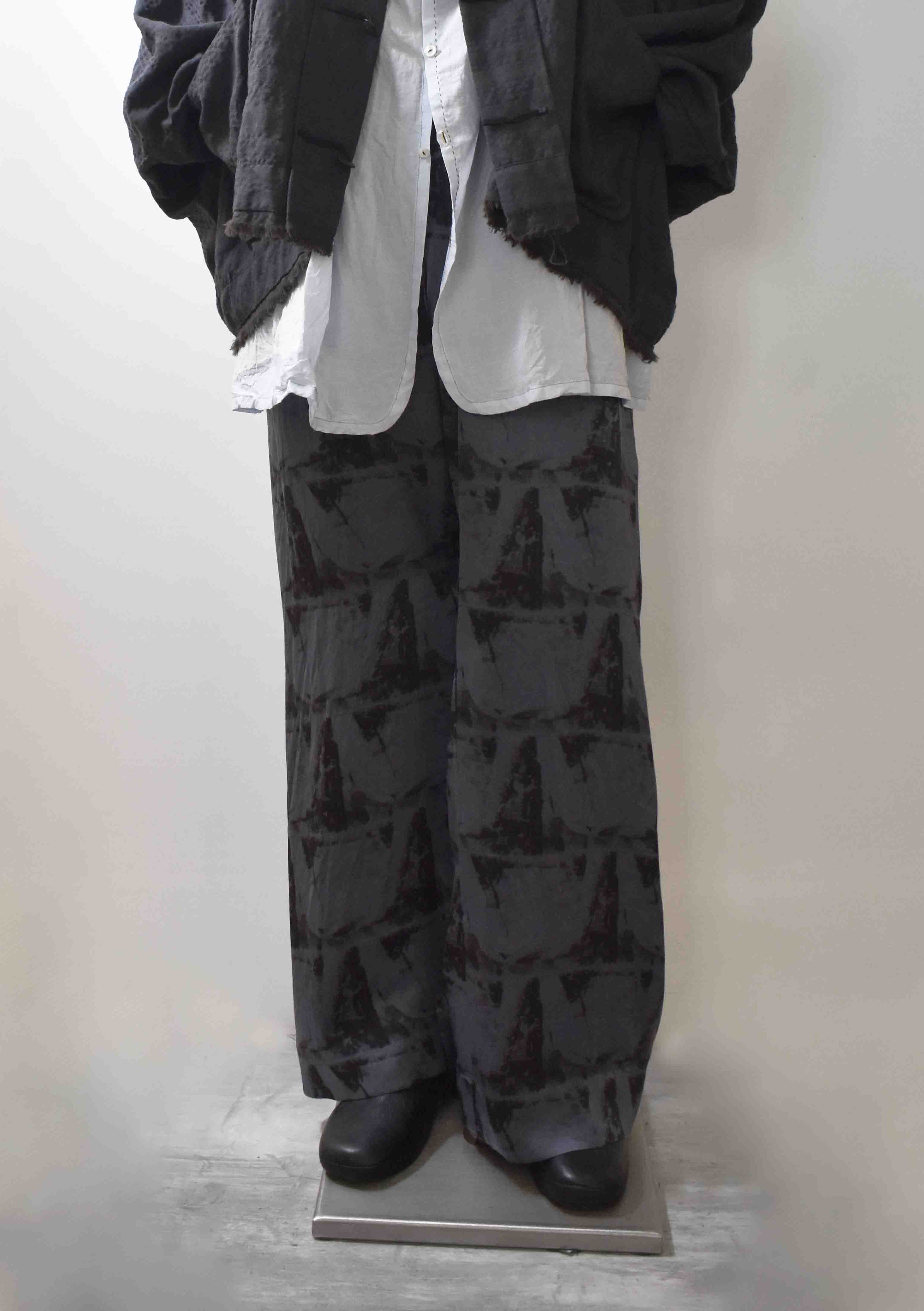 CUT from hand dyed 100% pure Como silk 16-momme satin raso exclusive LAS "hands & leaves" print, this relaxed dress drawstring waist leisure trouser is the perfect exclusive trousers to pair with this unique jacket.