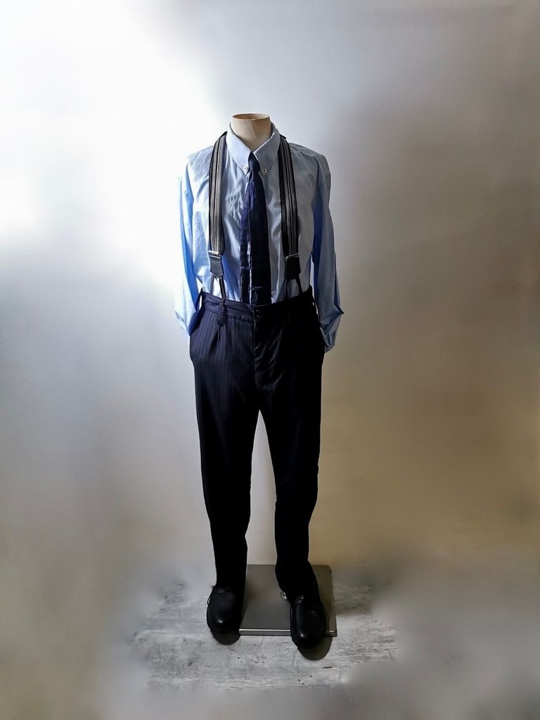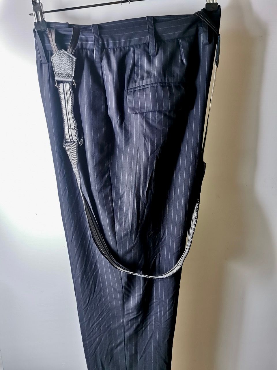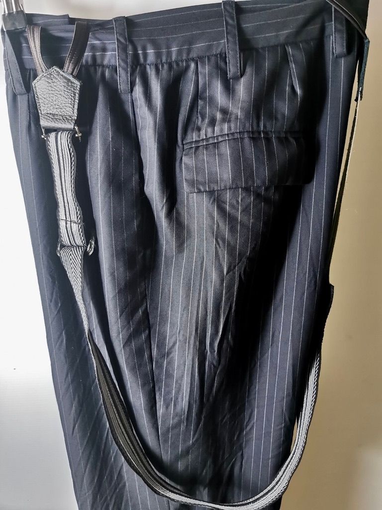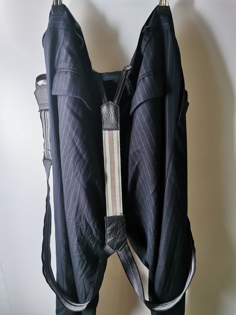 The special handmade trousers also feature a classic darted front design with impeccable handbuilt hidden-button fly front construction, handcut rear besom flap pockets, beautifully clean-finished fully-lined interior with Italian satin taped seam construction, real hand cut vintage recycle garment leather suspenders using special silk, cotton and wool trim tapes woven specially for us by the reknowned Nastrificio Victor mills in Piove di Sacco Padova...