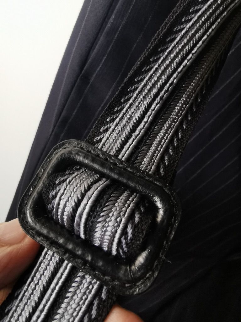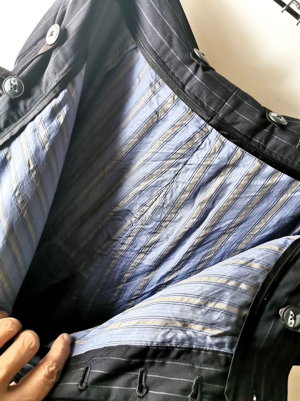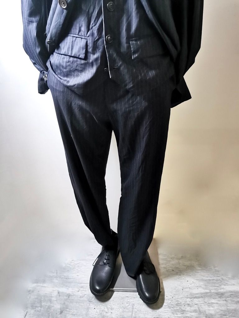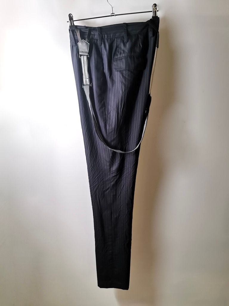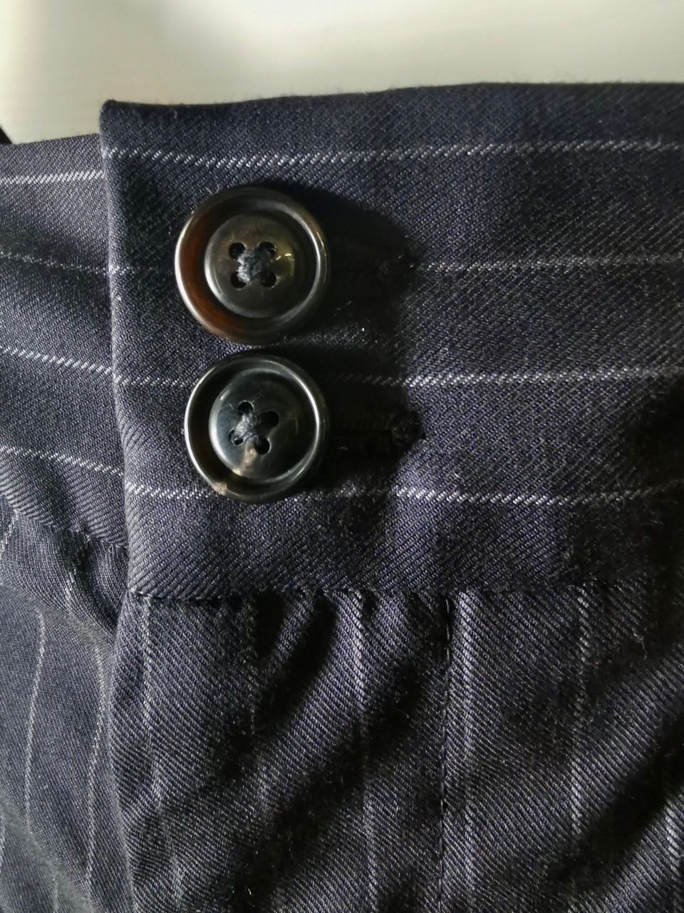 The special handmade trousers also feature a classic darted front design with impeccable handbuilt hidden-button fly front construction, handcut rear besom flap pockets, beautifully clean-finished fully-lined interior with Italian satin taped seam construction, real hand cut vintage recycle garment leather suspenders using special silk, cotton and wool trim tapes woven specially for us by the reknowned Nastrificio Victor mills in Piove di Sacco Padova...