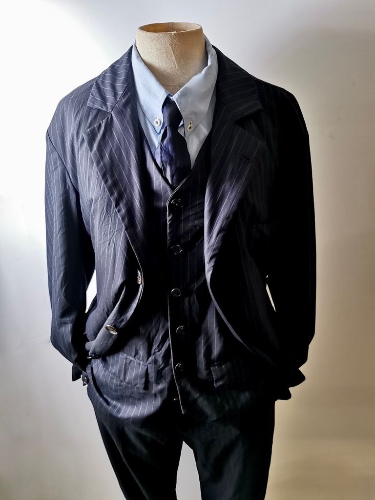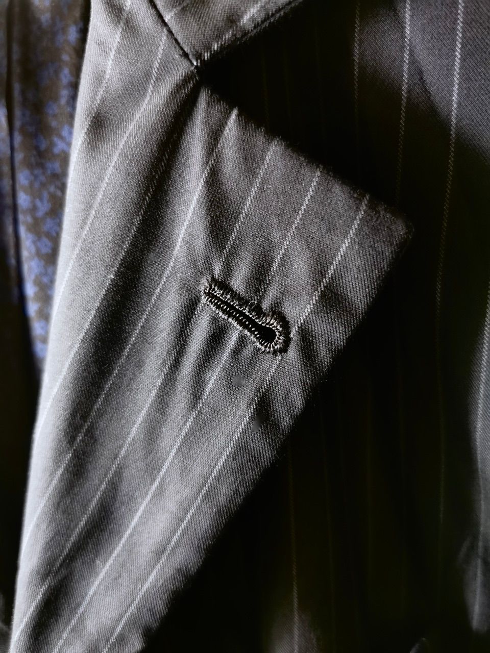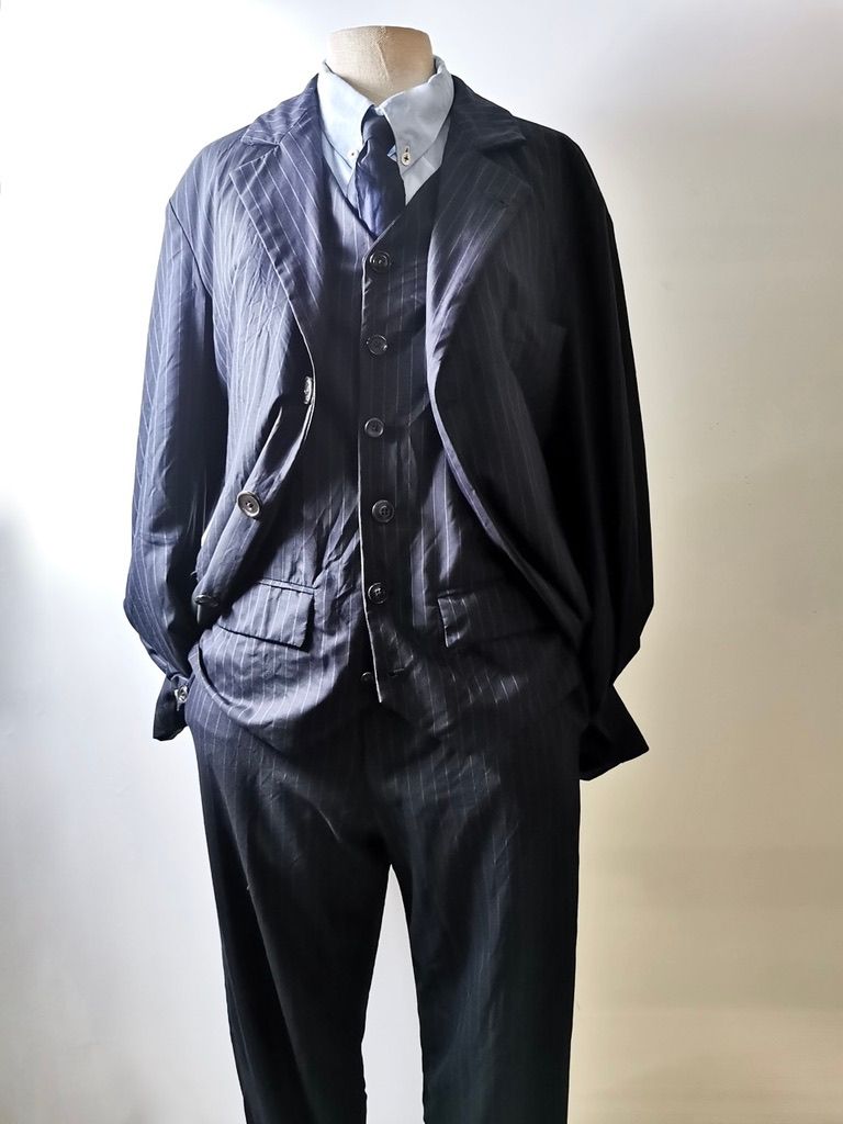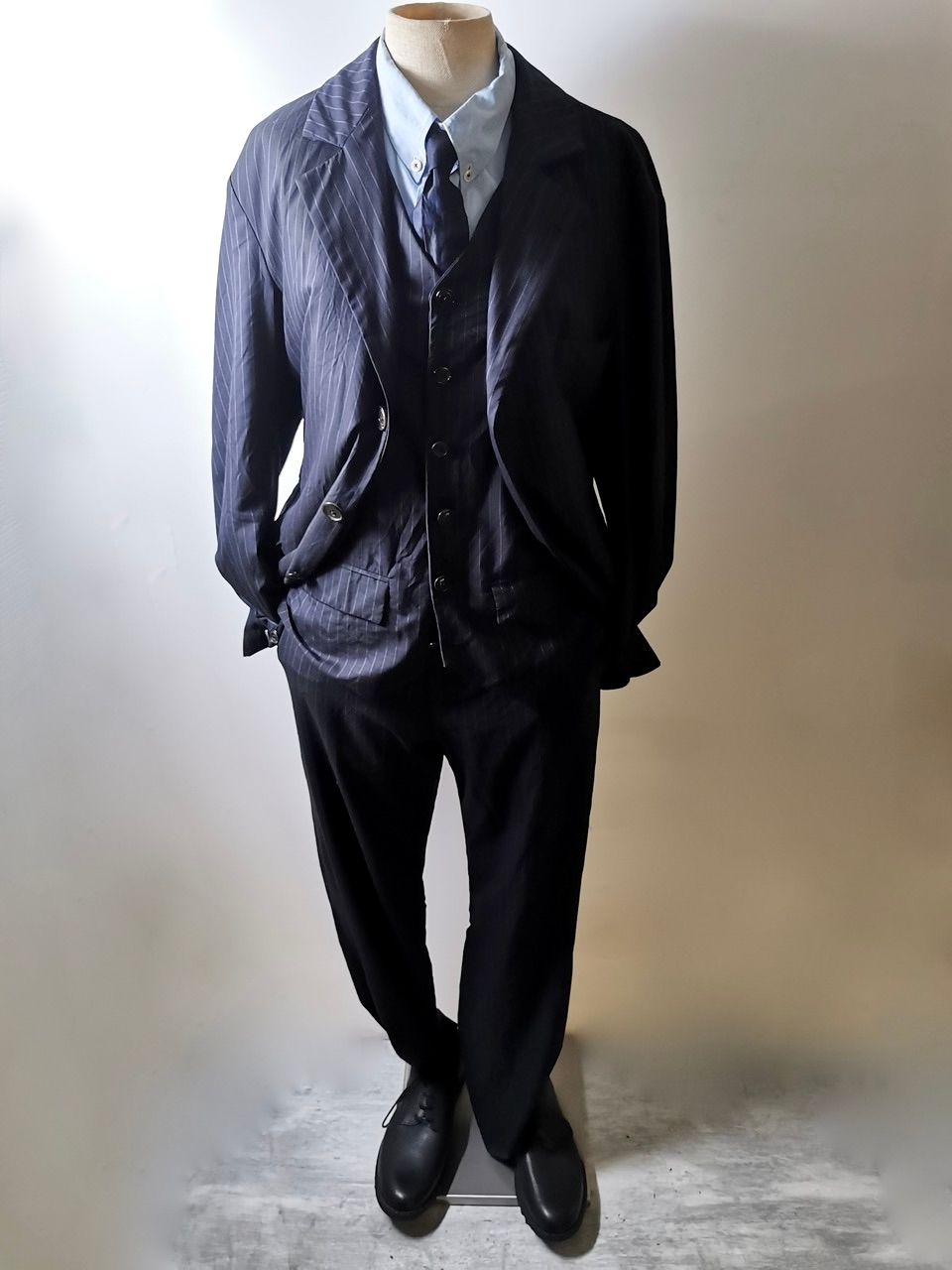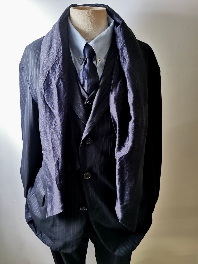 The special jacket, waistcoat, scarf and trouser design represents the world’s cutting edge of extreme handmade clothes-making technology and features very special old-fashioned canvas horsehair front and collar interfacings totally hand-padstitched with over 1000 invisible hand stitches inside to give it its remarkable natural roll line along lapels and collar...