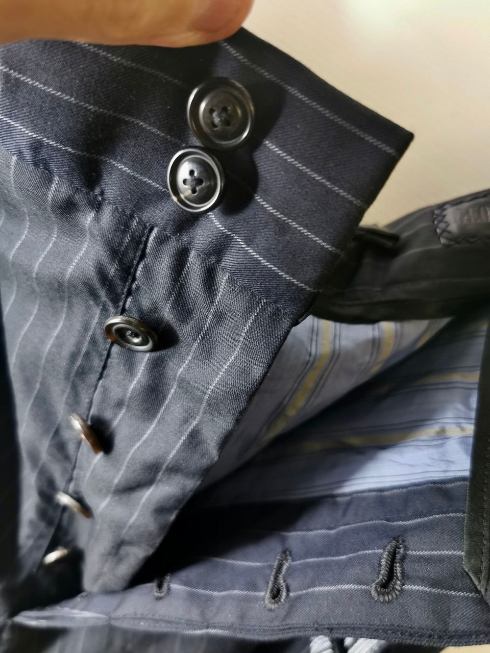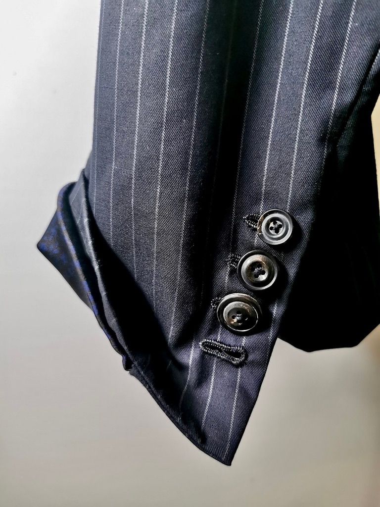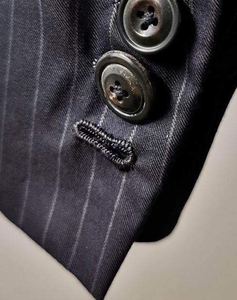The suit comes with no less than 24 of our signature real hand-stitched buttonholes (that required at least 12-15 minutes to create each one—a full day of painstaking master work just to make the buttonholes for the single suit) in luxurious pure silk Bozzolo Reale Milano Seta threads, which cost over 1.40 euros for a single meter of thread. And each of the 30 buttons deployed for the suit was completely sewn on by hand using our GBS exclusive technique which required an average of 2-3 minutes to attach each button (well over an hour of expert work just to attach the buttons on the single suit) and only sustainable pure cotton (no polyester, no plastics) high density Italian 3 stelle brand threads for extra strength and the smooth, secure opening and closing that you only experience when you put on a GBS...