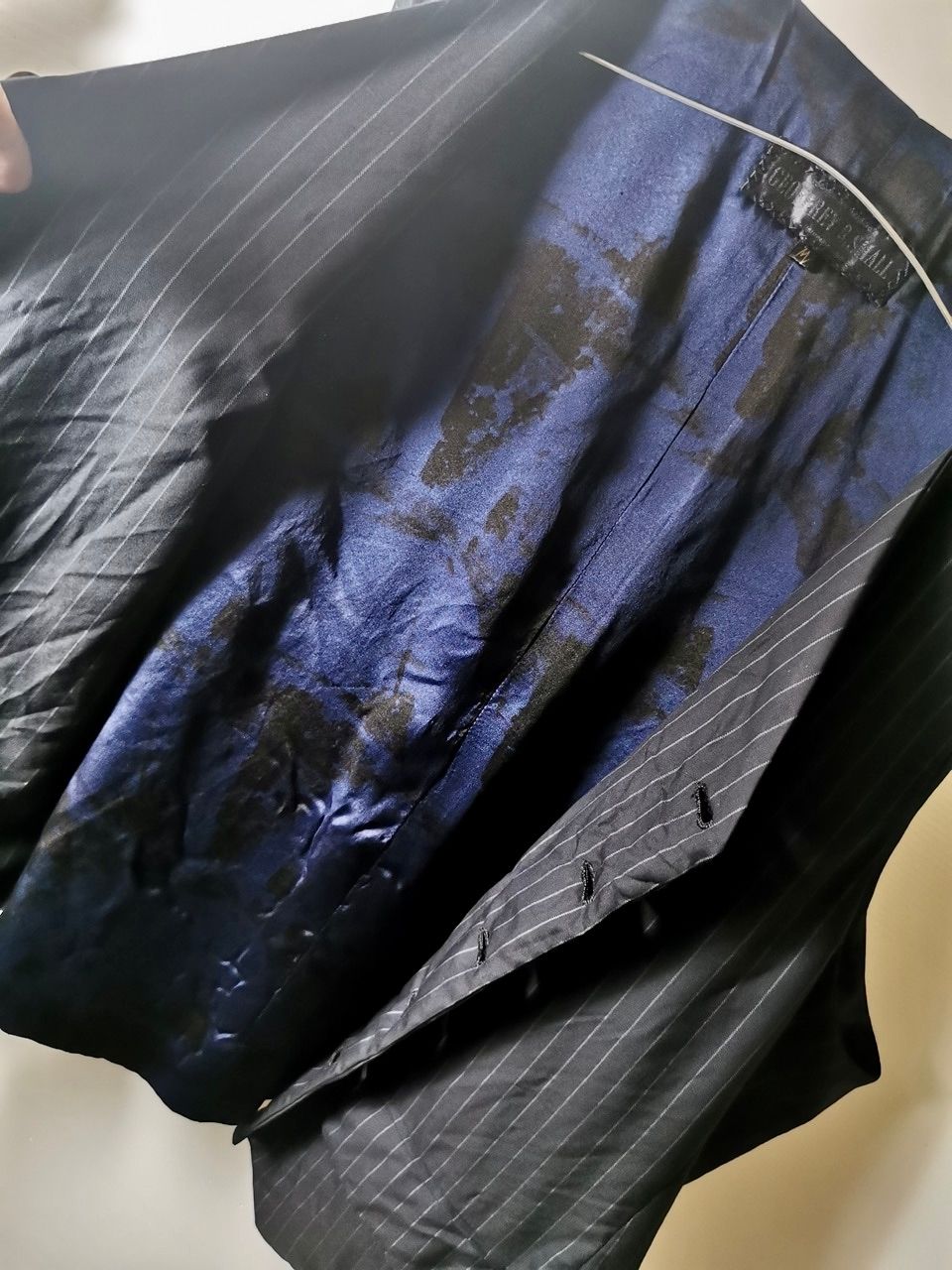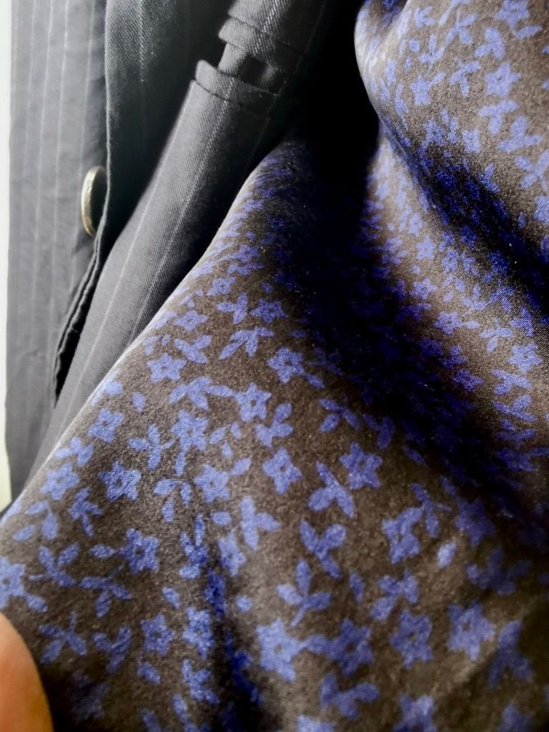 ...and combined with an exquisite pure silk 16 momme raso satin floral and abstract design combination print lining story for the jacket, waistcoat and scarf made only for us by the legendary Brenna family in Como, Italy--the world's leading center for fine silk fabric creation--along with a pure cupro deluxe Bemberg-type striped yarn-dyed weave luxury linings for the trouser for maximum lightness, comfort and long-term wear (trousers normally wear out before jackets and vests during the lifetime of a suit particulary in the seat due to wallet use of the pockets and general wear and tear movment--the correct linings can help prolong the trouser's life by protecting the seat and wearing our first before the exterior cloth and can then be replaced with a new lining to further protect the trouser for more time). Each of the pieces were then specially mutliple hand-dyed in our world-famous GBS Superworkrooms at Cavarzere Venezia using a series of processes that required over 29 hours of master work to achieve their special colors, patina effects, shaping, and incredible softness and drape...
