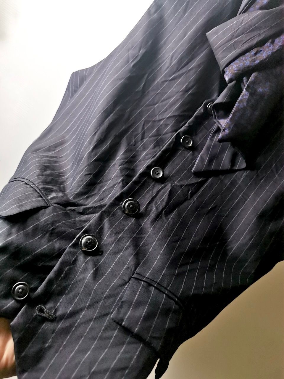 THIS special version of the extreme limited edition EVJ01 handmade 4-piece supersuit design is the only one of its kind made in the entire world. It was created exclusively by hand from a phenomenal hyperlux ultrasoft Super 210’s “Arcadia” 13-micron pure wool suiting cloth woven by the oldest woolen mill in the world and the world’s most respected cashmere and fine wool fabric maker- Fratelli Piacenza 1733 Spa in Pollone Biella, Italy- and combined with an exquisite pure silk 16 momme raso satin floral and abstract design combination print lining story made only for us by the legendary Brenna family in Como, Italy--the world's leading center for fine silk fabric creation-- and then specially mutliple hand-dyed in our world-famous GBS Superworkrooms at Cavarzere Venezia using a series of processes that required over 29 hours of master work to achieve its special colors, patina effects, shaping, and incredible softness and drape. The special jacket, waistcoat, scarf and trouser design represents the world’s cutting edge of extreme handmade clothes-making technology and features very special old-fashioned canvas horsehair front and collar interfacings totally hand-padstitched with over 1000 invisible hand stitches inside to give it its remarkable natural roll line along lapels and collar, real working buttonhole surgeon’s sleeve cuffs, hand-cut besom, flap and welt pockets inside and out, generous 2,5 centimeter seam allowances on major fitting seams that allow the piece to be altered and let out a full size larger than its original cut, a remarkable composition story of real horn button designs made exclusively for us by the world’s greatest living buttonmakers- Claudio and Cinzia Fontana in Parma, Italy, and no less than 24 of our signature hand-stitched buttonholes in pure silk Bozzolo Reale Milano Seta threads (which required at least 12-15 minutes to create each one on the challenging handwoven fabric). A full day of expert work was needed for the creation of the buttonholes alone. The pieces also features our world leading hand dyed pure silk label created exclusively for us by Mion SpA in Torreglia- the first label in the luxury industry to completely eliminate plastic polyester yarns in it--beautifully attached by all hand using pure silk threads and handsigned and numbered by the designer.