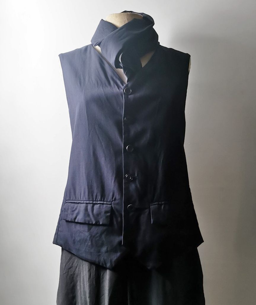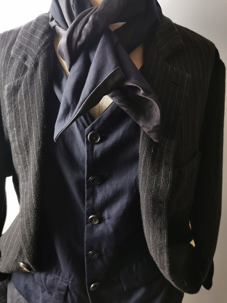 The EVJ02 waistcoat and scarf set design was created from a modified historical 19th century single-breasted six-button front 2-pocket waistcoat and unique trapezoid scarf pattern from our extensive tailoring research...