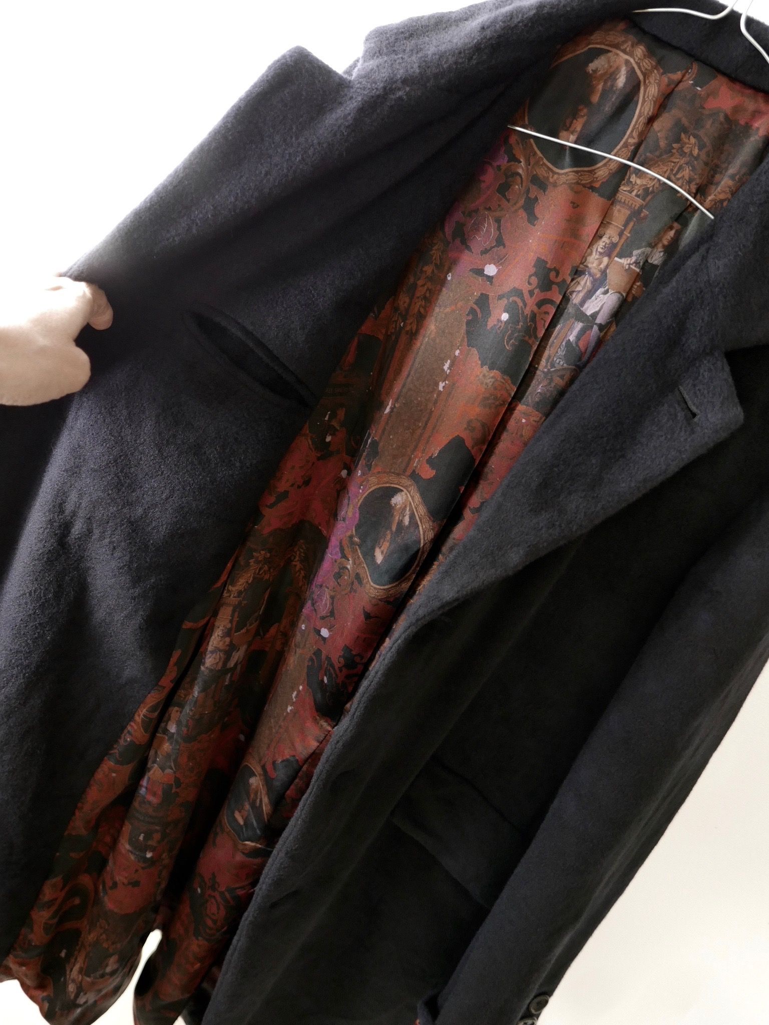 THIS special version of the super limited edition GRC08 long coat design is currently the only piece of its kind made by hand in the entire world. It was created exclusively from our original 3-button notch-lapel coat pattern from our extensive tailoring research and cut by hand using a superlux, supersoft 540 gram 3-ply Alashan pure cashmere coating cloth woven in Pollone Biella, Italy by the oldest woolen mill and most respected cashmere fabric makers in the world-Fratelli Piacenza 1733 Spa, fully-lined with a luxury lining story in an exclusive pure 16-momme silk raso Darkland’s Anton Von Werner print lining created for us by the legendary Brenna family in Como, the world’s leading silk production region, which was individually hand accident dyed in our studios using a special process that took over 8 hours for the silk to achieve its unique colors, patina effects and softness. The piece was then specially hand dyed,washed and treated in our workrooms at Cavarzere Venezia using an intricate series of processes which required another 12 hours of painstaking expert work to achieve its beautiful colors, chiaroscuro patina effects, shaping and softness. The design features real working surgeon's cuffs with handsewn buttonholes, all hand cut and built welt and besom pockets throughout the garment each lined with the very expensive self-fabric 3-ply cashmere cloth for supreme comfort, security and durability; all handsewn hem constructions and generous 2,5 cm seam allowances on all major fitting seams to allow for ample alterations capability, impeccable real horn buttons made exclusively for us by the greatest living buttonmakers in the world- Claudio and Cinzia Fontana in Parma, and no less than ten of our signature real hand stitched buttonholes (each one requires 8-10 minutes to cut and sew) in pure silk Bozzolo Reale Milano Seta thread… and is handsigned and numbered by the designer. The piece also features our world leading pure silk natural hand dyed label created exclusively for us by Mion SpA in Torreglia which is the first label in the luxury industry to completely eliminate plastic polyester yarns in it, and comes with a matching undyed pure silk deluxe GBS handmade triple filtration tailor's respiratory community mask as standard equipment for ongoing Covid-19 pandemic protection wear. Variations in color and color density are not imperfections or irregularities, but specific characteristics of the special fabric, and hand making technique. Please treat buttons and buttonholes with extreme care. We recommend professional cleaning or hand wash in cold water and protect buttons with foil or plastic wrap when washing. Do not wash with other items. Do not put in washer or dryer.