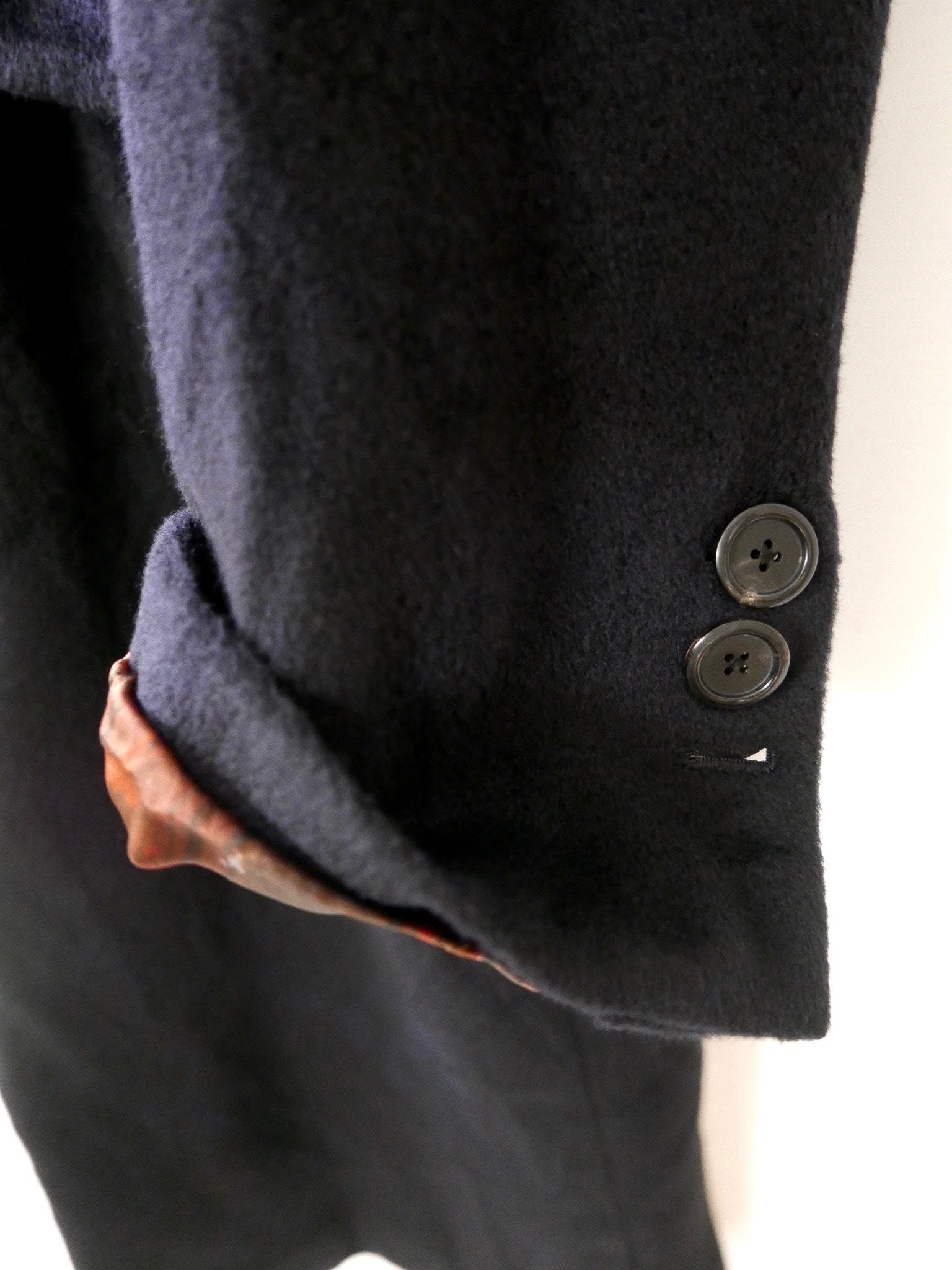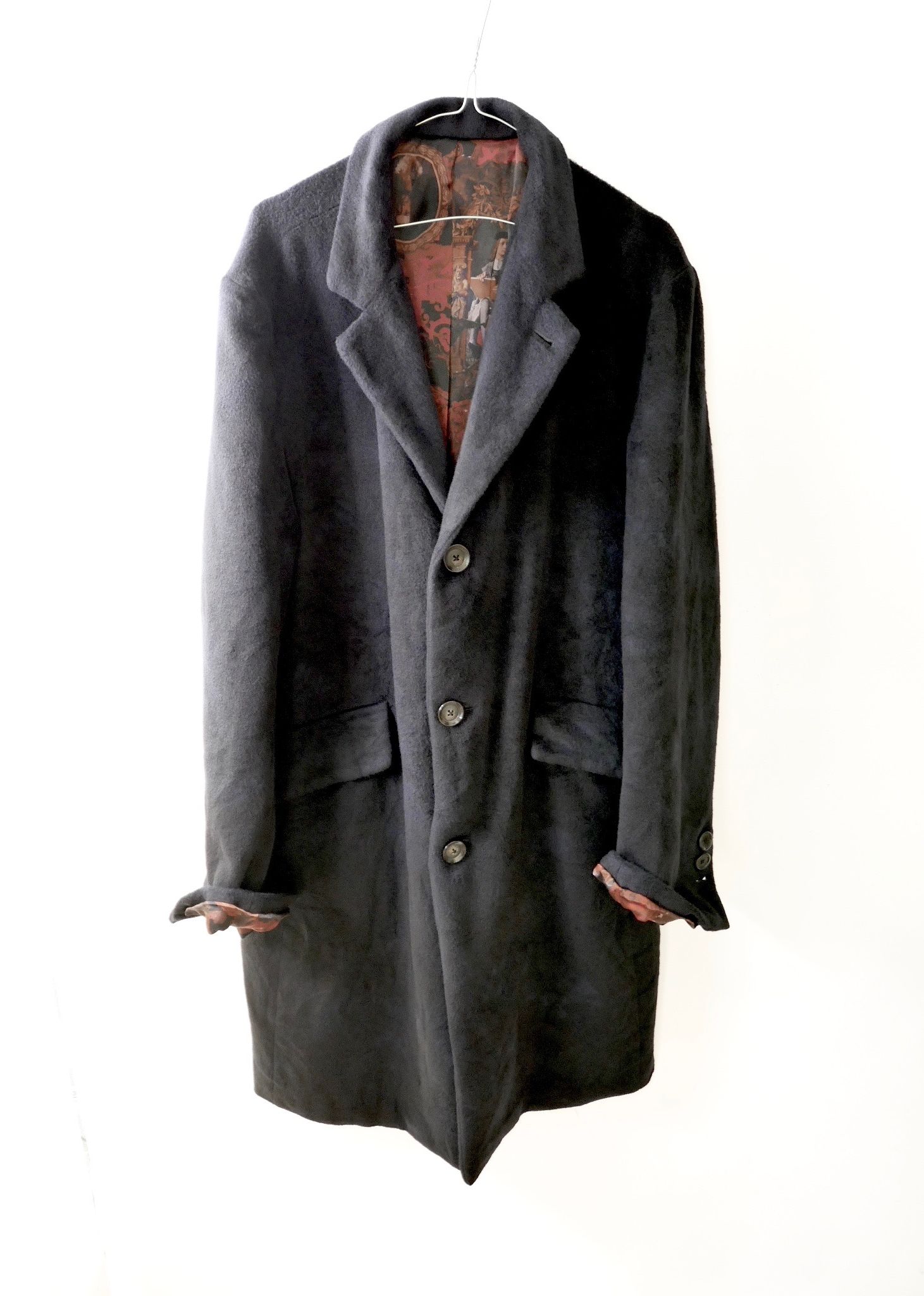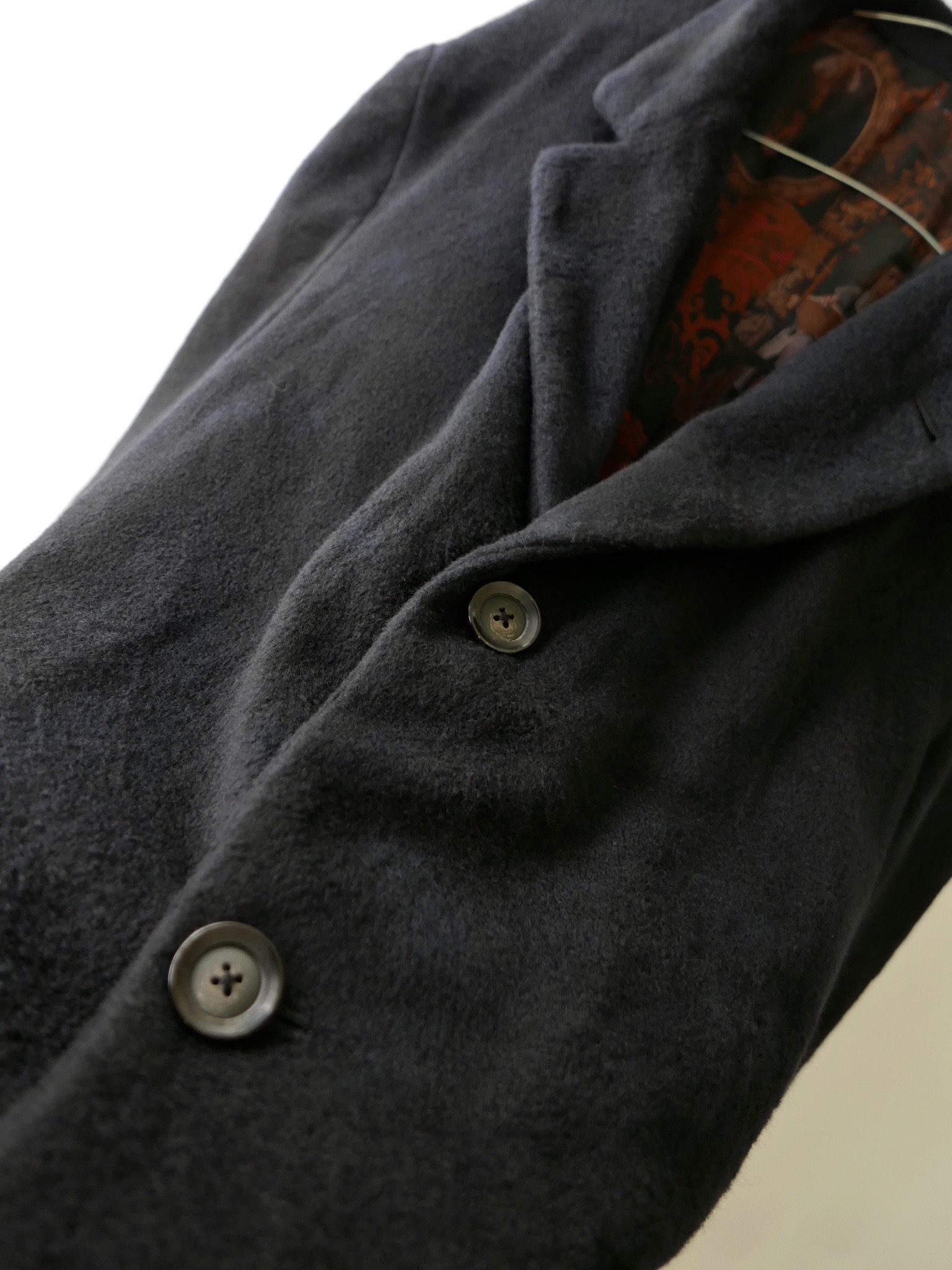 The special version of the super limited edition GRC08 long coat design is currently the only one of its kind made by hand in the entire world. It was created exclusively from our original 3-button notch-lapel coat pattern from our extensive tailoring research and cut by hand using a superlux, supersoft 540 gram 3-ply Alashan pure cashmere coating cloth woven in Pollone Biella, Italy, by the oldest woolen mill and most respected cashmere makers in the world, Fratelli Piacenza 1733 SpaThe piece was then specially hand dyed, washed and treated in our workrooms at Cavarzere Venezia using an intricate series of processes which required over 20 hours of painstaking expert work to achieve its beautiful colors, chiaroscuro patina effects, shaping and softness.