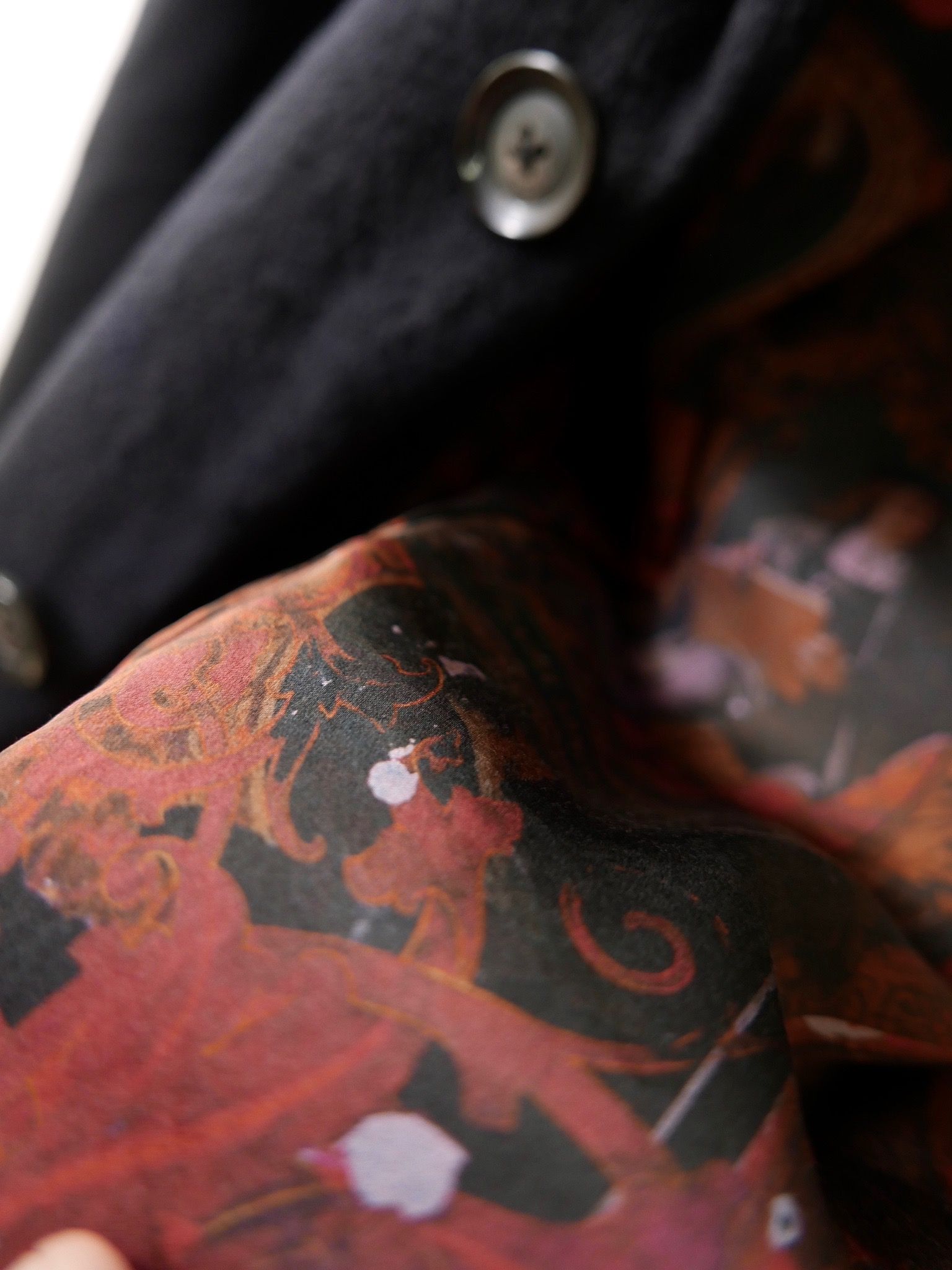 ...fully-lined with a superlux lining story in an exclusive pure 16-momme silk raso Darkland’s Anton Von Werner print lining created only for us by the legendary Brenna family in Como, the world’s leading silk production region, which was individually hand dyed in our world-famous GBS Superworkrooms using a special process that took over 8 hours of master work for the silk to achieve its unique colors, patina effects and softness...