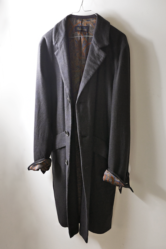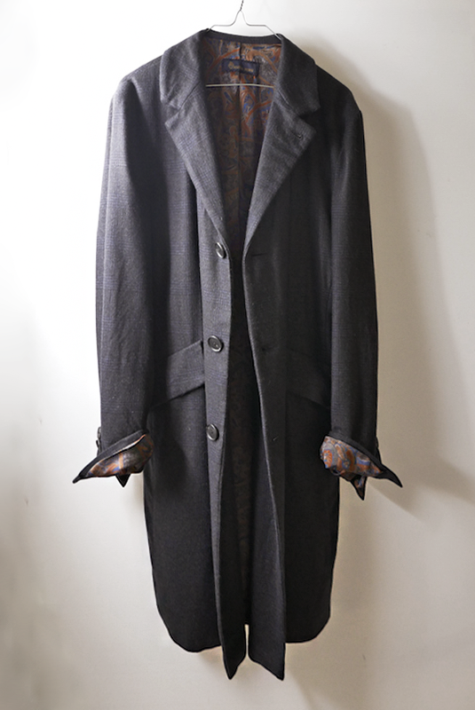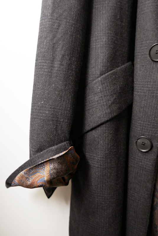 THIS very special GBS Evolution III version of the super limited edition GRC08 handmade topcoat design is one of only 3 pieces of its kind currently being made by hand in the entire world, each exclusively for Blue Mountain School in London. It was created from our original single-breasted 3-button notched-lapel classic long coat length pattern, from our extensive tailoring research, and cut using hyperlux “Cocoon” fully CITES certified 80 percent Baby Cashmere and 20 percent Peruvian Vicunya 330 gram fabric woven in Pollone Biella, Italy, by the oldest woolen mill and most respected cashmere and fine wool fabric makers in the world- Fratelli Piacenza 1733 Spa... combined with a fully-lined luxury lining story in an exclusive pure 16-momme silk raso paisley print lining created for us by the legendary Brenna family in Como, the world’s leading silk production region, then specially hand dyed, washed and treated in our workrooms at Cavarzere Venezia using an intricate series of processes which required over 12 hours of painstaking expert work to achieve its beautiful colors, patina effects and softness. The design features real working handmade surgeon's cuffs, hand-cut besom welt and flap pockets and tailored center vent, expertly cut and sewn matched plaids, hidden lapel button which allows the coat to be buttoned all the way up for cooler weather or sportier styling, generous 2,5 centimeter seam allowances on major fitting seams that allow the jacket to be altered and let out a full size larger than its original cut, impeccably finished interior with handsewn hems and closures, remarkable new “Alessandro” design real horn buttons made for us in Parma, Italy by Claudio and Cinzia Fontana, the greatest living buttonmakers in the world today, and no less than 10 of our signature real hand-stitched buttonholes (that require 10-12 minutes to cut and sew each one) along with extensive handstitched detailing work on lapel, pockets and label all done in pure silk Bozzolo Reale Seta Milan thread. The piece also features our world leading pure silk hand dyed label created exclusively for us by Mion SpA in Torreglia which is the first label in the luxury industry to completely eliminate plastic polyester yarns in it--exquisitely attached entirely by hand using pure silk threads.