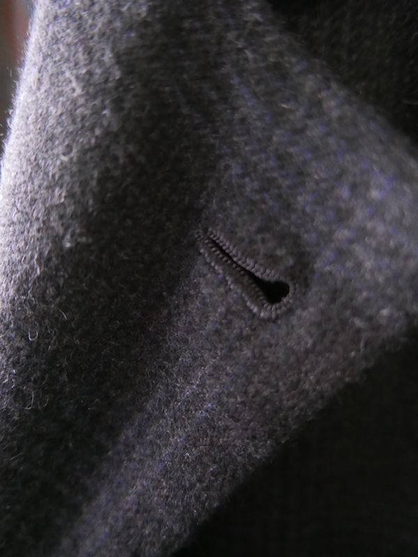 The design features very special old-fashioned canvas horsehair front and collar interfacings totally hand-padstitched with over 1000 invisible hand stitches inside to give it its remarkable natural roll line along lapels and collar; and real handmade working buttonhole surgeon's cuffs