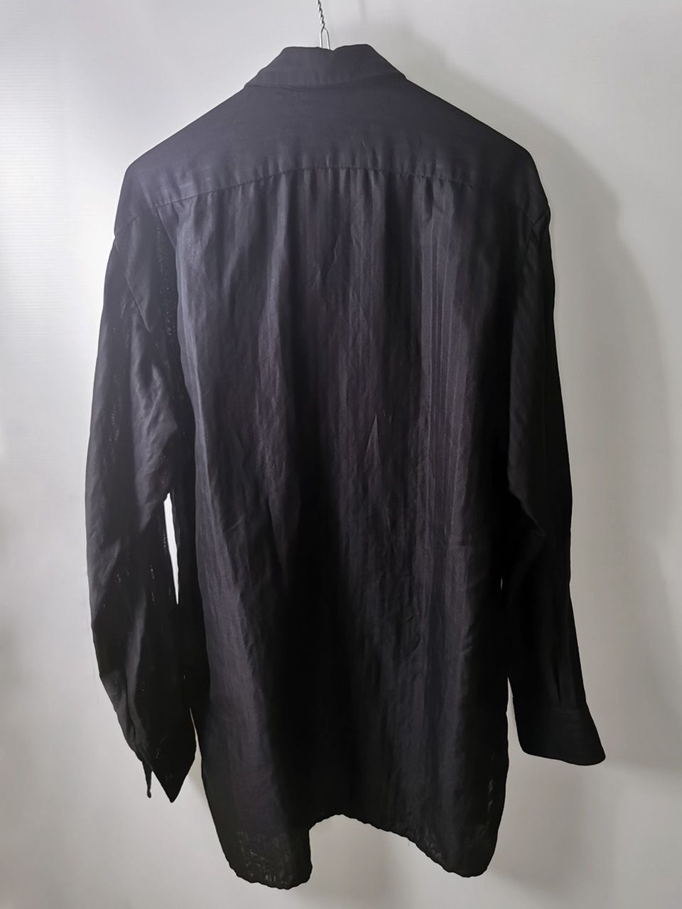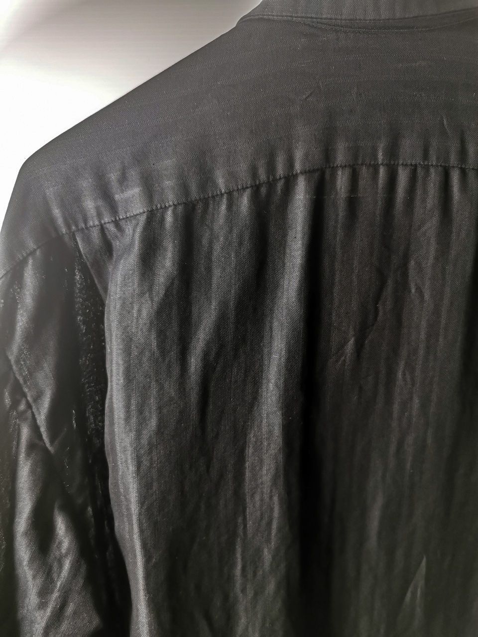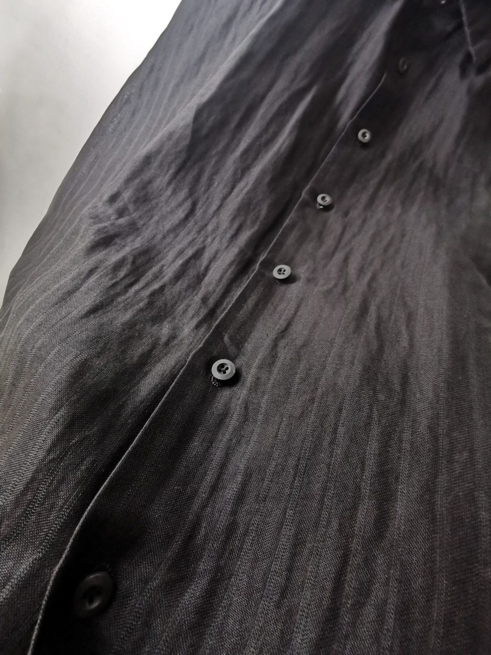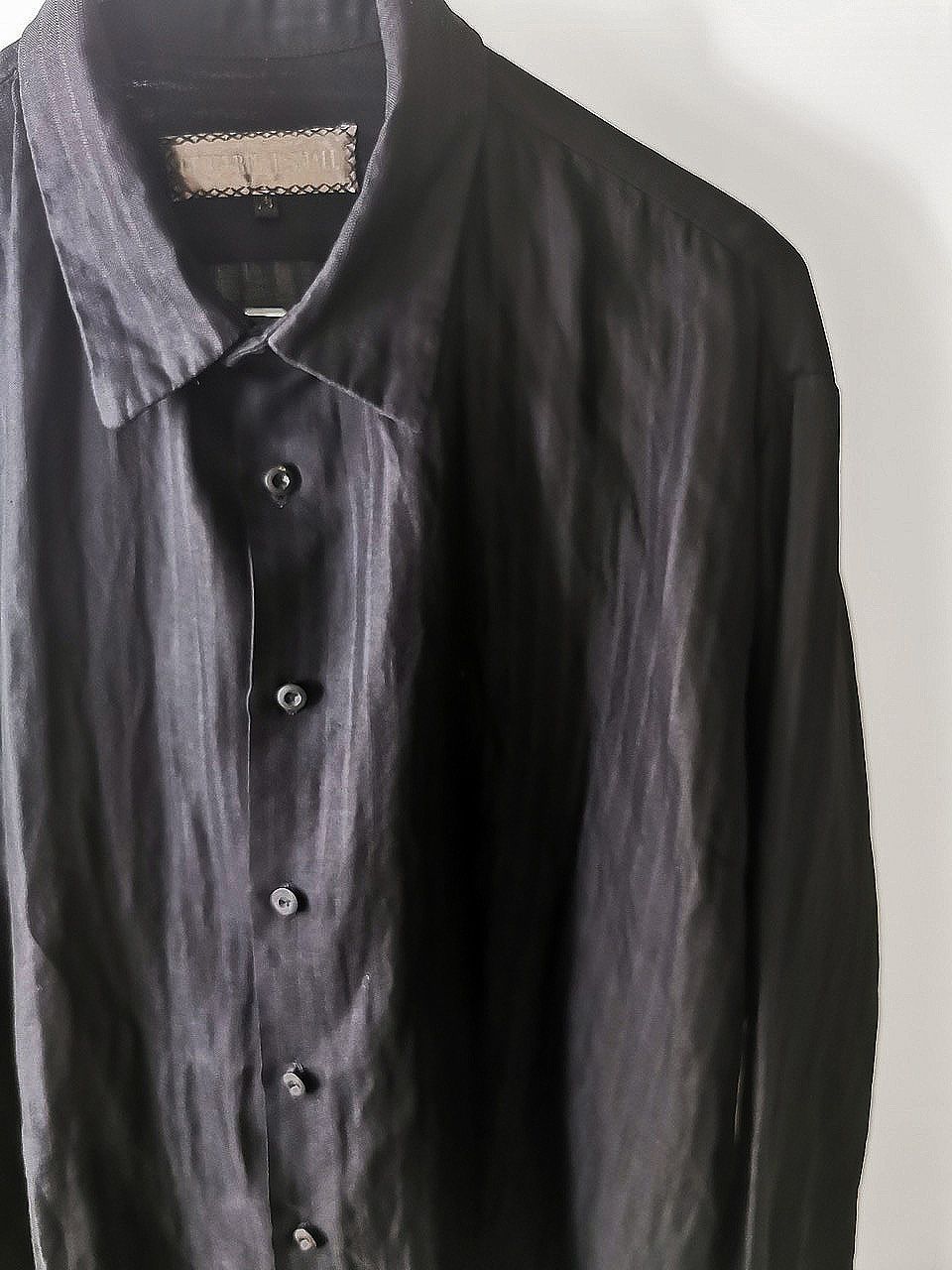 This special version of the super limited edition GRS08 shirt design is one of only 9 pieces of its kind made by hand in the entire world, each using a special Super 120’s double-twist “Bilbao” yarn-dyed textured stripe weave lightweight pure cotton luxury shirting made exclusively for us by the world’s leading research textile mill--Luigi Parisotto in Sarcedo Vicenza--then specially dyed by hand in our world-famous GBS Superworkrooms at Cavarzere Venezia using a process that required over 10 hours of expert work to achieve its unique dark color, patina effects, drape, shaping and softness. The design features an impeccable clean-finished French-seamed interior construction, uniquely balanced cut, fit and design, a new longer proportion shape from our medieval period research, real horn shirt button designs made for us by the world's greatest living buttonmakers--Claudio and Cinzia Fontana in Parma, Italy; and no less than 9 of our signature real hand sewn buttonholes in pure silk Bozzolo Milano Seta Reale threads, each one required 10-12 minutes to cut and sew- over 2 hours of painstaking expert work just to make the buttonholes alone for a single shirt). The piece also features our world leading hand dyed pure silk label created exclusively for us by Mion SpA in Torreglia which is the first label in the luxury industry to completely eliminate plastic polyester yarns in it--beautifully attached entirely by hand with pure silk threads.