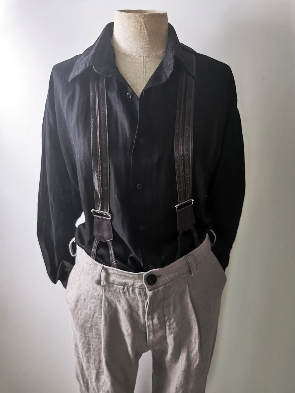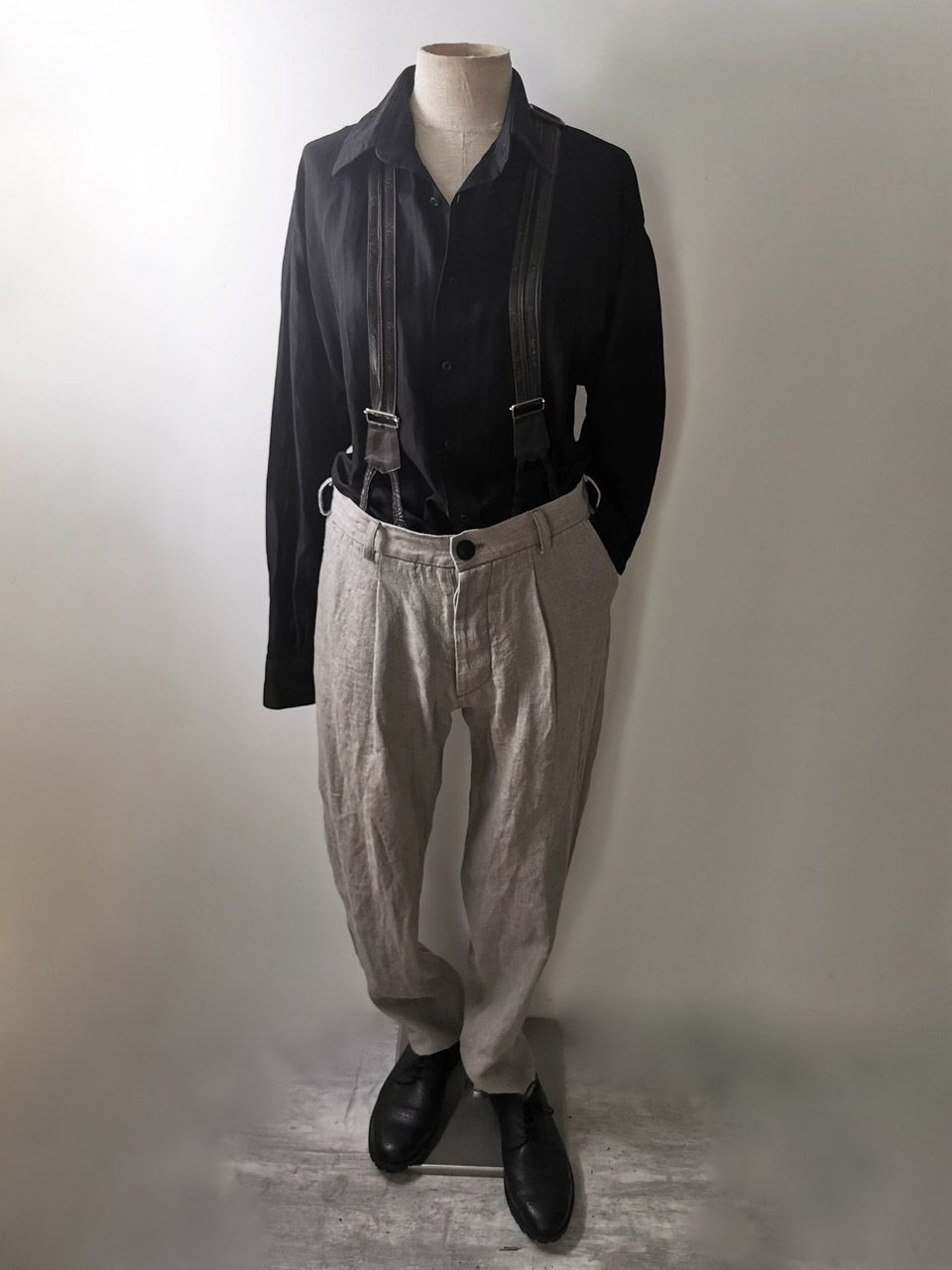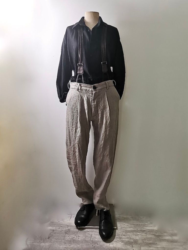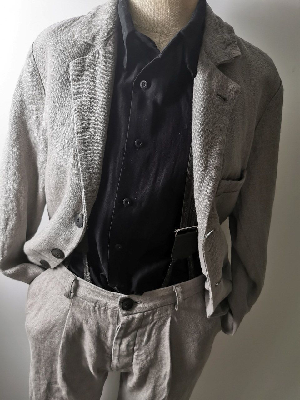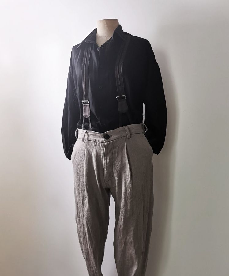 CUT from extrafine hand dyed L. Parisotto "Lino Geo" 100% linen, this classic 1920's tailored single pleat tapered leg suspender trouser are the perfect matching trousers to pair with this jacket.