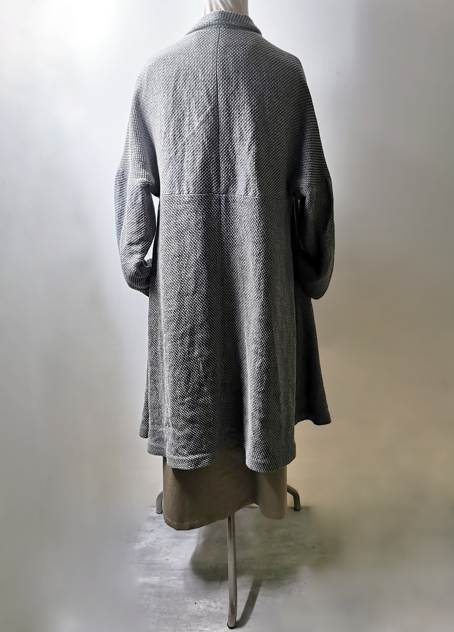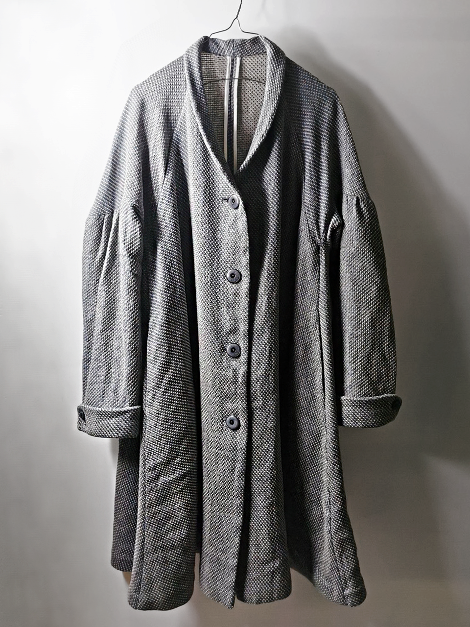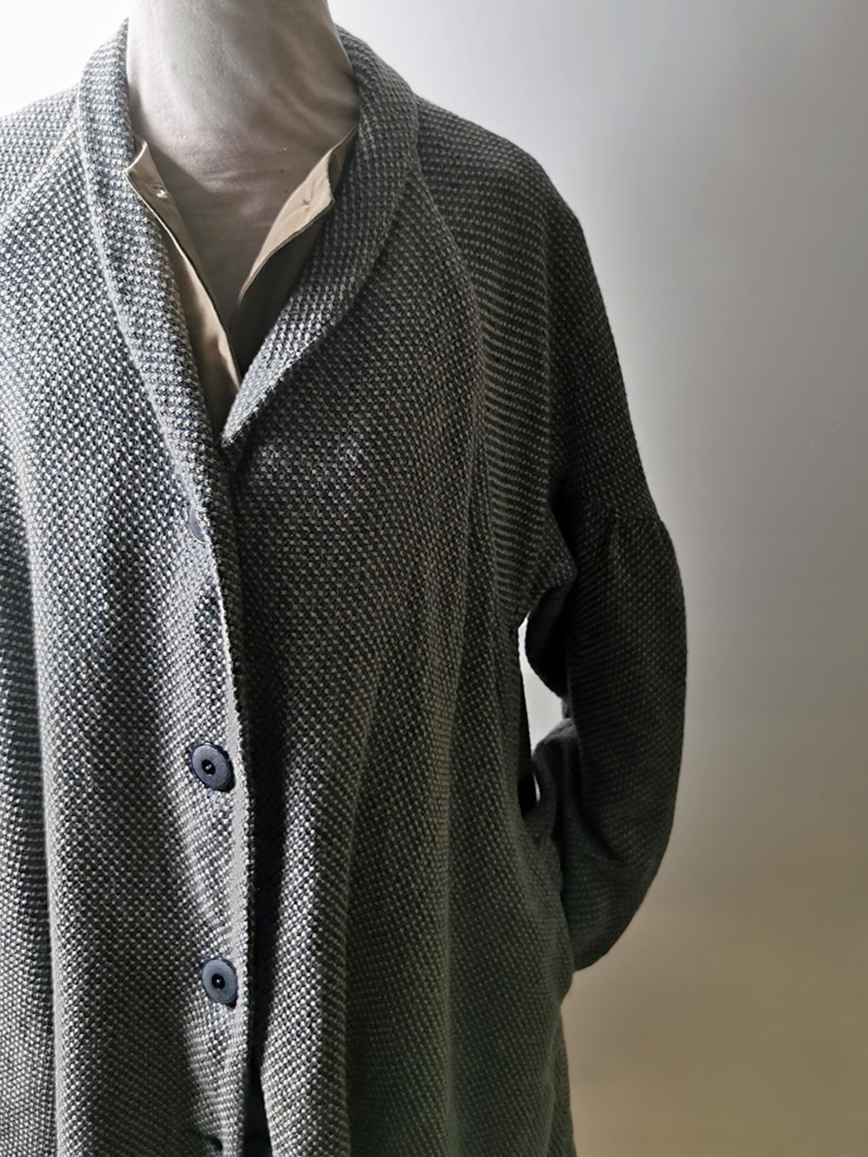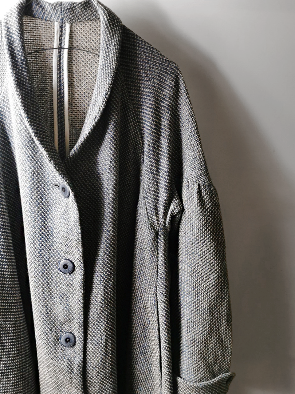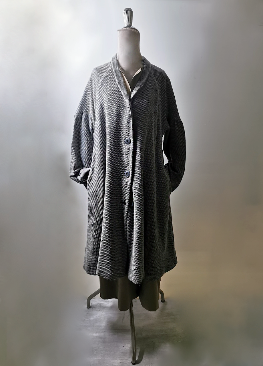 THIS special version of the super limited edition GRWC01 archive handmade coat design is the only piece of its kind made by hand in the entire world. It was created exclusively from our original single-breasted three-quarter length bell sleeve shawl collared 1950's modified opera coat reproduction pattern, from our extensive tailoring research, and cut using an extraordinary cashmere and linen special textural weave design created only for us by the world’s leading research fabric maker—Luigi Parisotto in Sarcedo Vicenza, Italy—then specially washed and treated by hand in our world-famous GBS Superworkrooms at Cavarzere Venezia for extra aging, shaping and softness. The design features an extremely elegant tailored feminine shape and proportions with multiple paneled patterning, drop-shoulder 7/8 length sleeves with expert gathering work at the shoulder seams, beautiful turned up cuff detailing on sleeves, extensive invisible hand sewn hemwork seams performed throughout, exquisite fully-cleaned finished interior construction with Italian cotton taped seams throughout, exquisitely detailed real corozo-nut buttons designs made exclusively for us by the world’s greatest living buttonmakers—Claudio and Cinzia Fontana in Parma, Italy, and no less than six of our signature real hand stitched buttonholes (each one required 13-17 minutes to cut and sew on the challenging textural fabric) in pure silk Bozzolo Reale Milano Seta threads. The piece also features our world leading pure silk hand dyed label created exclusively for us by Mion SpA in Torreglia which is the first label in the luxury industry to completely eliminate plastic polyester yarns in it—beautifully attached entirely by hand using pure silk threads.