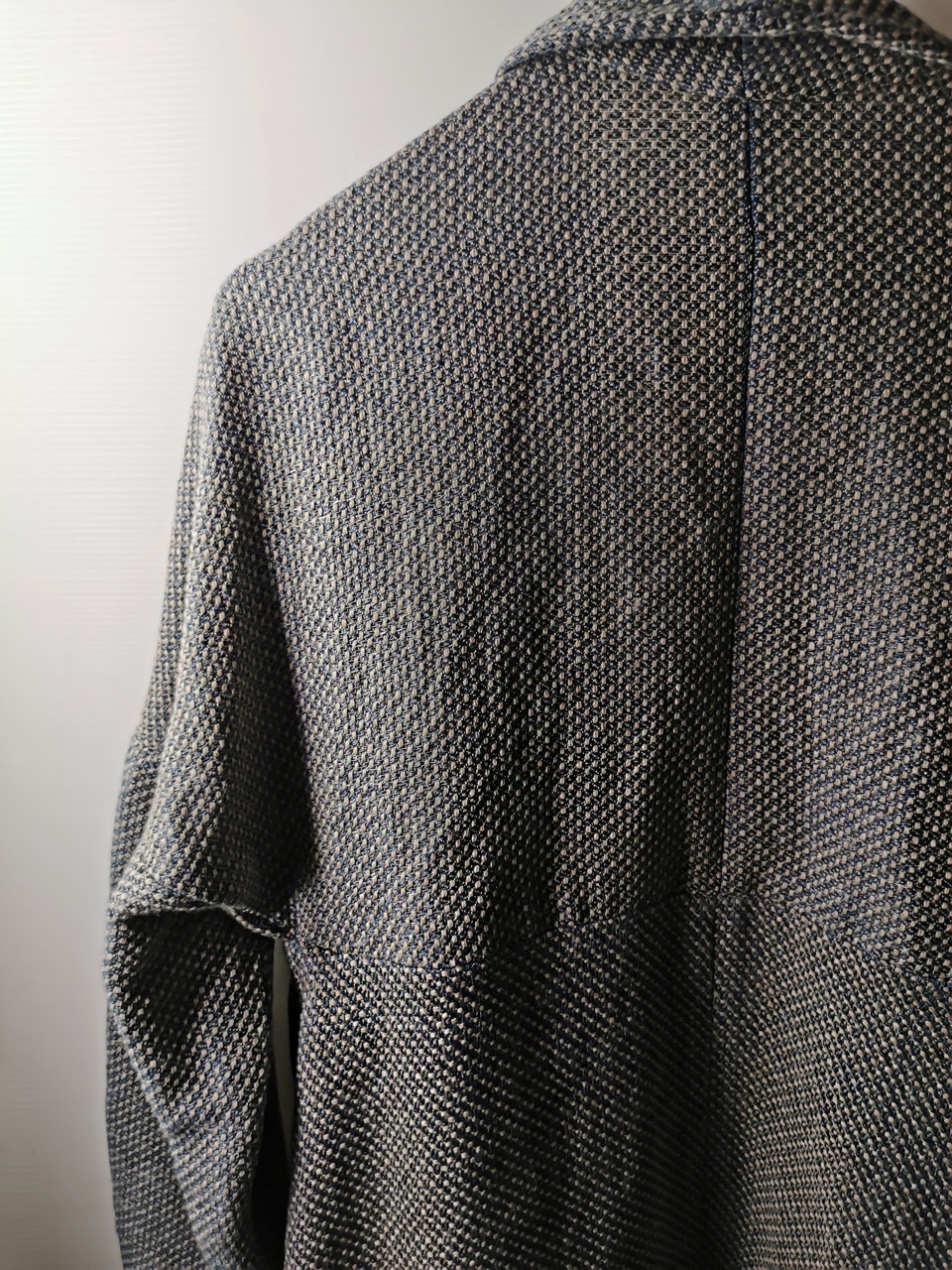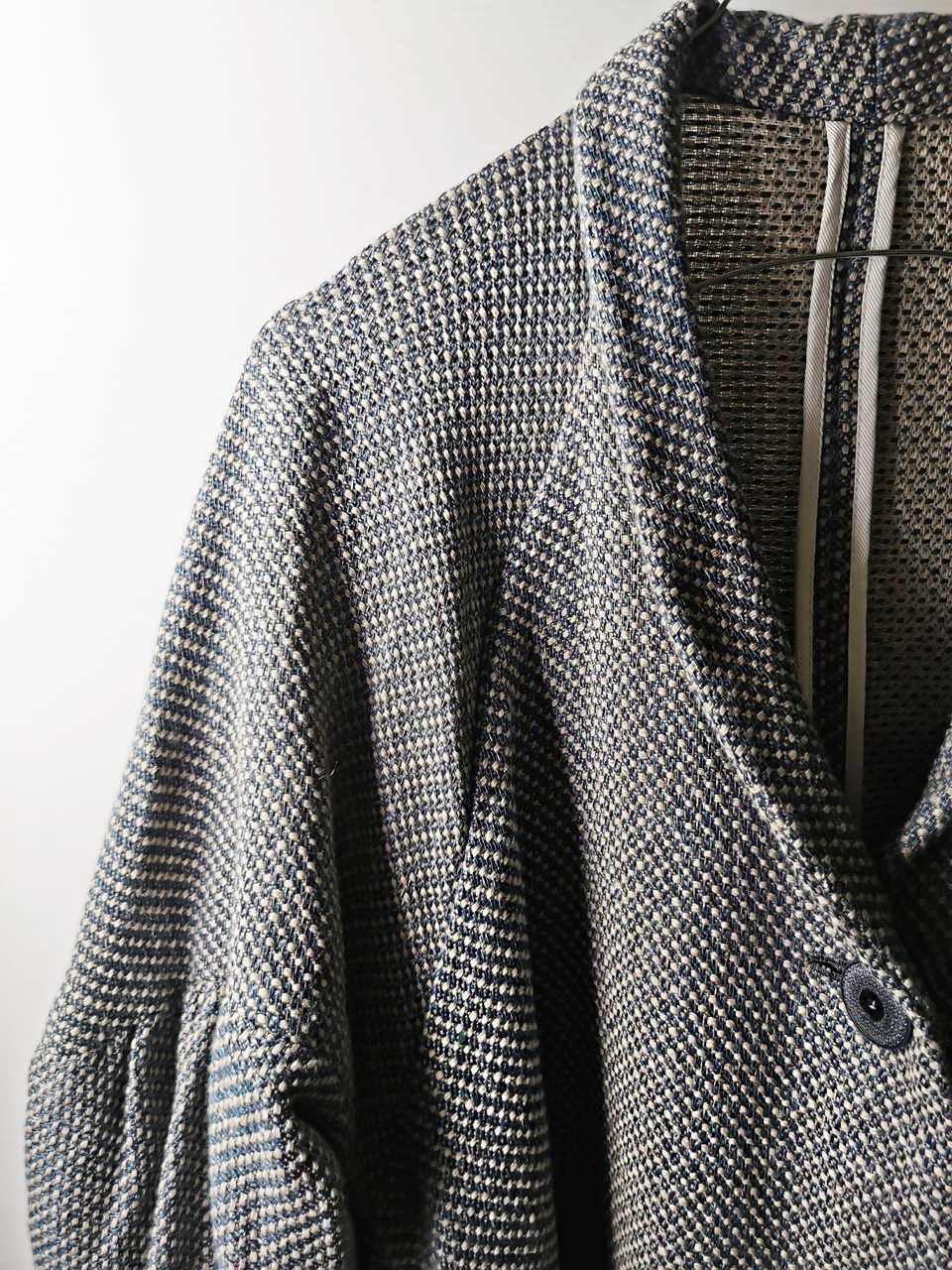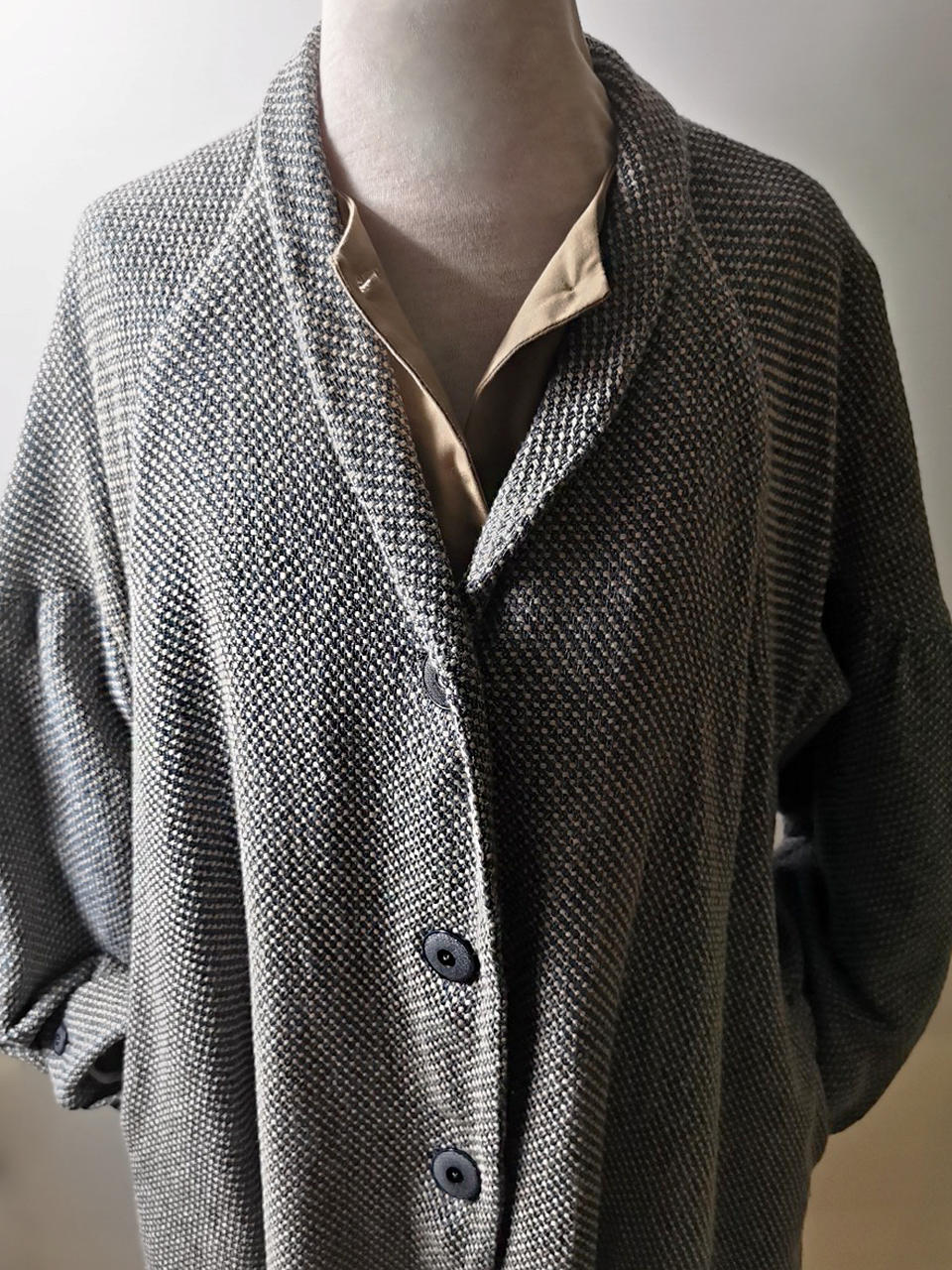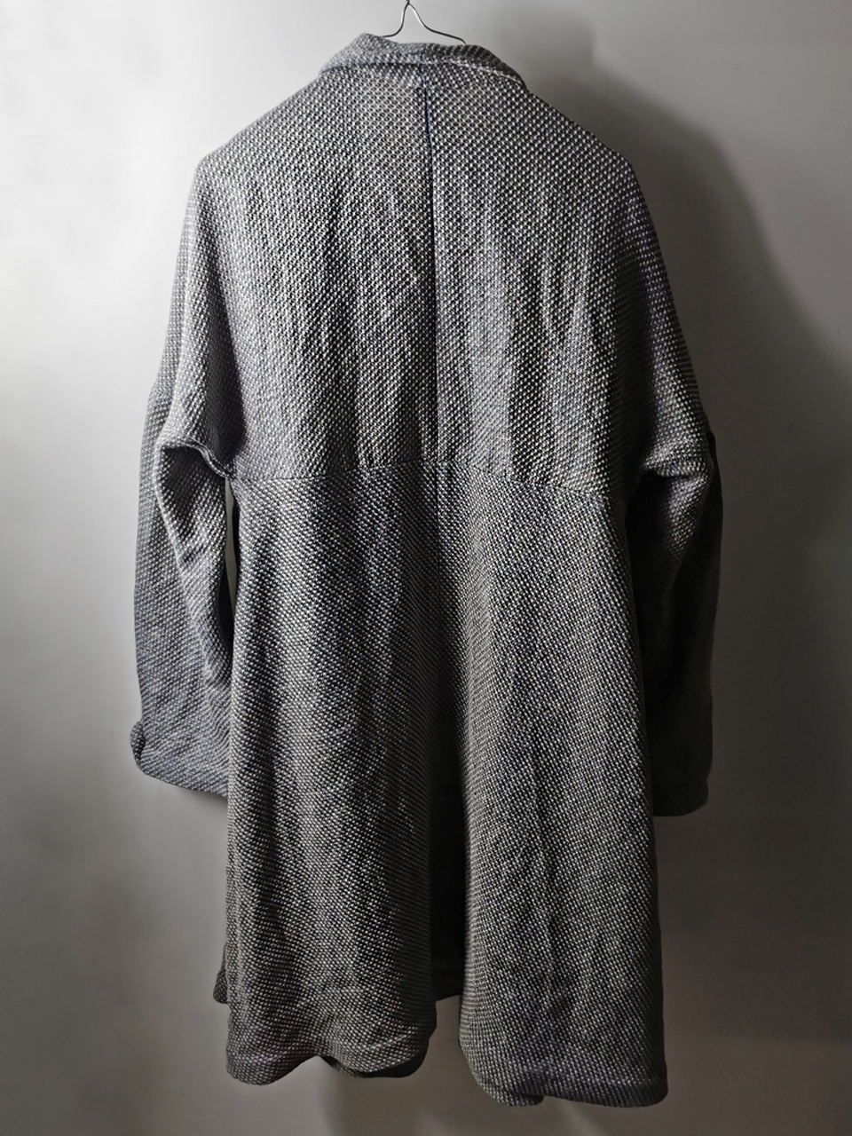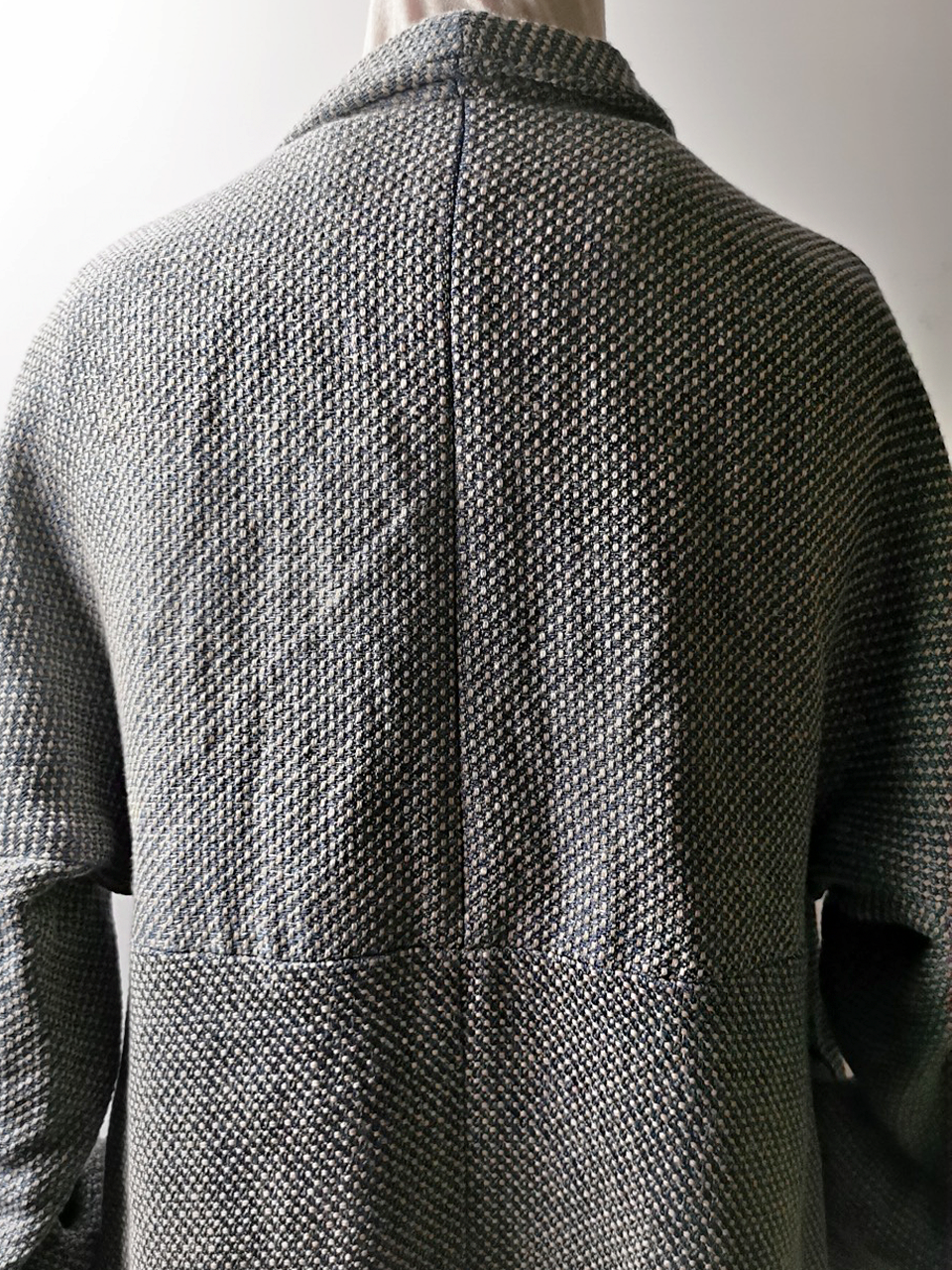 THIS special version of the super limited edition GRWC01 archive handmade coat design is the only piece of its kind made by hand in the entire world. It was created exclusively from our original single-breasted three-quarter length bell sleeve shawl collared 1950's modified opera coat reproduction pattern, from our extensive tailoring research, and cut using an extraordinary cashmere and linen special textural weave design created only for us by the world’s leading research fabric maker—Luigi Parisotto in Sarcedo Vicenza, Italy—then specially washed and treated by hand in our world-famous GBS Superworkrooms at Cavarzere Venezia for extra aging, shaping and softness. The design features an extremely elegant tailored feminine shape and proportions with multiple paneled patterning, drop-shoulder 7/8 length sleeves with expert gathering work at the shoulder seams, beautiful turned up cuff detailing on sleeves, extensive invisible hand sewn hemwork seams performed throughout, exquisite fully-cleaned finished interior construction with Italian cotton taped seams throughout, exquisitely detailed real corozo-nut buttons designs made exclusively for us by the world’s greatest living buttonmakers—Claudio and Cinzia Fontana in Parma, Italy, and no less than six of our signature real hand stitched buttonholes (each one required 13-17 minutes to cut and sew on the challenging textural fabric) in pure silk Bozzolo Reale Milano Seta threads. The piece also features our world leading pure silk hand dyed label created exclusively for us by Mion SpA in Torreglia which is the first label in the luxury industry to completely eliminate plastic polyester yarns in it—beautifully attached entirely by hand using pure silk threads.