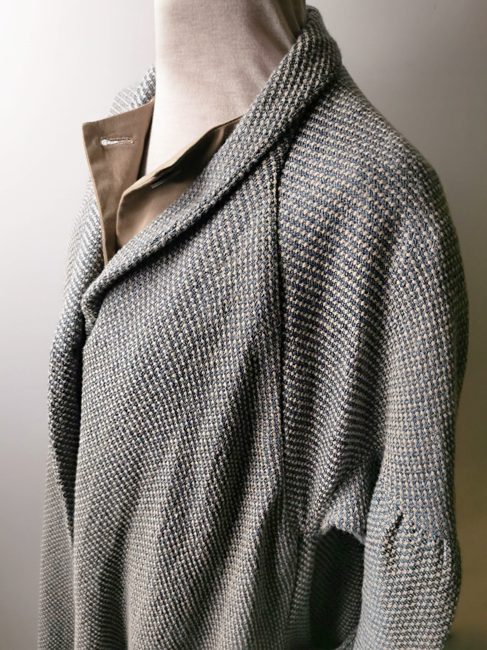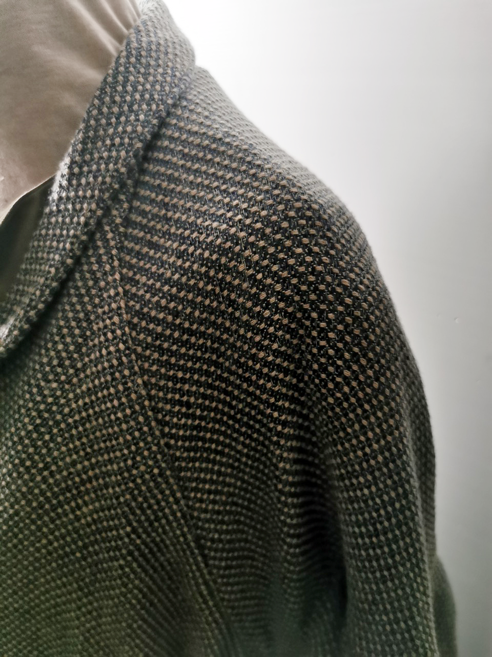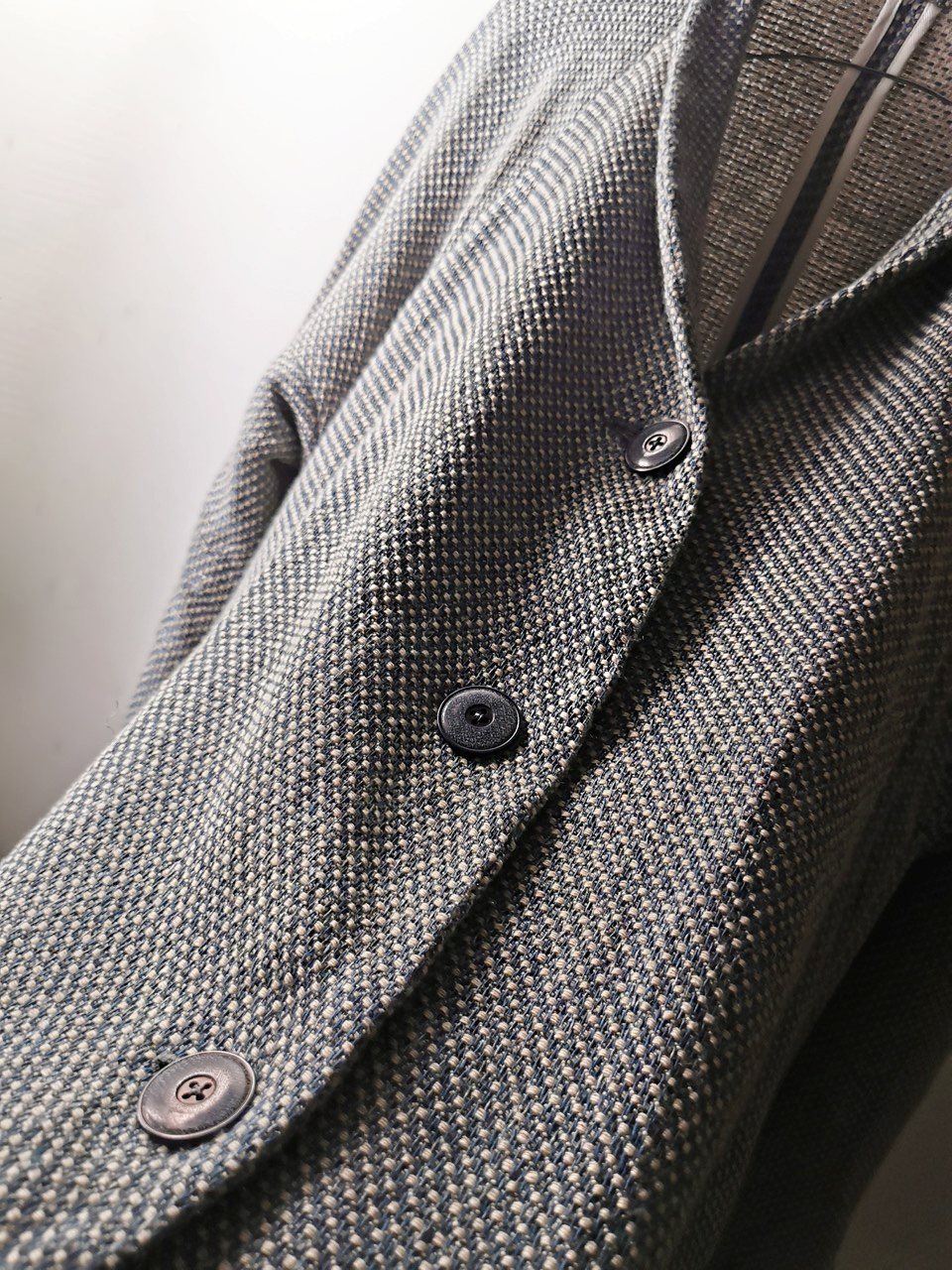 HAND WASHED LUIGI PARISOTTO CASHMERE & LINEN SPECIAL WEAVE FABRIC WITH SILK HAND-STITCHED BUTTONHOLES & FONTANA SPECIAL DESIGN REAL COROZO BUTTONS