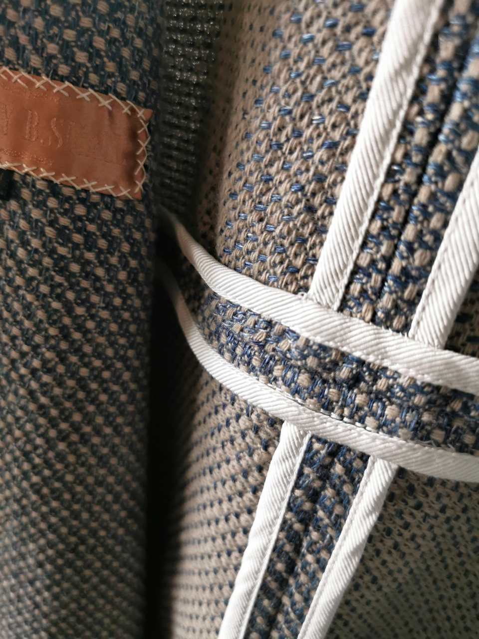...and cut using an extraordinary cashmere and linen special textural weave design created only for us by the world’s leading research fabric maker—Luigi Parisotto in Sarcedo Vicenza, Italy--then specially washed and treated by hand in our world-famous GBS Superworkrooms at Cavarzere Venezia for extra aging, shaping and softness...
