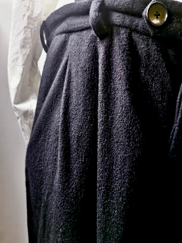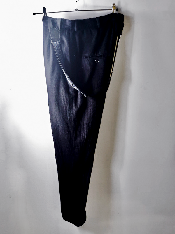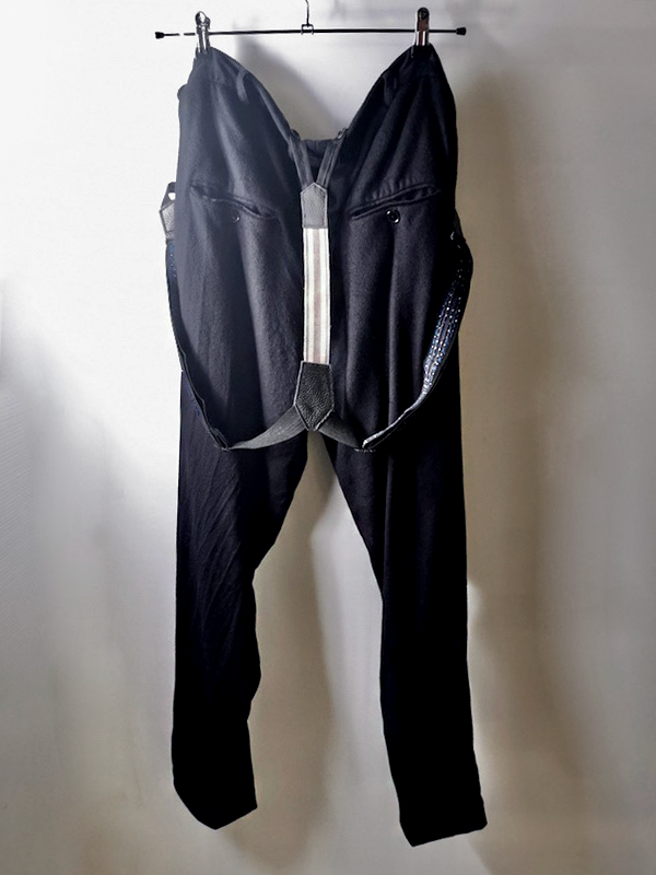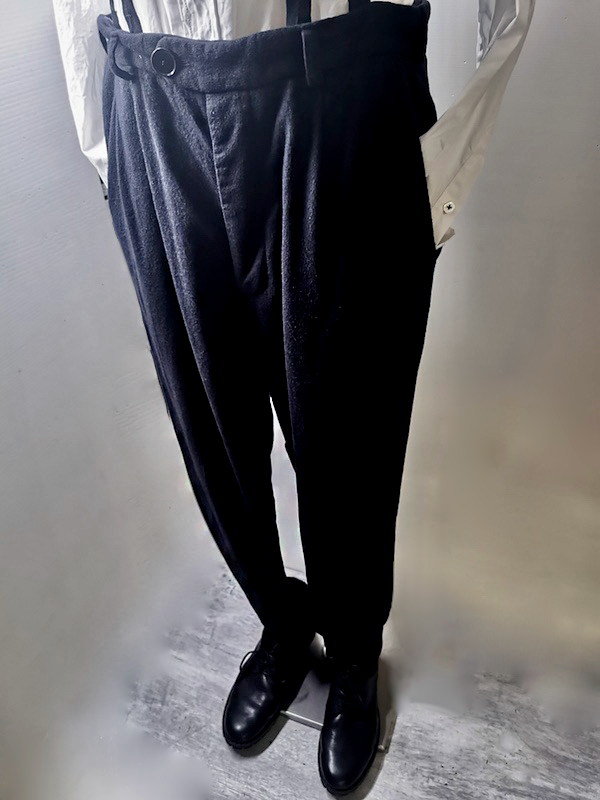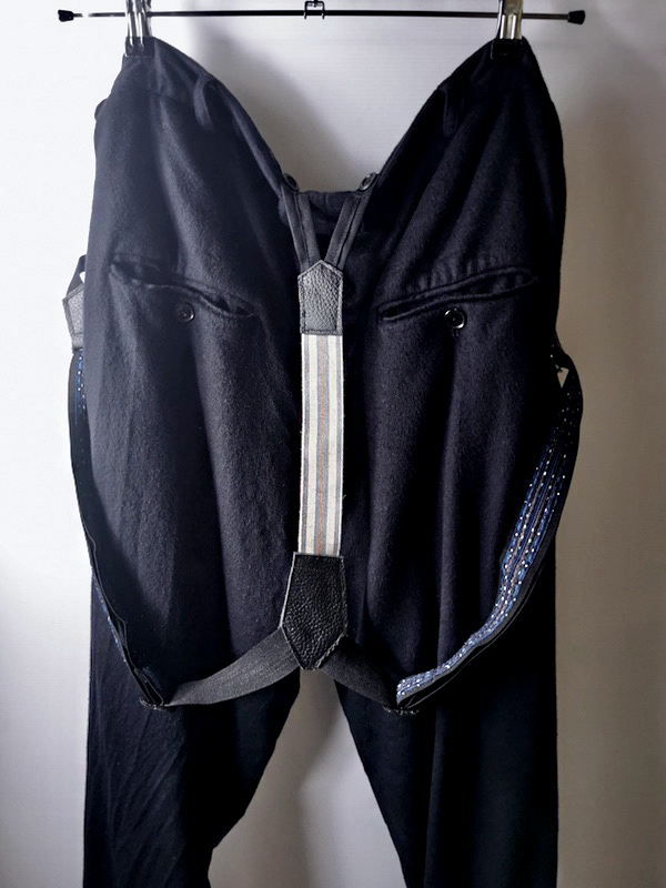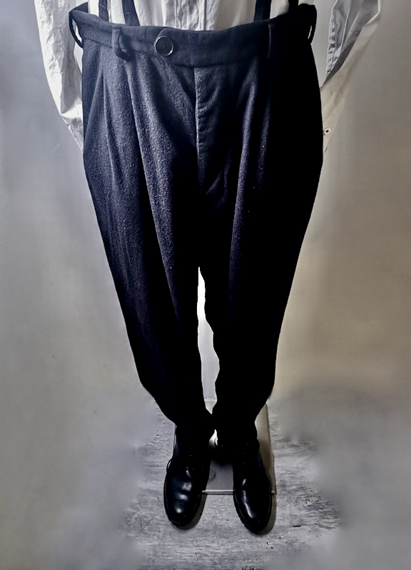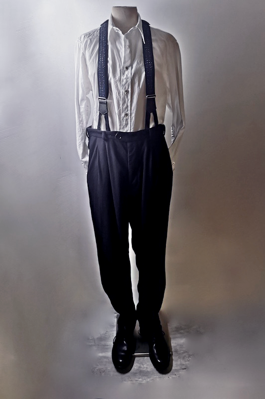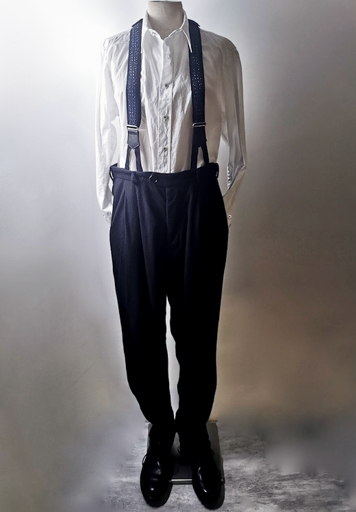 The special one-of-a-kind version of the HBP03 is made from our original late 1940’s early 1950’s based classic double-pleated tapered slim-leg drop-crotch suspender trouser pattern from our extensive tailoring research...
