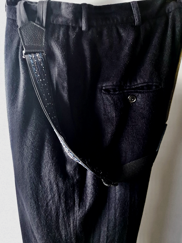 ...and remarkable hand cut vintage recycle garment leather suspenders made by hand in our world-famous GBS Superworkrooms at Cavarzere using exquisite Italian jacquard weave trim fabrics made for us in Brescia and extraordinary regimental striped weave linen elastic rear panel section made specially for us by the venerable Nastrificio Victor mill in Piove di Sacco Padova