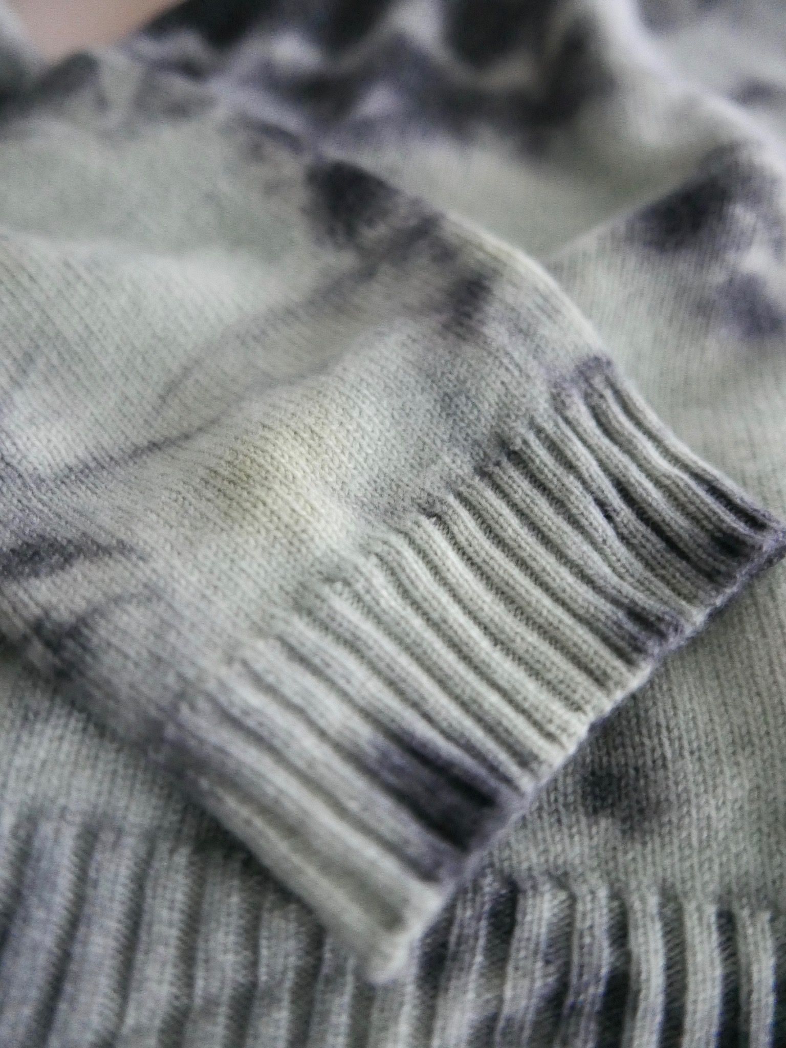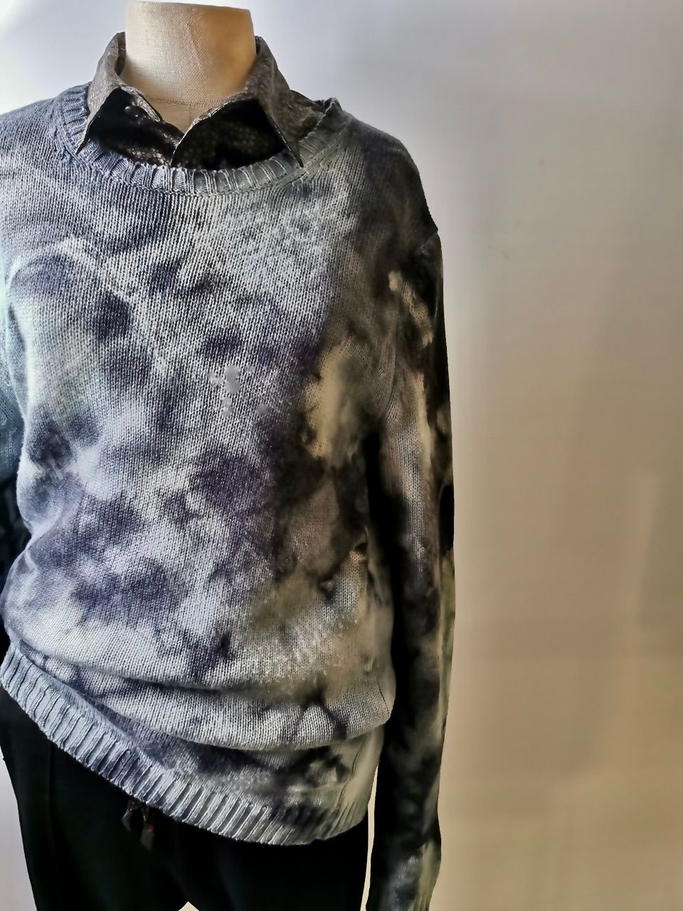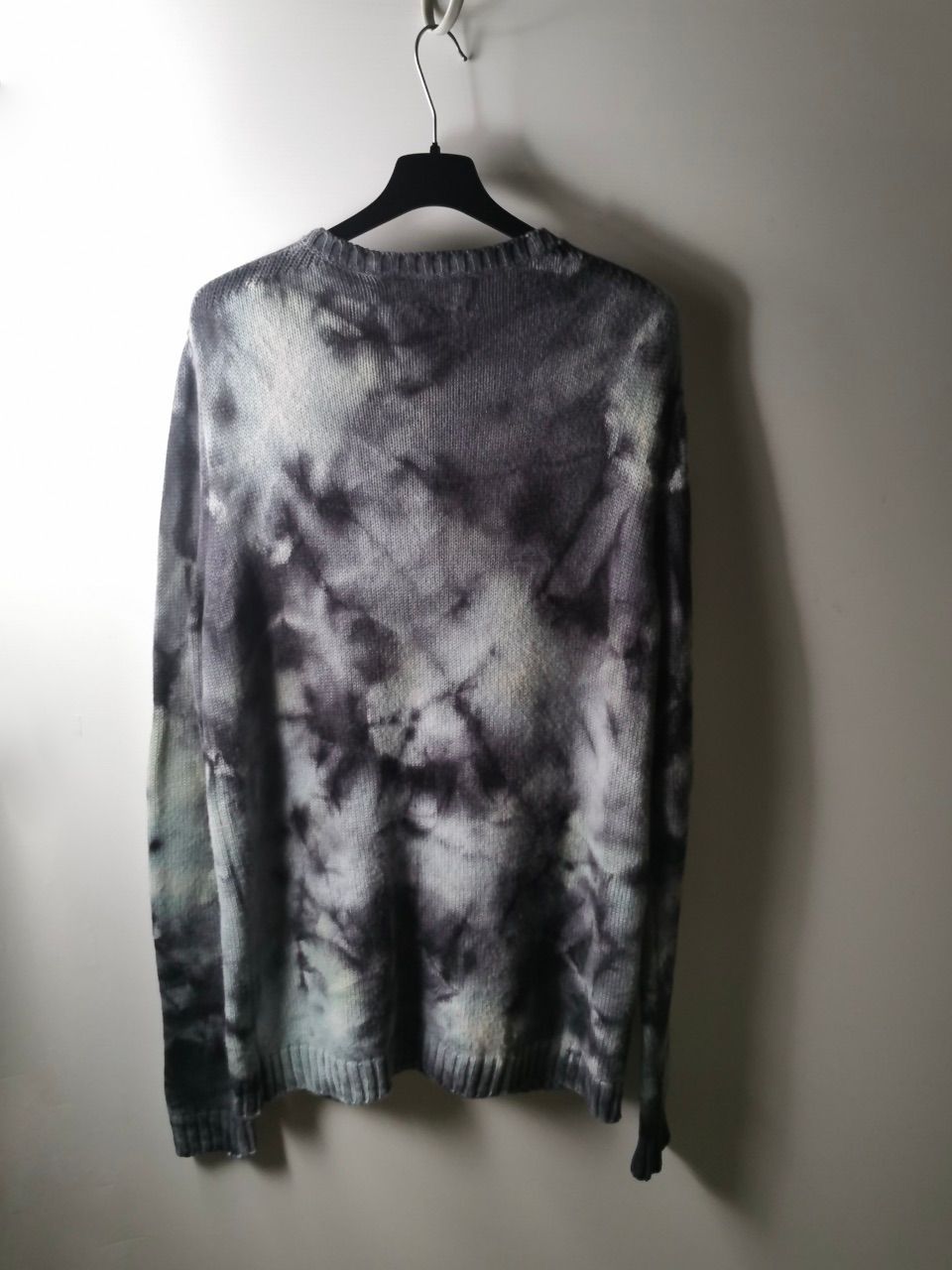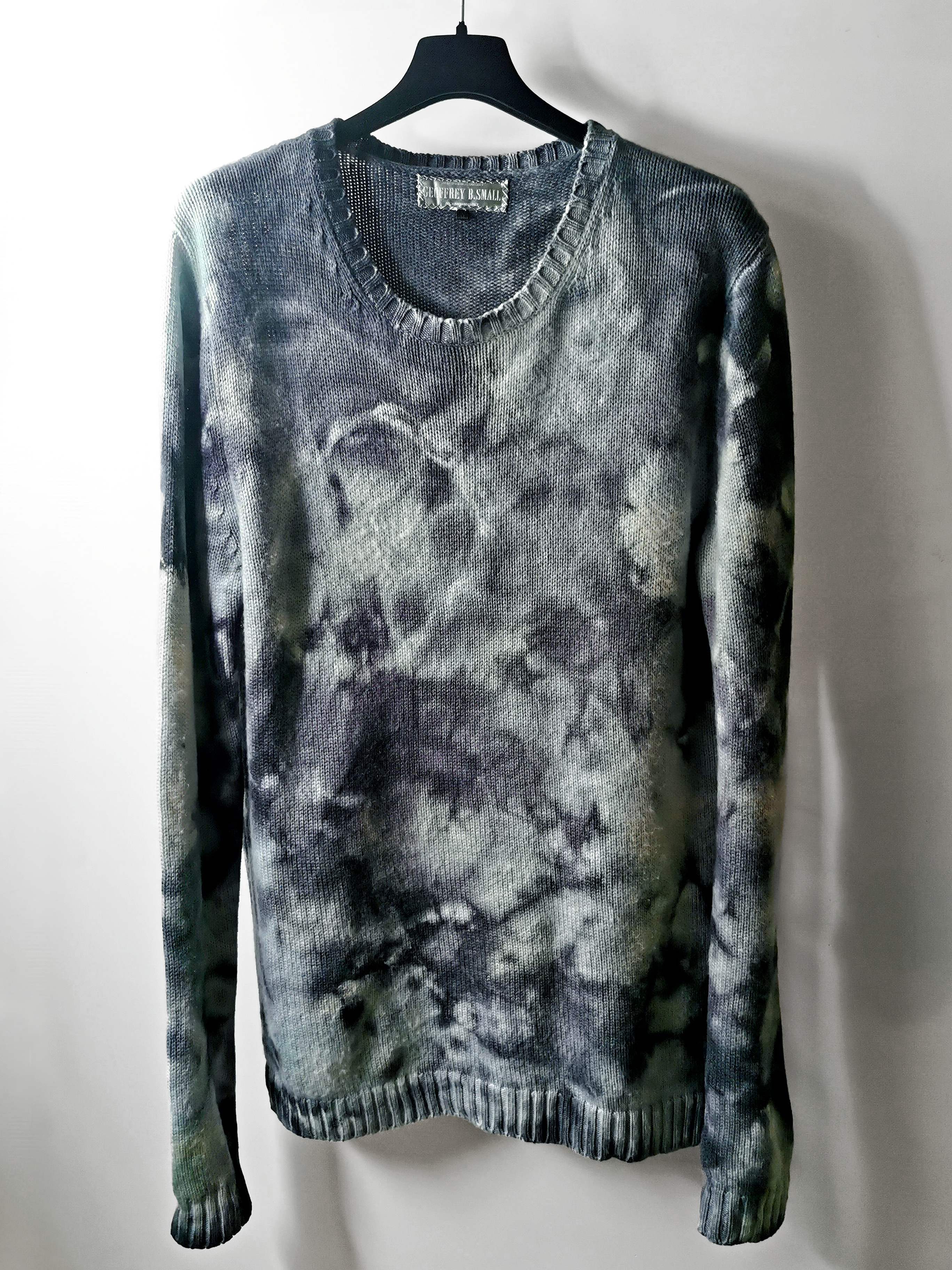 The special knitwear design was then specially individually multple hand dyed in our famous workrooms using our proprietary extreme handwork artistic artisan process and technique code-named “accident dye” and then extreme hand fabric treatment work which took over 5 days of expert work to achieve its spectacular and unique acid green, gold and blackened mottled colors... aged patina effects, special shaping and incredible softness. The sweater will get even softer over time and mold to your body with natural use; unlike industrial sweater finishing- the GBS hand finishing techniques for this deisgn used no chemicals, oils, silicone or machinery- allowing the sweater to have a longer wearing life and maximum environmental sustainability...