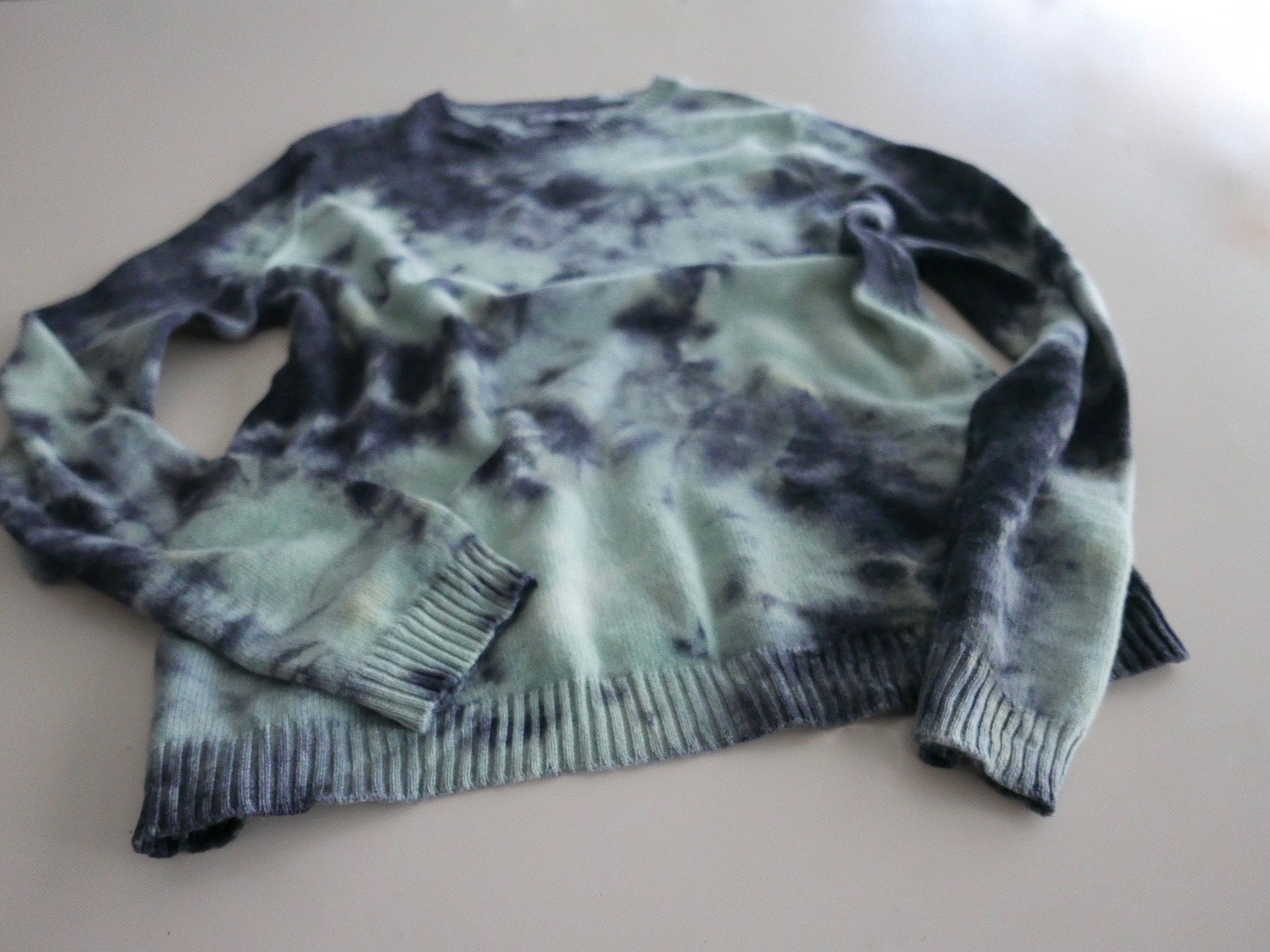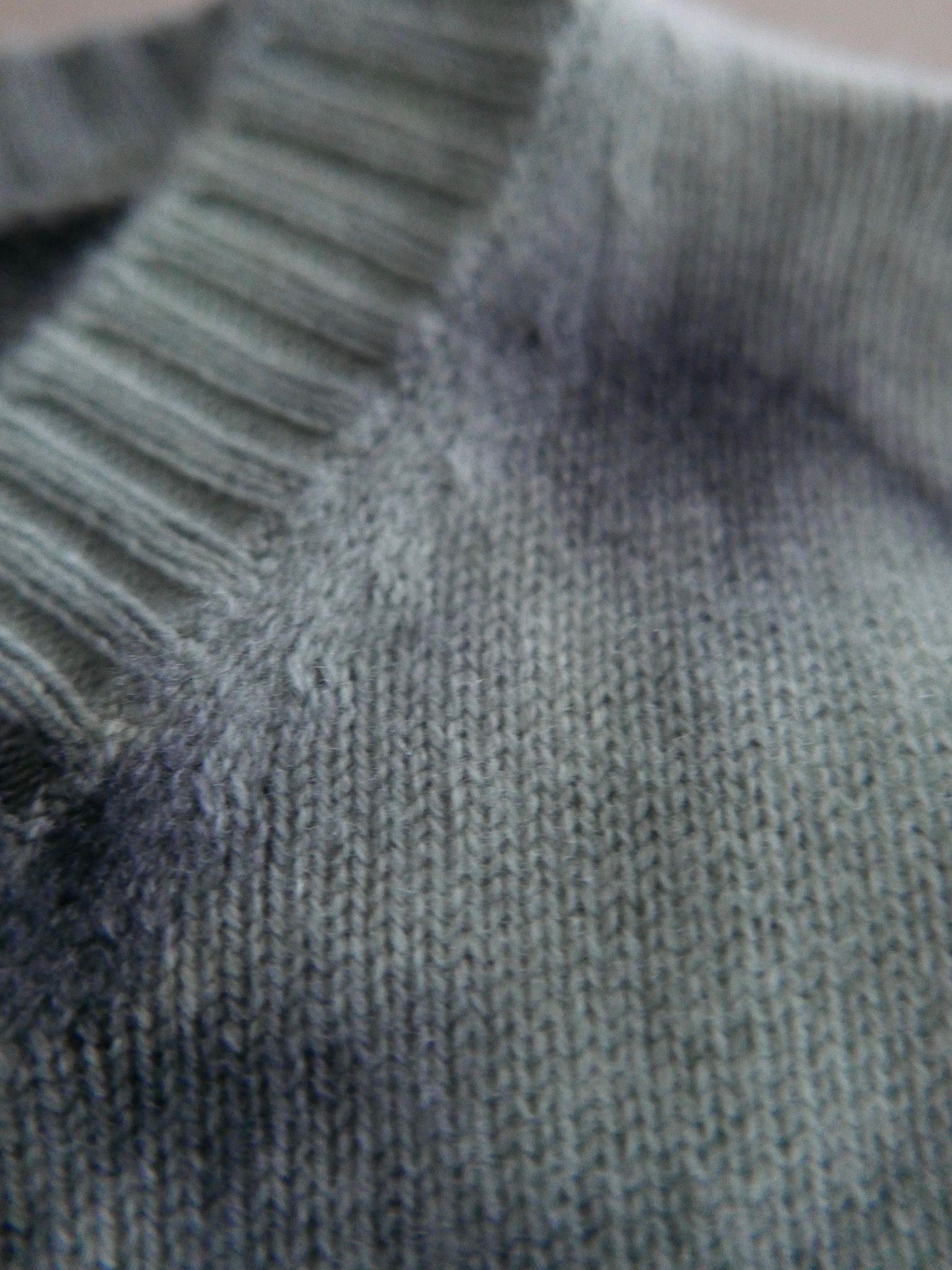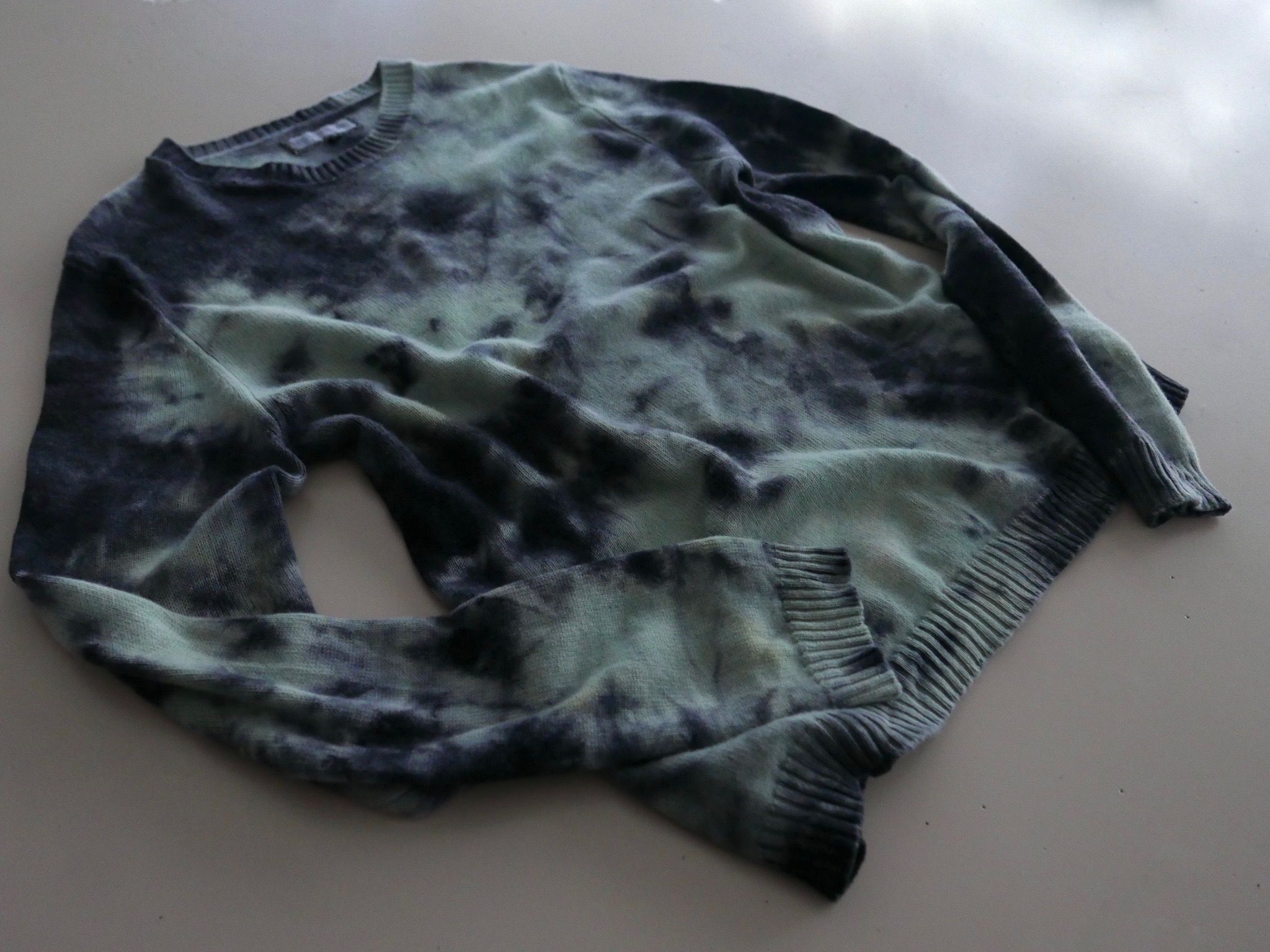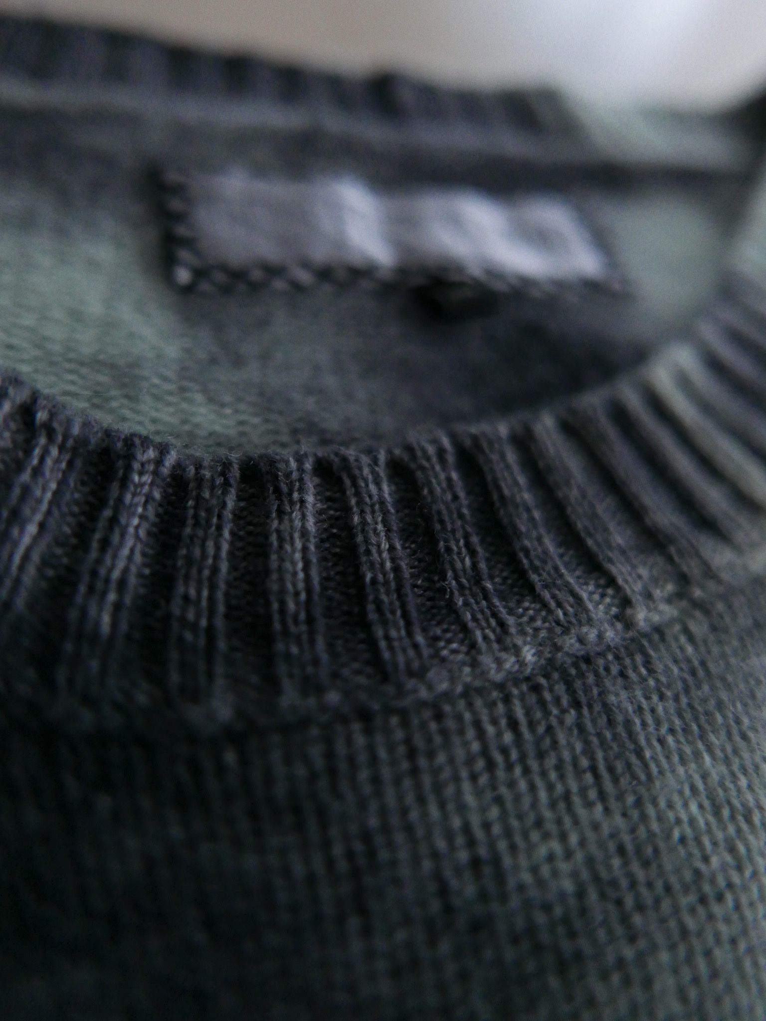 The special knitwear design was then specially individually multple hand dyed in our famous workrooms using our proprietary extreme handwork artistic artisan process and technique code-named “accident dye” and then extreme hand fabric treatment work which took over 5 days of expert work to achieve its spectacular and unique acid green, gold and blackened mottled colors... aged patina effects, special shaping and incredible softness. The sweater will get even softer over time and mold to your body with natural use; unlike industrial sweater finishing- the GBS hand finishing techniques for this deisgn used no chemicals, oils, silicone or machinery- allowing the sweater to have a longer wearing life and maximum environmental sustainability...