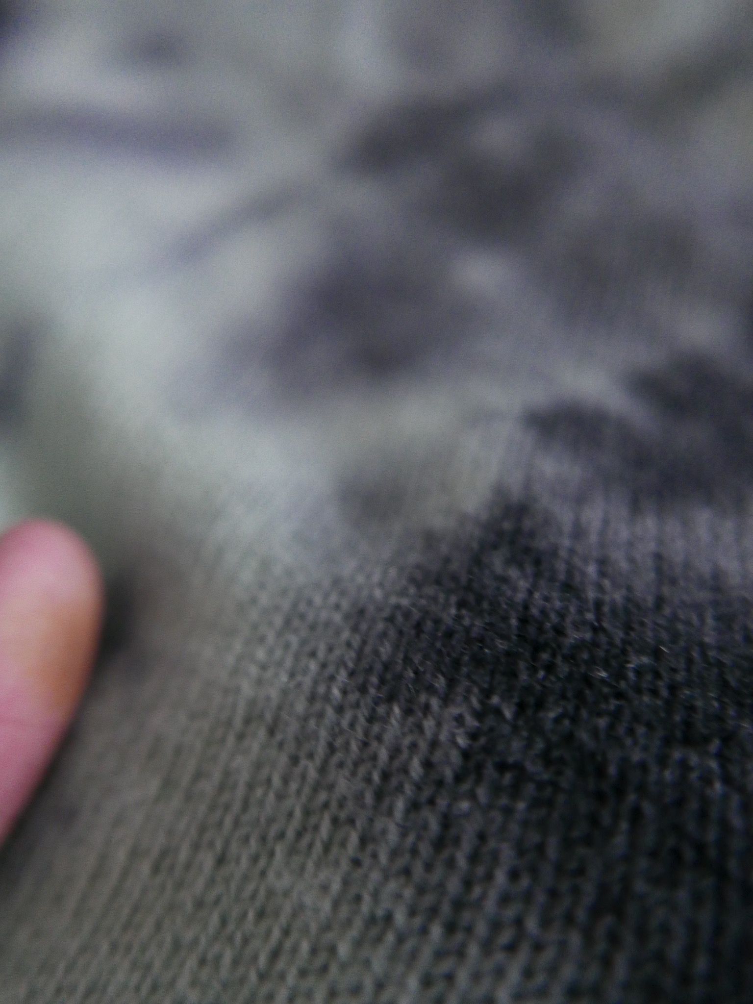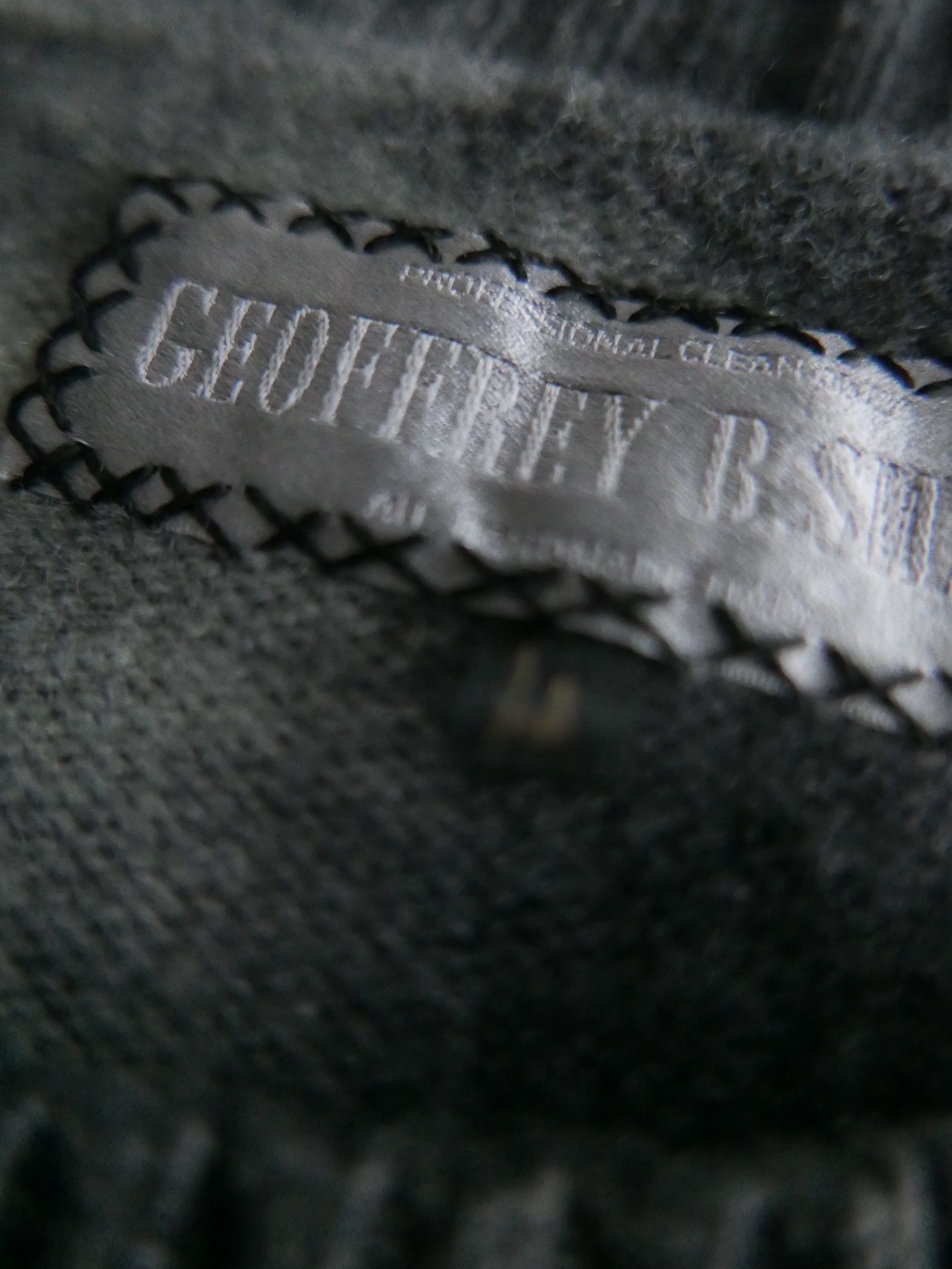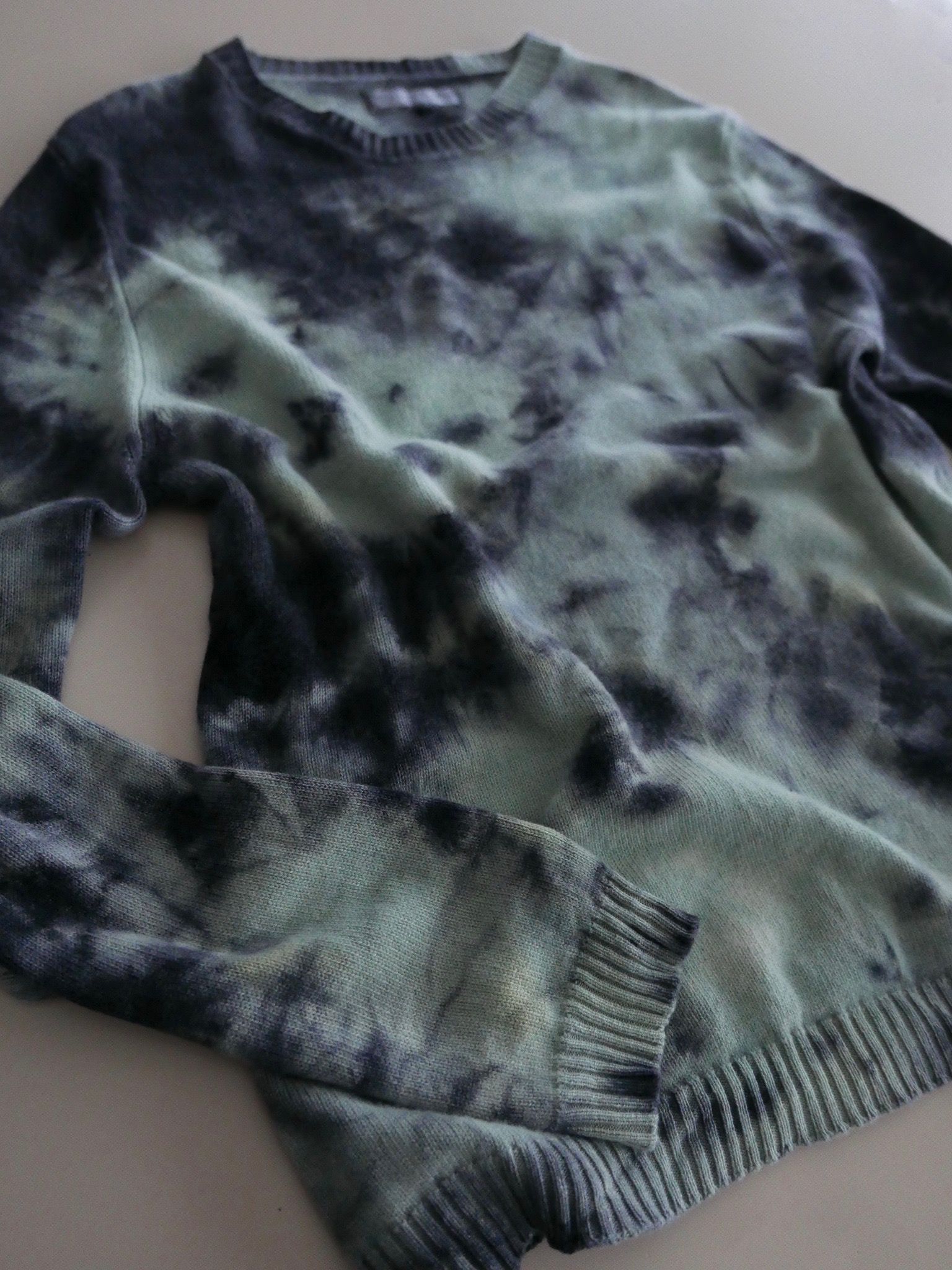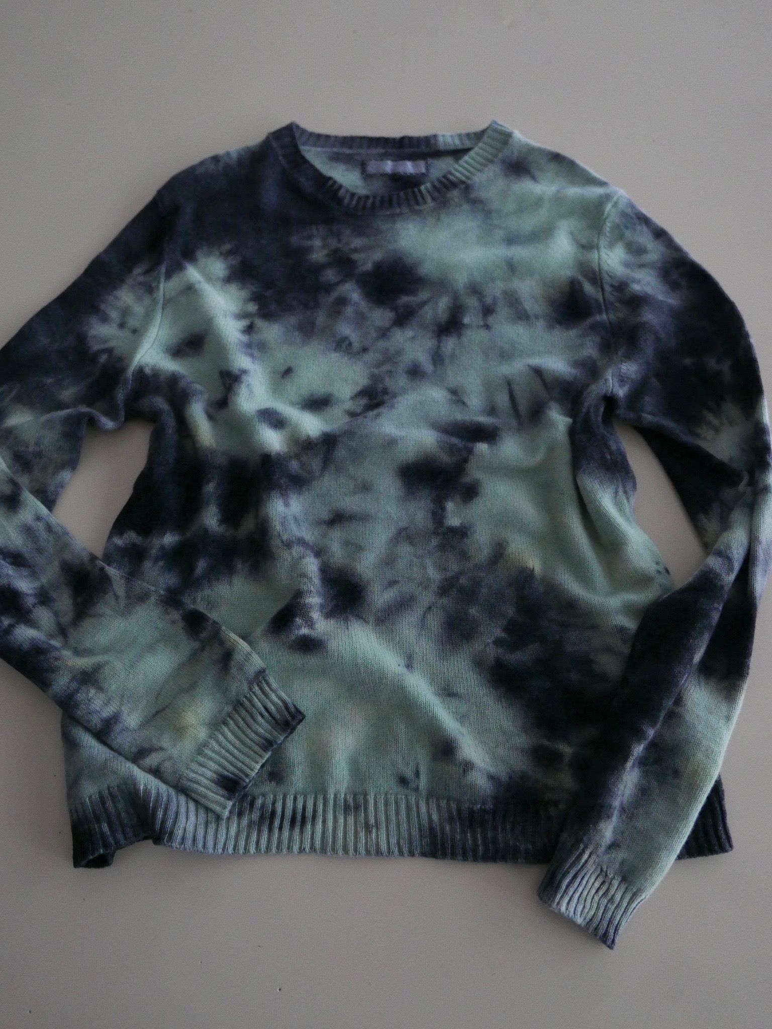 The special knitwear design was then specially individually multple hand dyed in our famous workrooms using our proprietary extreme handwork artistic artisan process and technique code-named “accident dye” and then extreme hand fabric treatment work which took over 5 days of expert work to achieve its spectacular and unique acid green, gold and blackened mottled colors... aged patina effects, special shaping and incredible softness. The sweater will get even softer over time and mold to your body with natural use; unlike industrial sweater finishing- the GBS hand finishing techniques for this deisgn used no chemicals, oils, silicone or machinery- allowing the sweater to have a longer wearing life and maximum environmental sustainability...