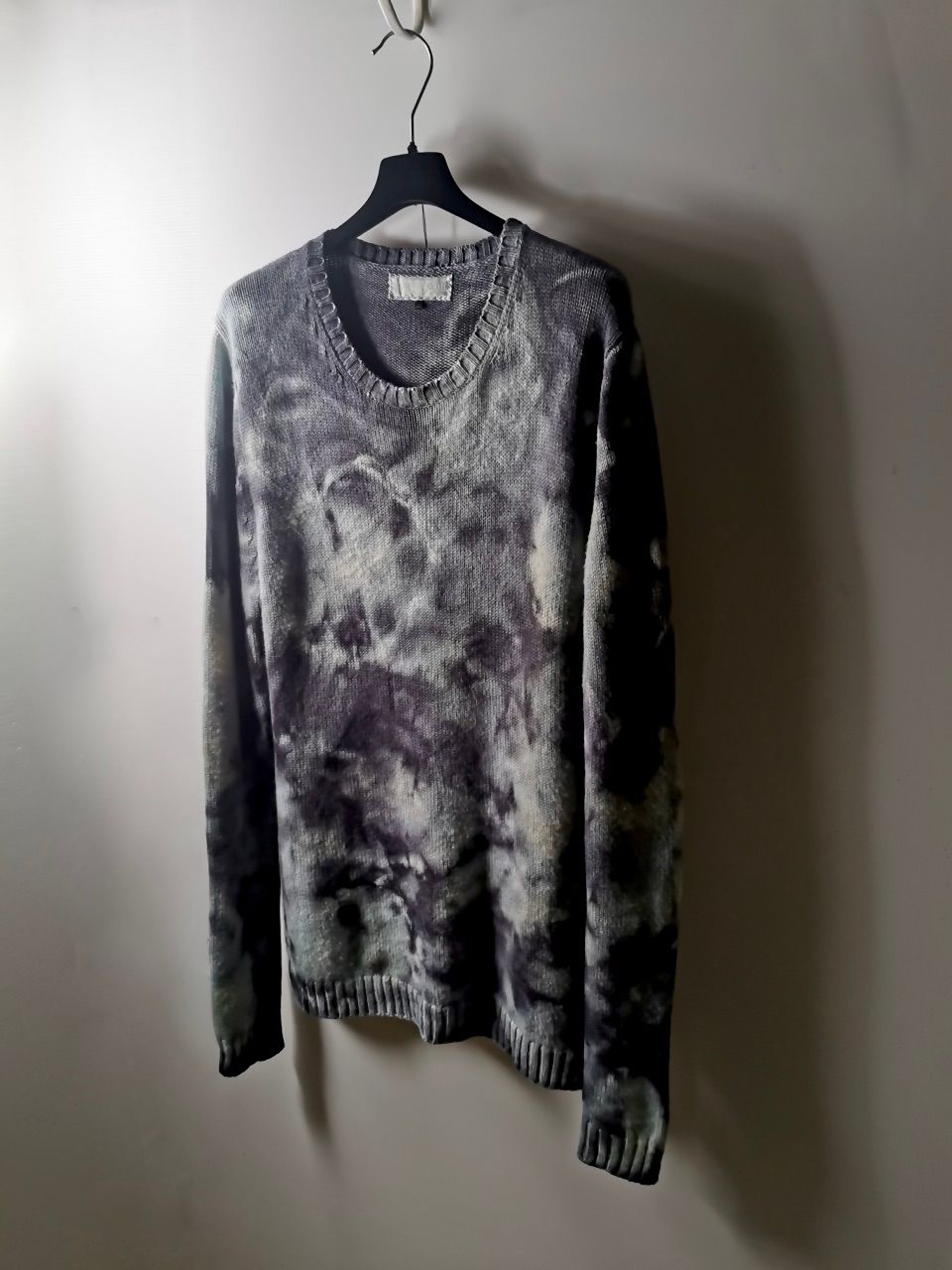 THIS special version of the GBS Evolution V super limited edition MZK02 extreme artisanal production design sweater is one of only 2 pieces of its kind currently made by hand in the entire world. It was created exclusively for Darklands in Berlin from a classic Italian "polpo stile" rocker's octopus-style European slim-fit crew-neck 7 gauge pullover sweater pattern from our extensive tailoring research, and expertly knit using classic fully fashioned construction techniques by the Sella family of master knitters in Cavarzere Venezia and over 365 grams of pure Mongolian cashmere ultralux yarn from Italy’s most prestigious cashmere yarn maker, the Cariaggi Lanificio in Cagli Pesaro e Urbino that provides 10 times more insulating power than normal wool. The special knitwear design was then specially individually multple hand dyed in our famous workrooms using our proprietary extreme handwork artistic artisan process and technique code-named “accident dye” and then extreme hand fabric treatment work which took over 5 days of expert work to achieve its spectacular unique acid green, gold and blackened mottled colors, aged patina effects, special shaping and incredible softness. The sweater will get even softer over time and mold to your body with natural use; unlike industrial sweater finishing- GBS hand finishing techniques use no chemicals, oils, silicone or machinery- allowing the sweater to have a longer wearing life and maximum environmental sustainability. The design features all the hallmarks of the very best in Italian knitwear craftsmanship from its impeccable seamless one piece build entirely made from scratch with no sewing seams or cutting to the exquisitely executed “costina” rib-knit sections, and “calatura” 4 into 2 shoulder seam and armhole shaping. The piece also features our world leading pure silk hand dyed label created exclusively for us by Mion SpA in Torreglia which is the first label in the luxury industry to completely eliminate plastic polyester yarns in it, beautifully sewn in by hand in luxurious pure silk Bozzolo Reale Milano Seta threads--beautifully sewn in entirely by hand using pure silk threads. Variations in color and color density are not imperfections or irregularities, but specific characteristics of the special hand dyeing and making techniques. We recommend professional cleaning only or hand wash in cold water. Do not wash with other items. Do not put in machine washer or dryer.