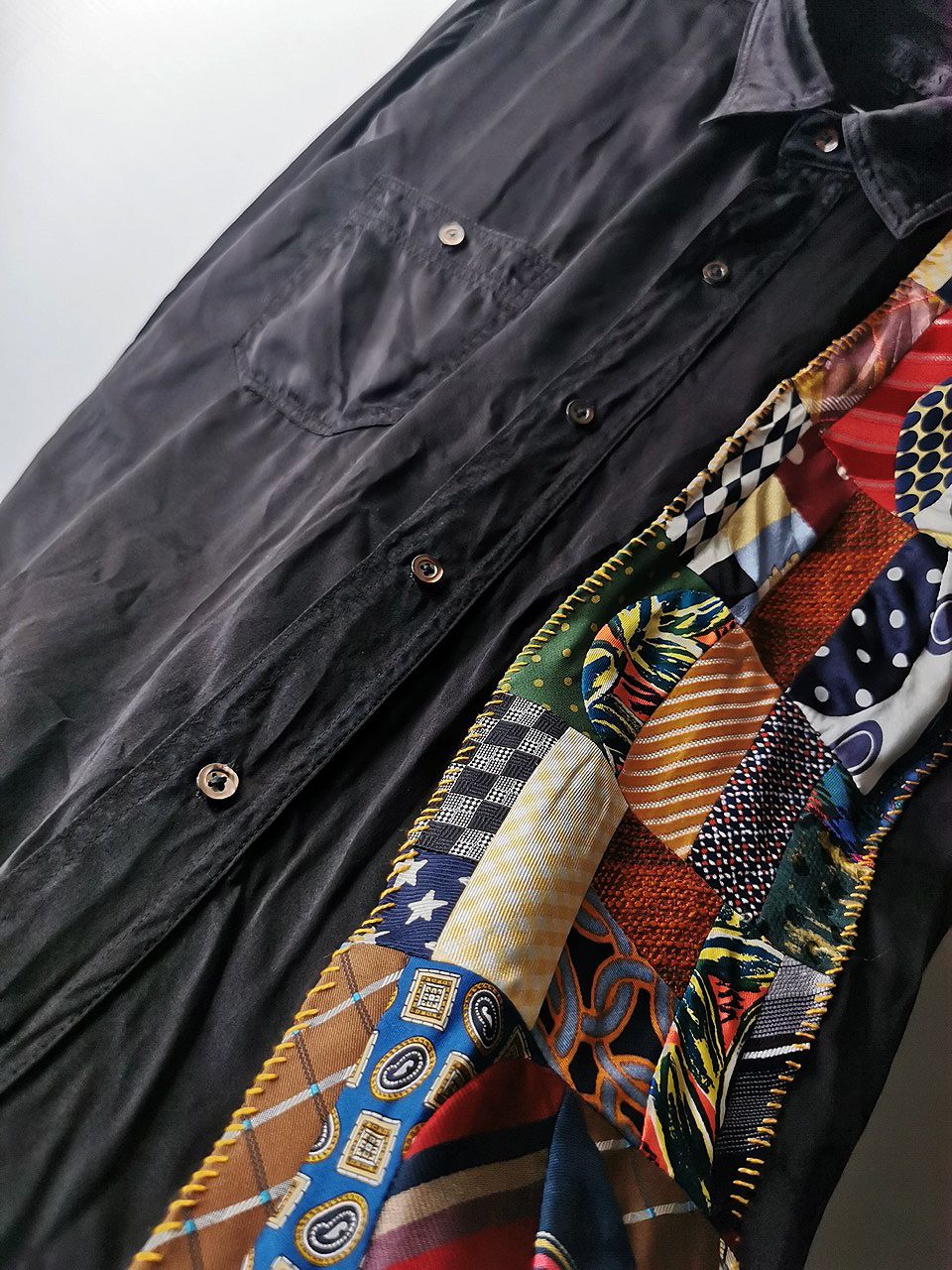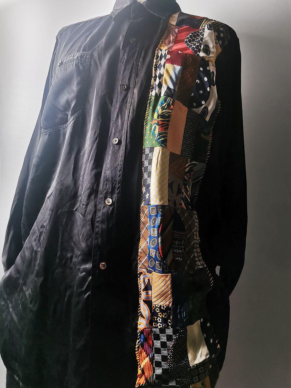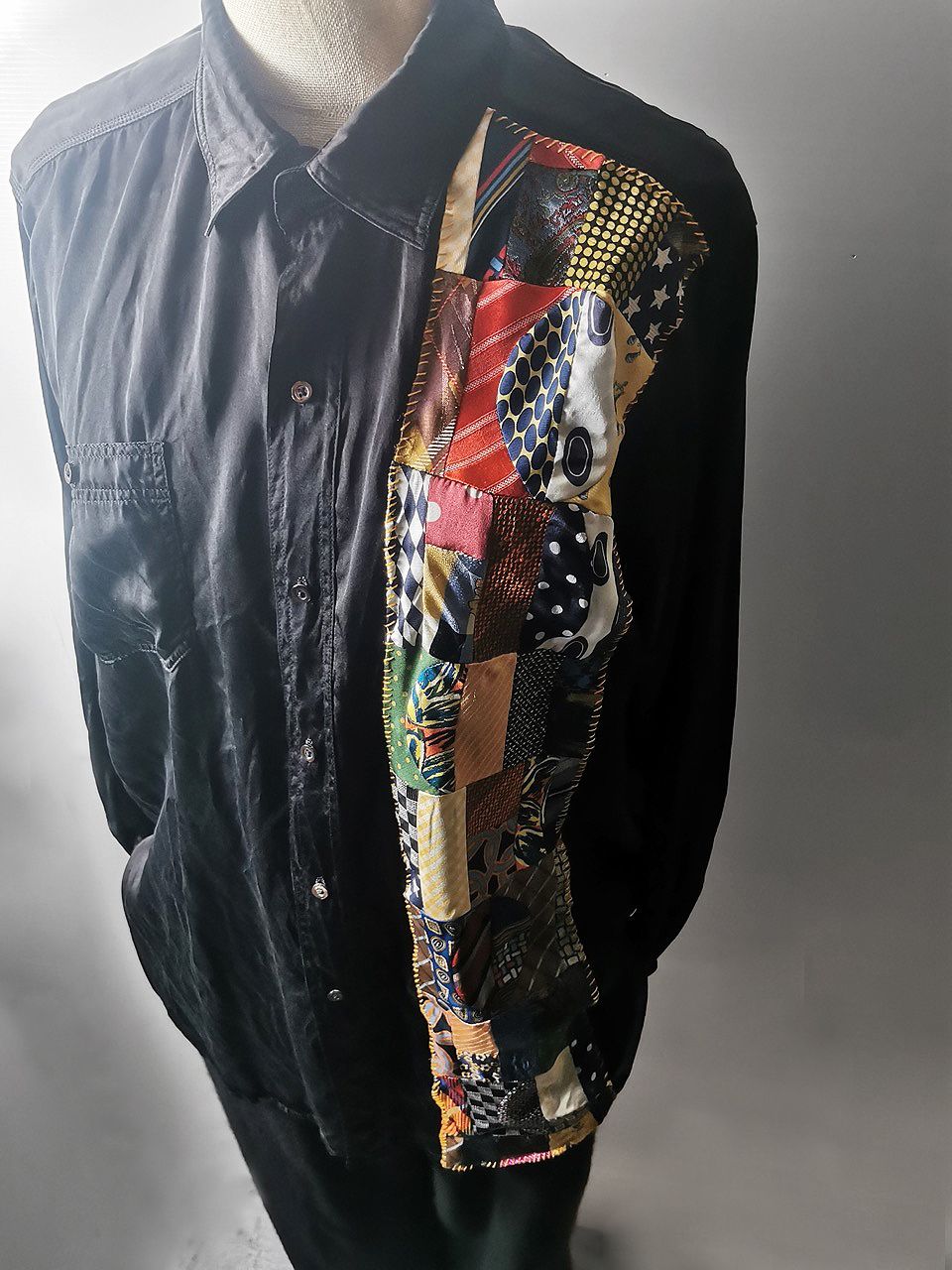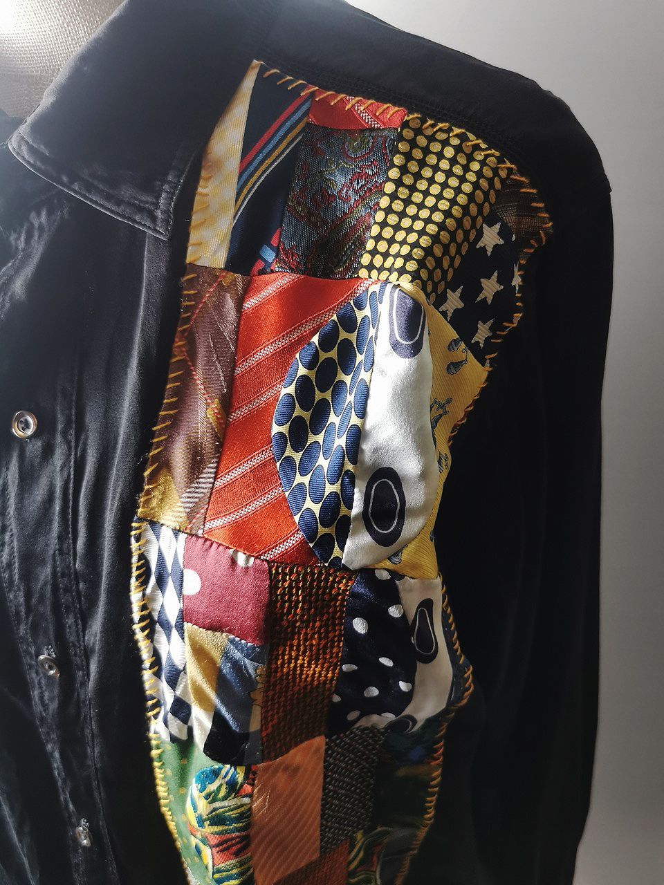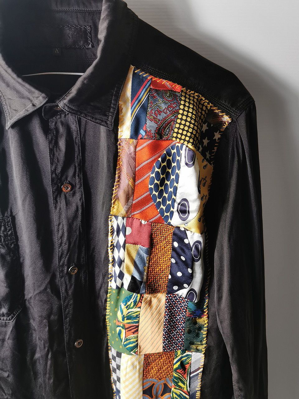 The design features real handcut vintage silk patchworks painstaking assembled in our workrooms from vintage Italian pure silk necktie designs and then attached by hand using extensive hand stitch detail work in different colored pure cotton embroidery threads that required over 6 hours of work for each shirt, expertly performed triple and double-stitch construction performed using only single-needle machinery as per the original period techniques (which required 2-4 times more work than using double or triple-needle machinery), impeccable fully clean-finished interiors...
