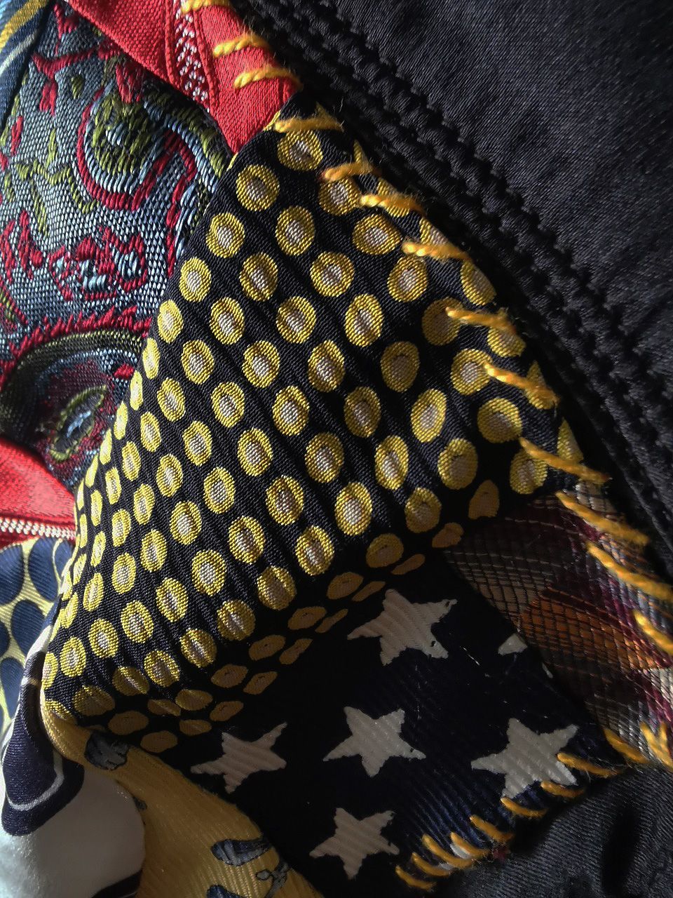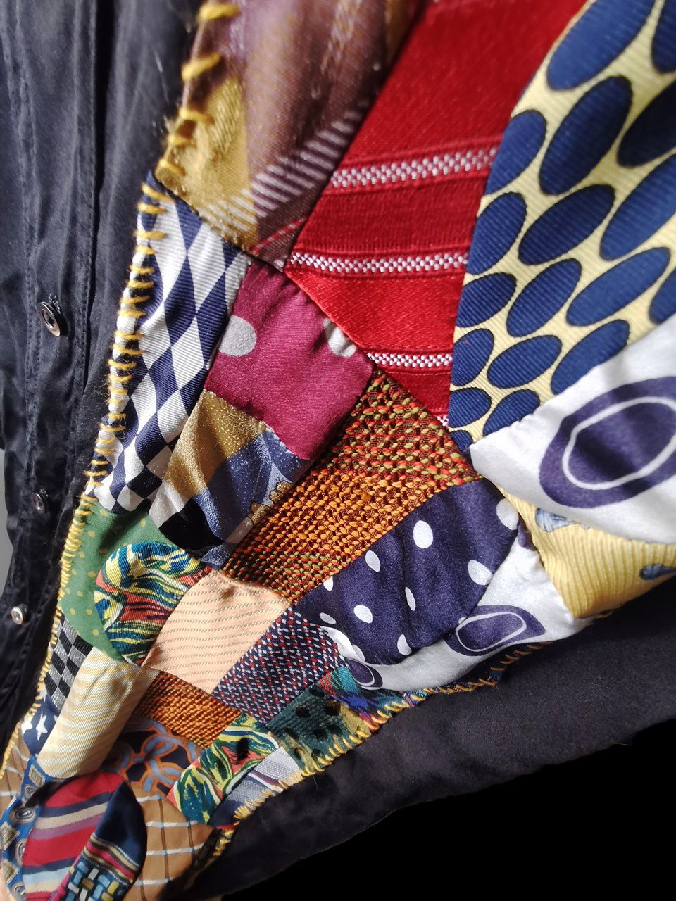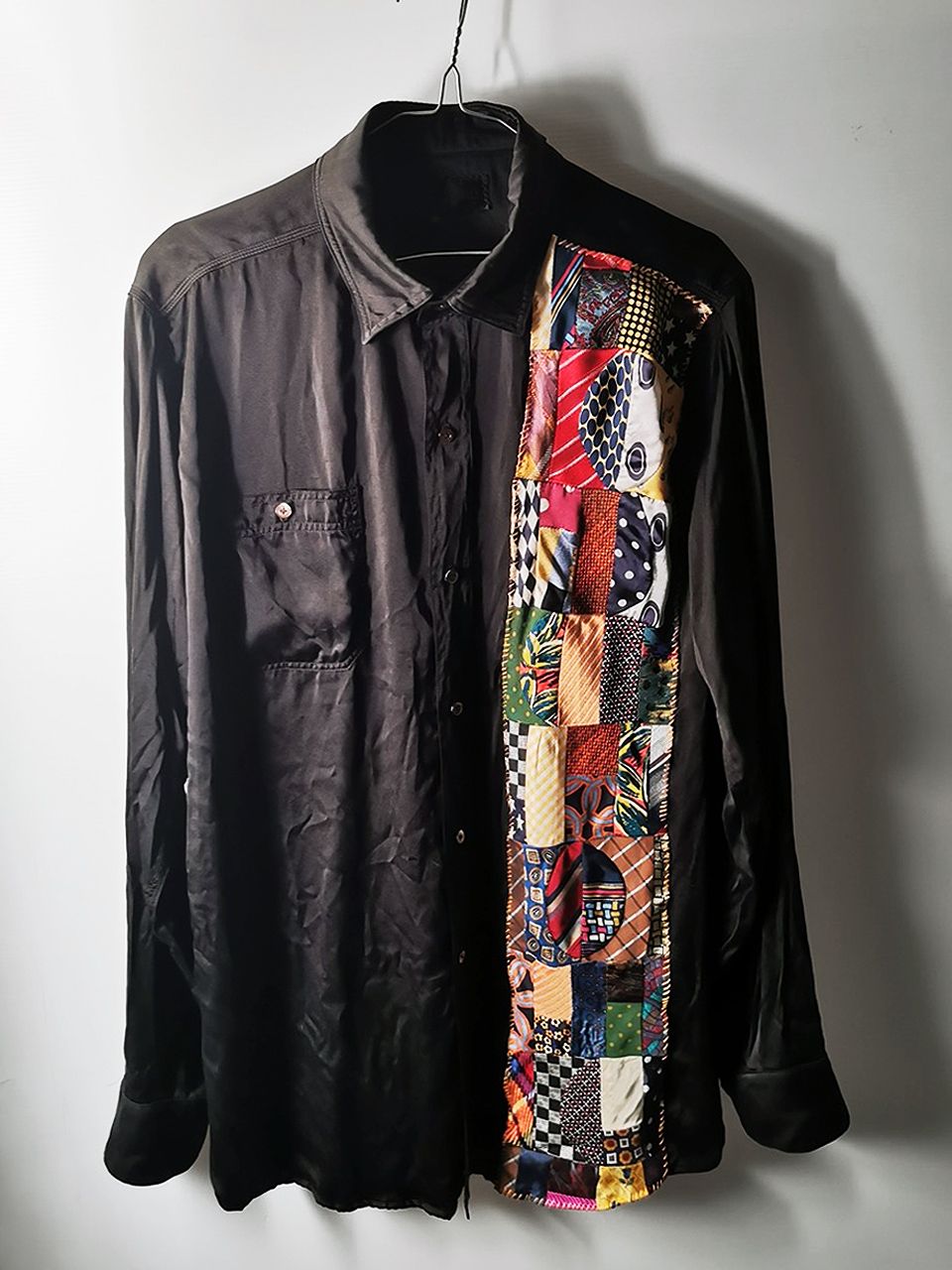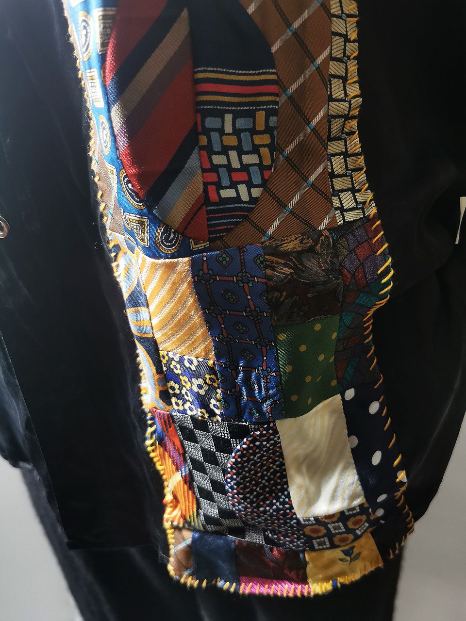 The design features real handcut vintage silk patchworks painstaking assembled in our workrooms from vintage Italian pure silk necktie designs and then attached by hand using extensive hand stitch detail work in different colored pure cotton embroidery threads that required over 6 hours of work for each shirt, expertly performed triple and double-stitch construction performed using only single-needle machinery as per the original period techniques (which required 2-4 times more work than using double or triple-needle machinery), impeccable fully clean-finished interiors...