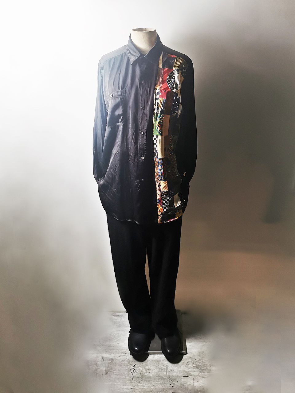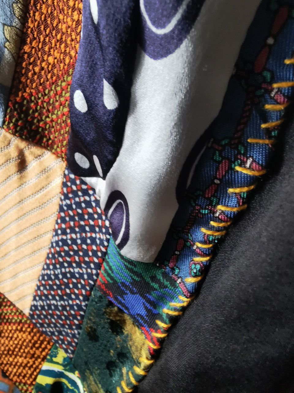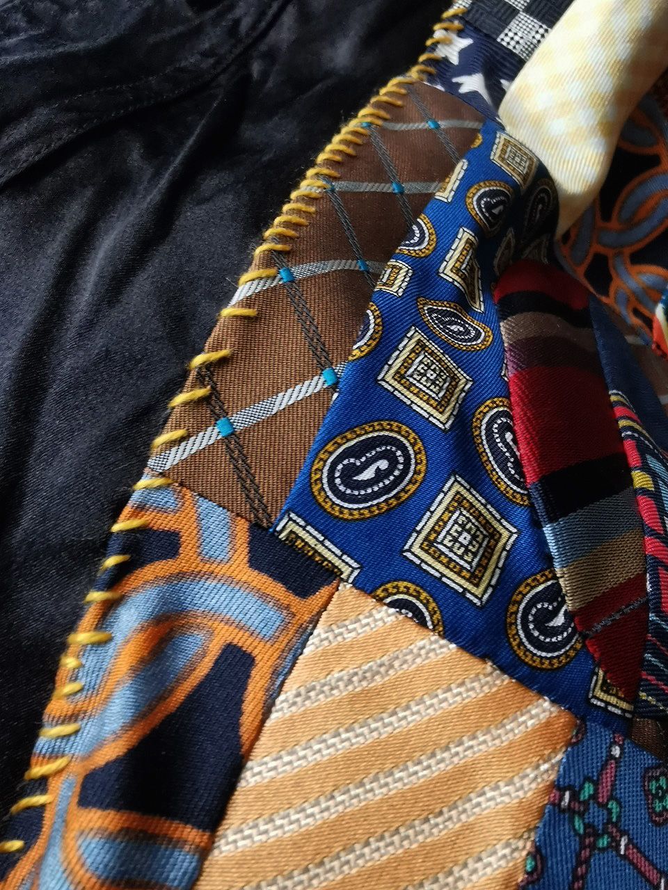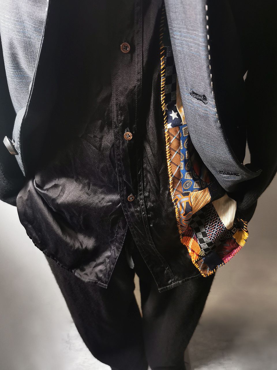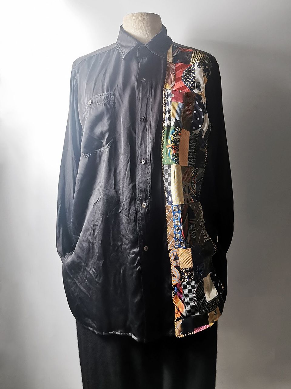The design features real handcut vintage silk patchworks painstaking assembled in our workrooms from vintage Italian pure silk necktie designs and then attached by hand using extensive hand stitch detail work in different colored pure cotton embroidery threads that required over 6 hours of work for each shirt, expertly performed triple and double-stitch construction performed using only single-needle machinery as per the original period techniques (which required 2-4 times more work than using double or triple-needle machinery), impeccable fully clean-finished interiors...