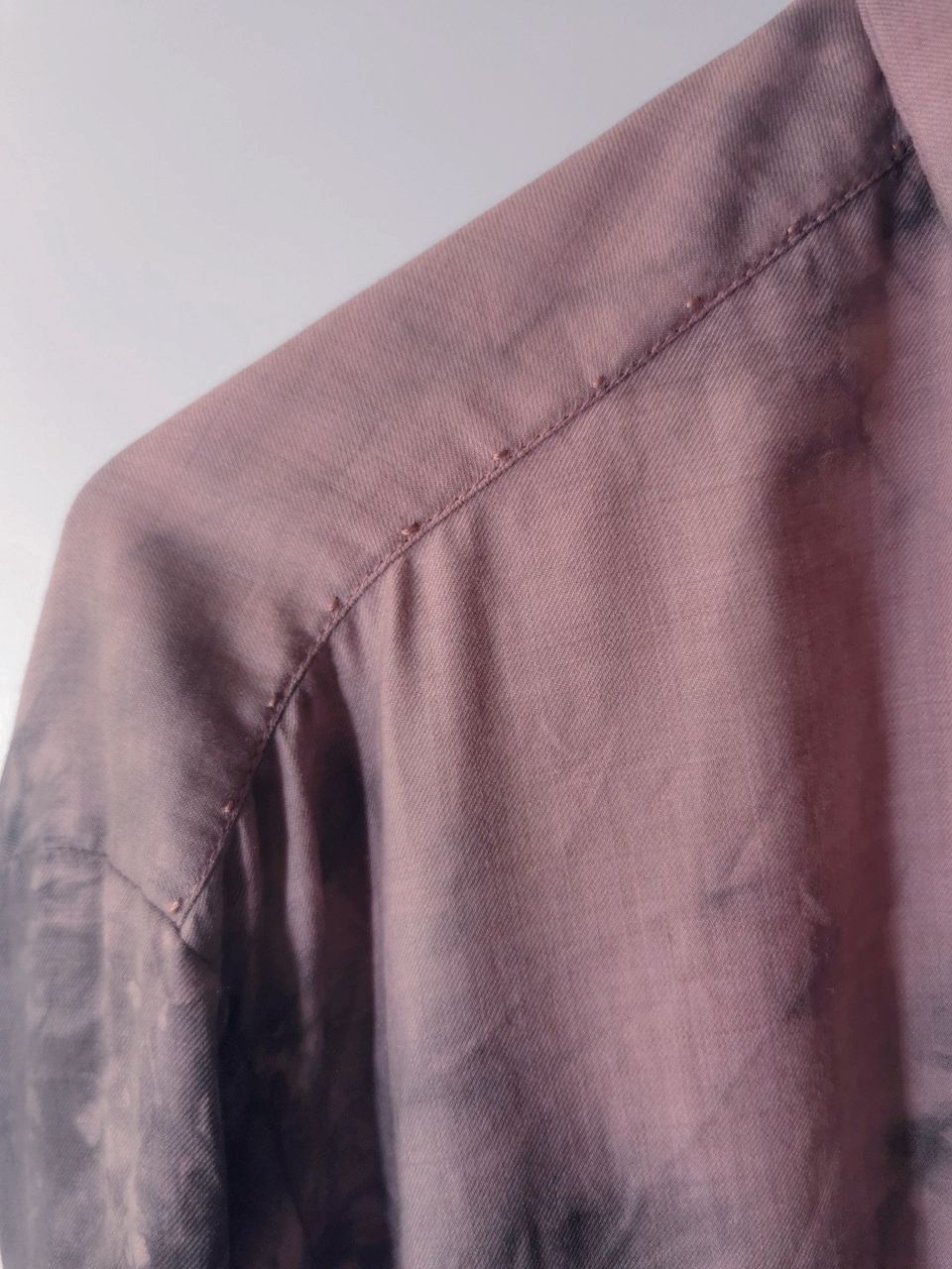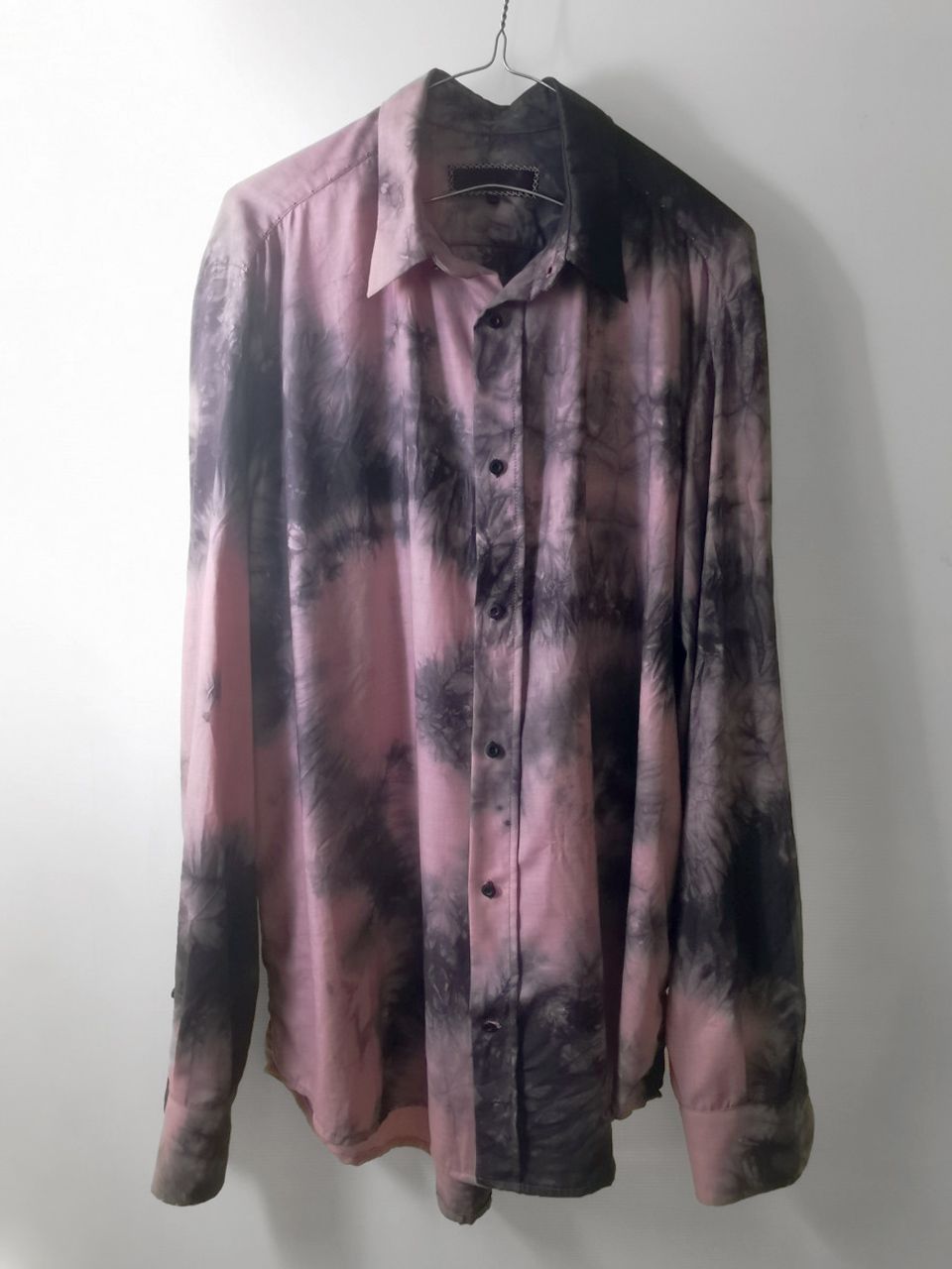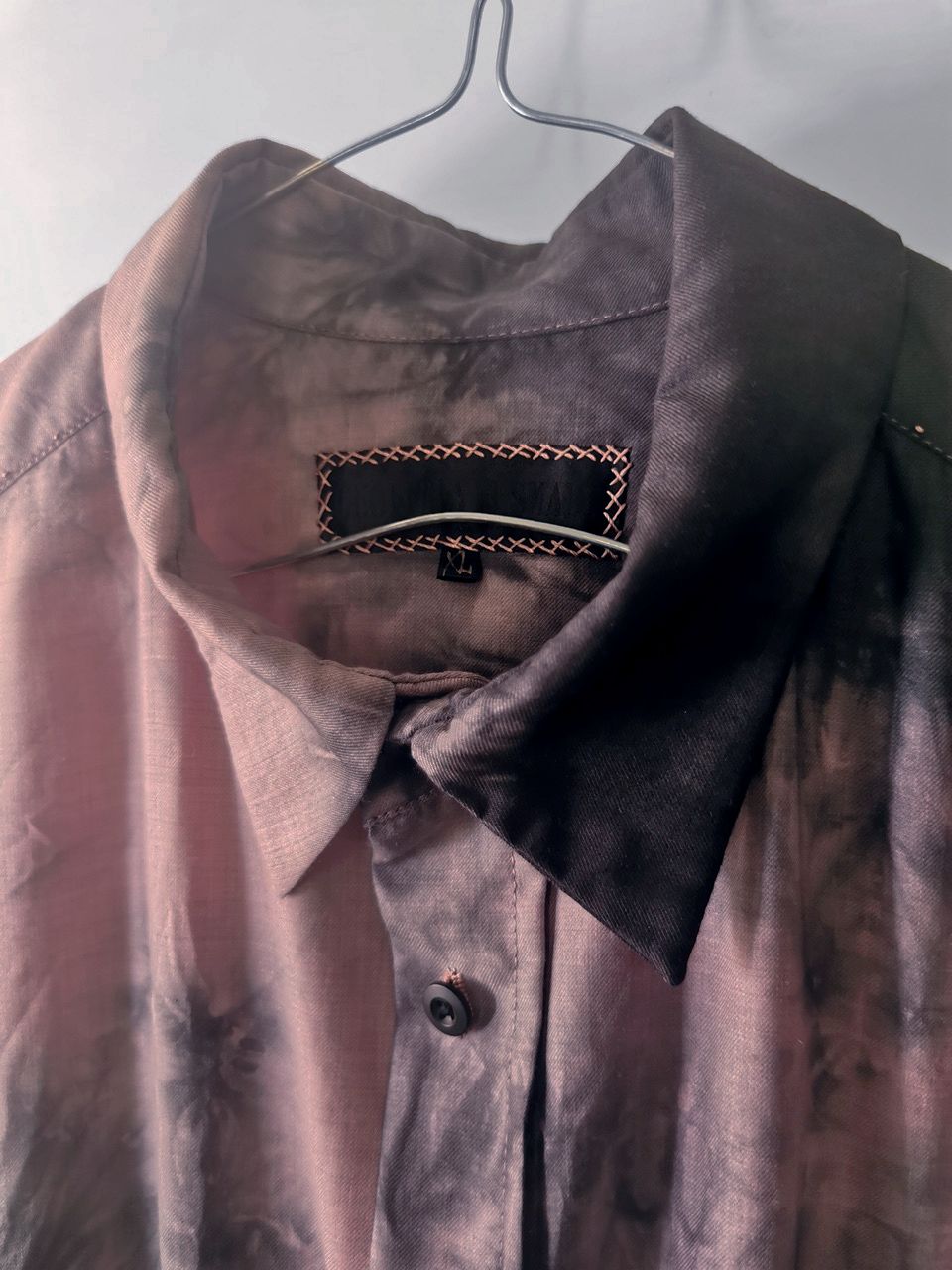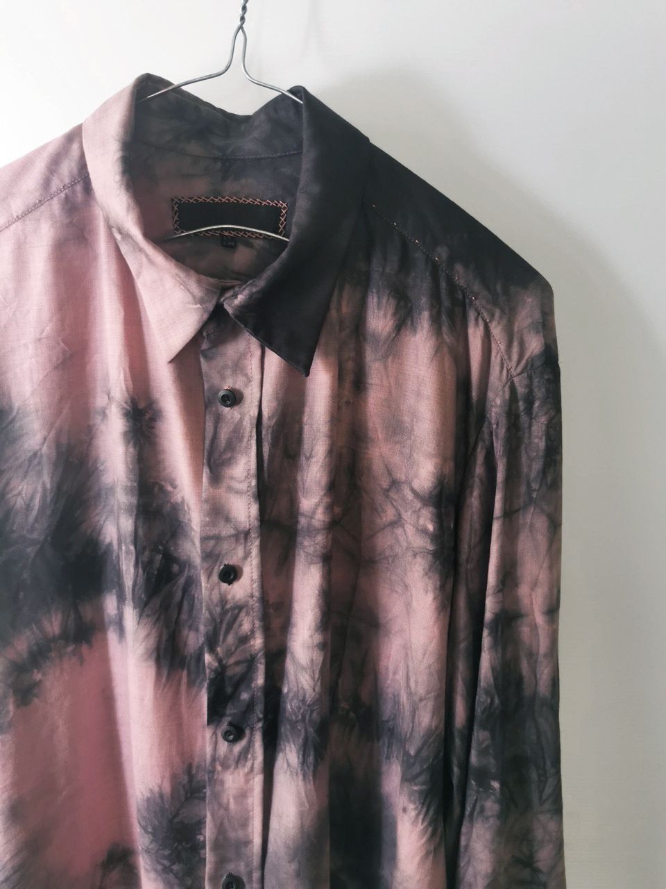 THIS very unique special version of the super limited edition RNS12 shirt design is one of only 2 pieces of its kind made by hand in the entire world. It was created exclusively from a classic European cut tailored shirt pattern from our extensive tailoring research, and cut using the lightest pure cashmere suiting cloth in the world- the superlux “Alashan Breath” pure ultralight 170gram pure cashmere fabric woven by the oldest woolen mill still operating in the world today and the world’s most renowned maker of cashmere fabrics- Fratelli Piacenza 1733 SpA in Pollone Biella... then individually specially GBS hand “accident-dyed” in our workrooms at Cavarzere Venezia using a series of advanced extreme handmade technology GBS process which required over 20 hours of highly specialized work to achieve its amazing mottled colors, patina effects, shaping, drape and incredible softness. The extreme handmade design features an impeccable classic European tailored men’s shirt cut and design, special extensive all handstitched detail work on shoulder and back yoke seams and sleeve cuffs in pure silk threads that involved over 2 and a half hours of master artisan work, expert single-needle stitching throughout, impeccably clean finished all-french-seamed interior construction, all handstitched pure silk thread label detailing work, amazing real horn shirt button designs made for us by the world’s greatest living buttonmakers- Claudio and Cinzia Fontana in Parma Italy, and no less than 12 of our signature hand sewn buttonholes (each one required 10-12 minutes to cut and sew, over 3 hours of ultra-skilled work on buttonholes and buttons for a single shirt) each in luxurious pure silk Bozzolo Reale Milano Seta threads that cost over 1.40 euros per meter for the thread alone. The piece also features our world leading pure silk label created exclusively for us by Mion SpA in Torreglia- the first label in the luxury industry to completely eliminate plastic polyester yarns in it--beautifully attached entirely by hand using pure silk threads.