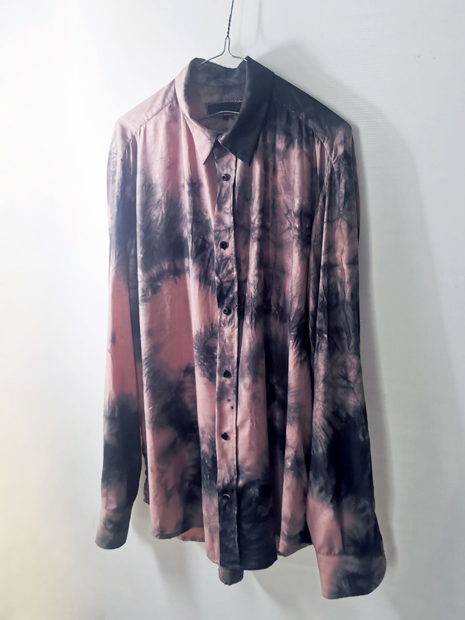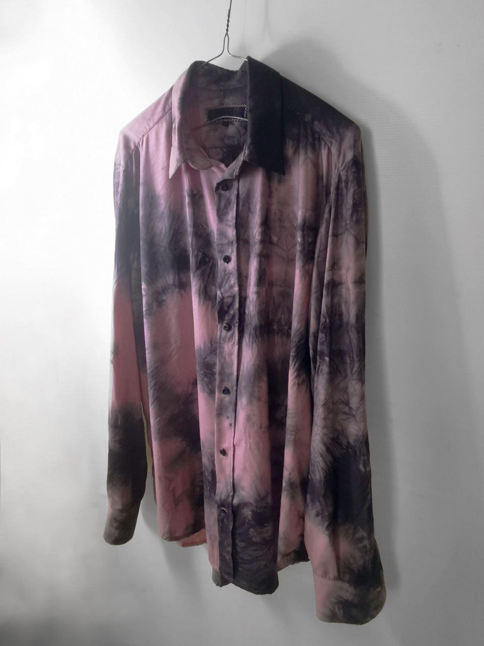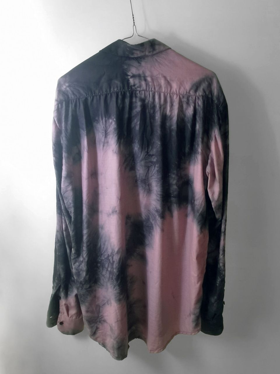 THIS very unique special version of the super limited edition RNS12 shirt design is one of only 2 pieces of its kind made by hand in the entire world. It was created exclusively from a classic European cut tailored shirt pattern from our extensive tailoring research, and cut using the lightest pure cashmere suiting cloth in the world- the superlux “Alashan Breath” pure ultralight 170gram pure cashmere fabric woven by the oldest woolen mill still operating in the world today and the world’s most renowned maker of cashmere fabrics- Fratelli Piacenza 1733 SpA in Pollone Biella... then individually specially GBS hand “accident-dyed” in our workrooms at Cavarzere Venezia using a series of advanced extreme handmade technology GBS process which required over 20 hours of highly specialized work to achieve its amazing mottled colors, patina effects, shaping, drape and incredible softness. The extreme handmade design features an impeccable classic European tailored men’s shirt cut and design, special extensive all handstitched detail work on shoulder and back yoke seams and sleeve cuffs in pure silk threads that involved over 2 and a half hours of master artisan work, expert single-needle stitching throughout, impeccably clean finished all-french-seamed interior construction, all handstitched pure silk thread label detailing work, amazing real horn shirt button designs made for us by the world’s greatest living buttonmakers- Claudio and Cinzia Fontana in Parma Italy, and no less than 12 of our signature hand sewn buttonholes (each one required 10-12 minutes to cut and sew, over 3 hours of ultra-skilled work on buttonholes and buttons for a single shirt) each in luxurious pure silk Bozzolo Reale Milano Seta threads that cost over 1.40 euros per meter for the thread alone. The piece also features our world leading pure silk label created exclusively for us by Mion SpA in Torreglia- the first label in the luxury industry to completely eliminate plastic polyester yarns in it--beautifully attached entirely by hand using pure silk threads.