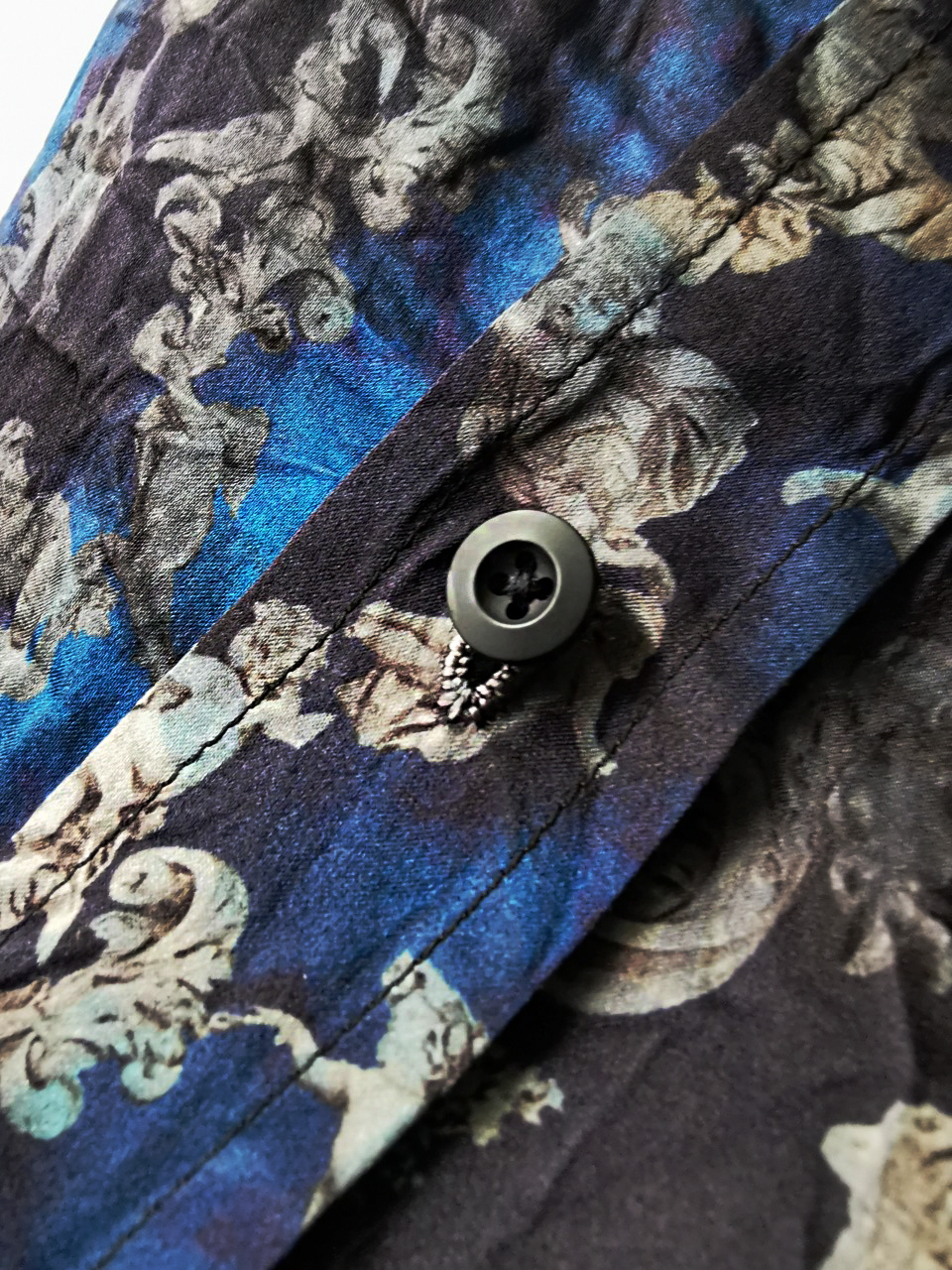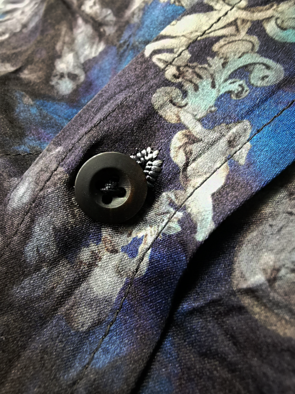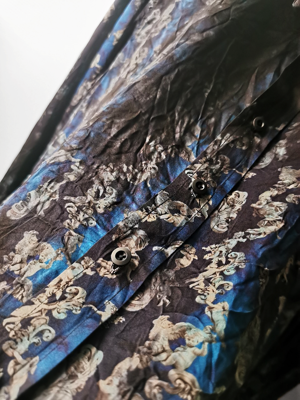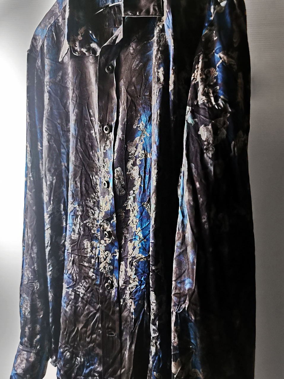 This special Evolution VI version of the super limited edition RNS12 is created by hand from our classic European-fit tailored dress shirt pattern from our extensive tailoring reseach and cut using a luxurious pure silk 16-momme raso satin exclusive Darklands Giacomo Serpotta sculptural print design made only for us by the legendary Brenna family in Como, Italy- the world’s leading center for fine silk fabric creation...then specially GBS “accident-dyed” in our world famous GBS Superworkrooms at Cavarzere Venezia using an extreme proprietary handmade technology GBS process which required over 10 hours of highly specialized work to achieve its amazing mottled colors, patina effects, shaping and softness...