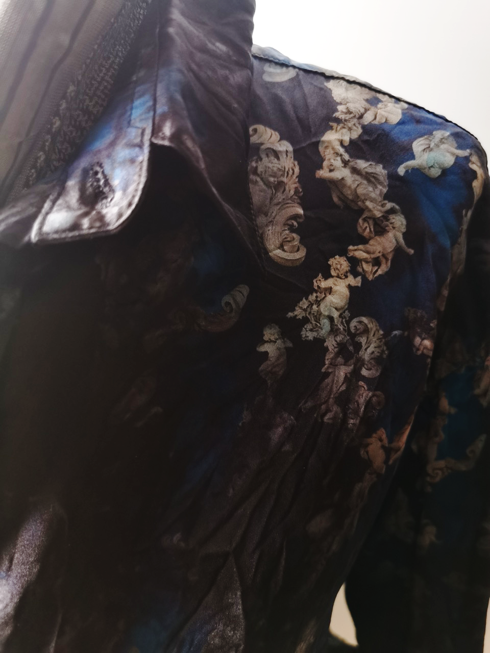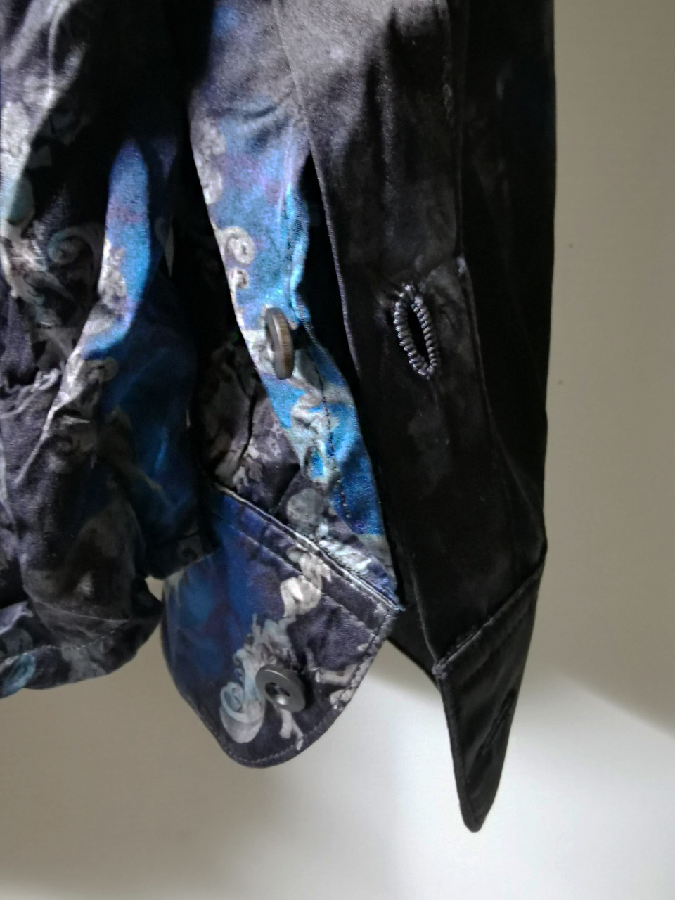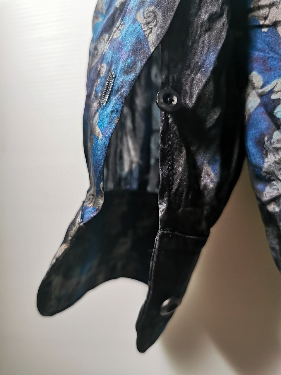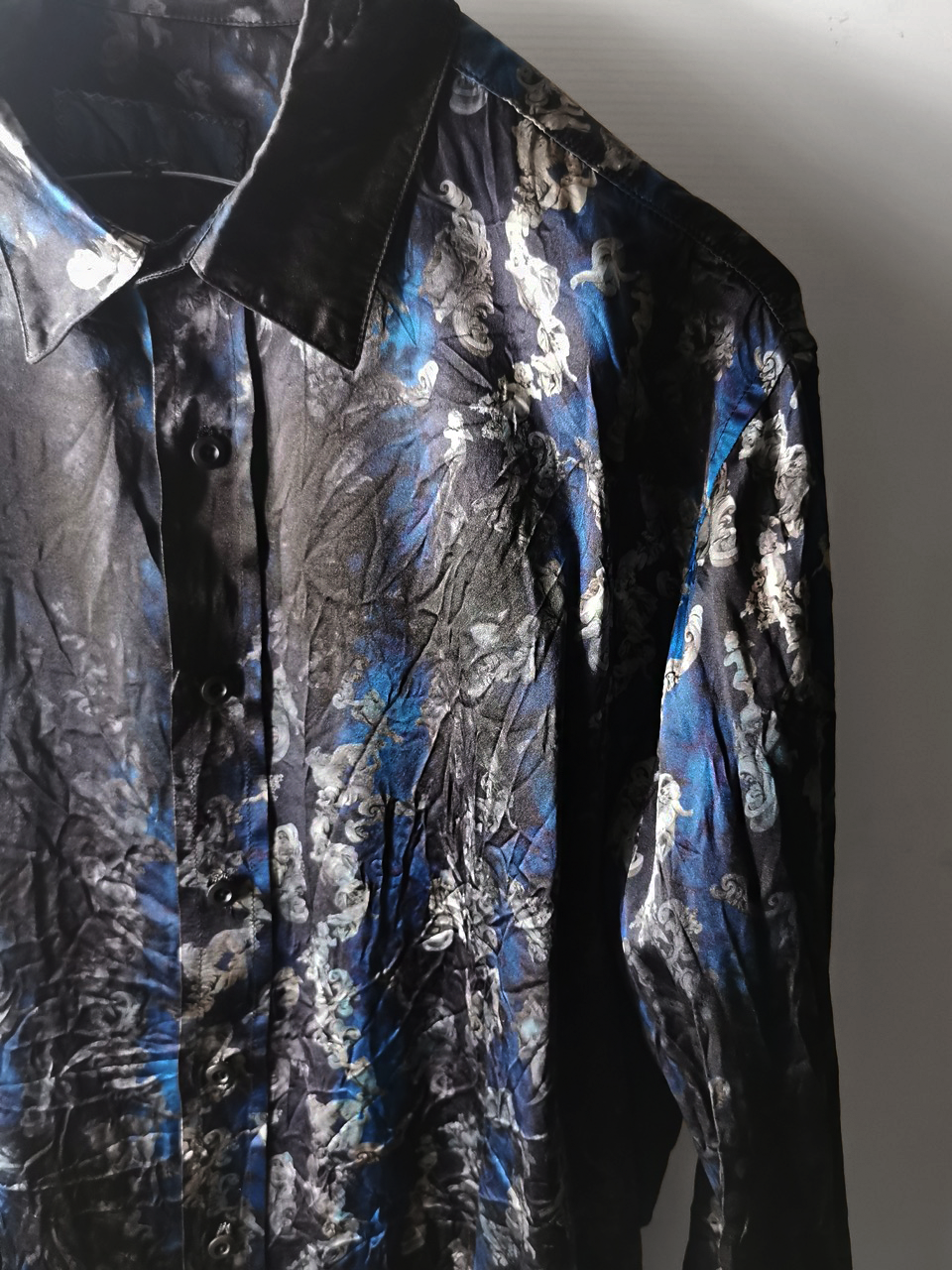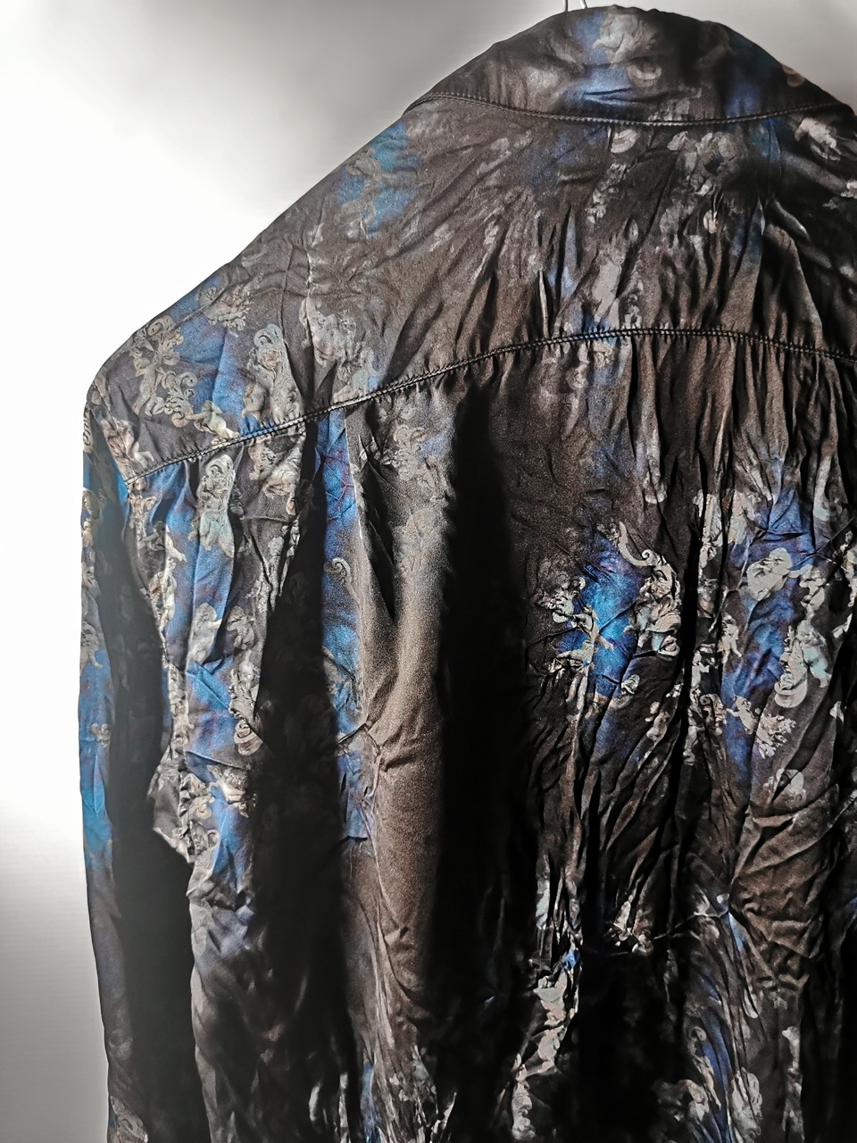 This special Evolution VI version of the super limited edition RNS12 is created by hand from our classic European-fit tailored dress shirt pattern from our extensive tailoring reseach and cut using a luxurious pure silk 16-momme raso satin exclusive Darklands Giacomo Serpotta sculptural print design made only for us by the legendary Brenna family in Como, Italy- the world’s leading center for fine silk fabric creation...then specially GBS “accident-dyed” in our world famous GBS Superworkrooms at Cavarzere Venezia using an extreme proprietary handmade technology GBS process which required over 10 hours of highly specialized work to achieve its amazing mottled colors, patina effects, shaping and softness...