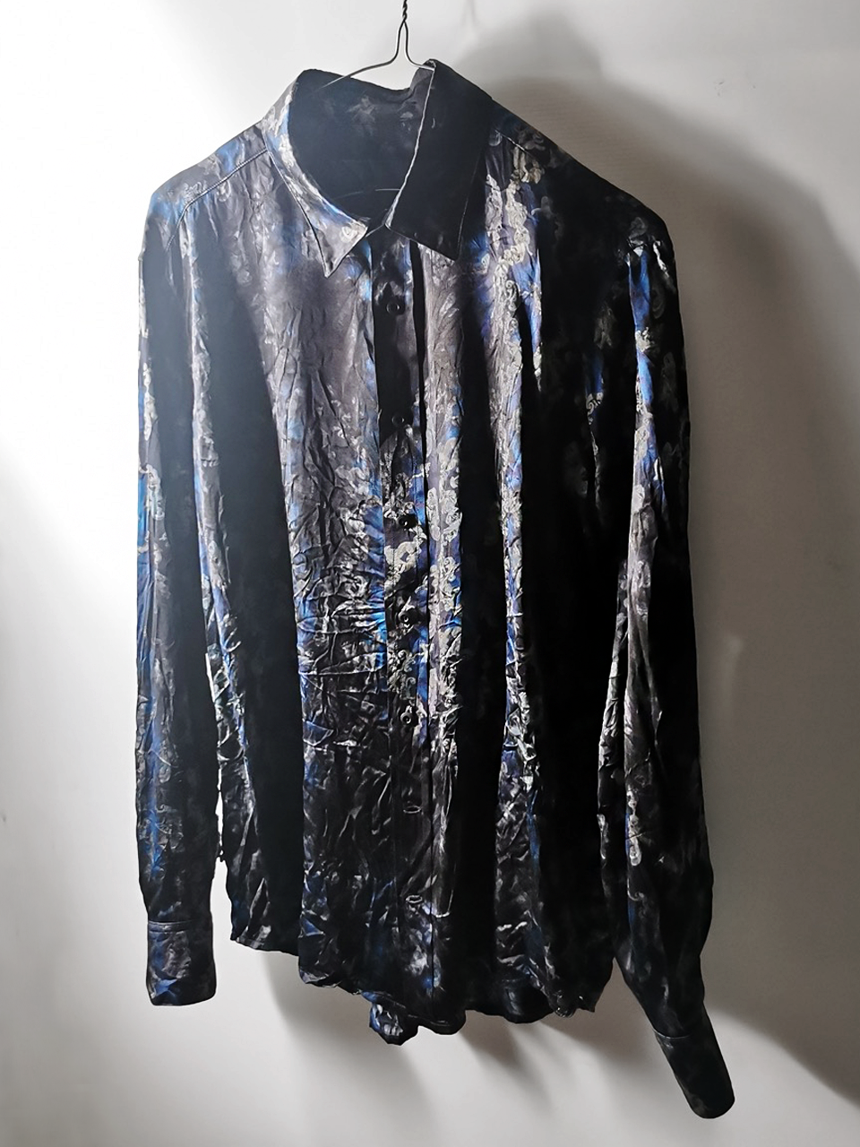 This special Evolution VI version of the super limited edition RNS12 handmade shirt design is one of only 8 pieces made for the entire world, each exclusively for Darklands in Berlin. It was created by hand using a luxurious pure silk 16-momme raso satin exclusive Darklands Giacomo Serpotta sculptural print design made only for us by the legendary Brenna family in Como, the world’s leading center for fine silk fabric creation- then individually GBS “accident-dyed” in our world famous GBS Superworkrooms at Cavarzere Venezia using our extreme handmade technology GBS process which required over 10 hours of highly specialized work to achieve its amazing mottled colors, patina effects, shaping and softness. The design features a classic European tailored men’s shirt cut and design, impeccable clean finished all French-seamed interiors, all single-needle expert construction throughout, extraordinary real horn shirt button designs made for us by the world’s greatest living buttonmakers- Claudio and Cinzia Fontana in Parma, and no less than 12 of our real hand sewn buttonholes in luxurious pure silk Bozzolo Milano Seta Reale threads (which required at least 10-12 minutes to create each one). The piece also features our world leading pure silk hand dyed label created exclusively for us by Mion SpA in Torreglia which is the first label in the luxury industry to completely eliminate plastic polyester yarns in it- beautifully attached completely by hand with pure silk threads. Variations in color and color density are not imperfections or irregularities, but specific characteristics of the special fabric, and hand making and hand dyeing technique. Please treat buttons and buttonholes with care. We recommend professional clean only or hand wash cold water and protecting buttons with foil or plastic wrap when washing. Do not put in washing machine or machine dryer.