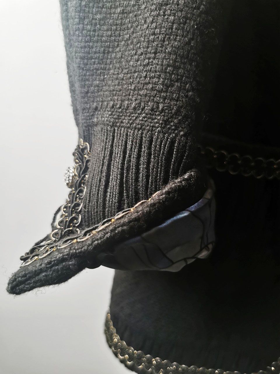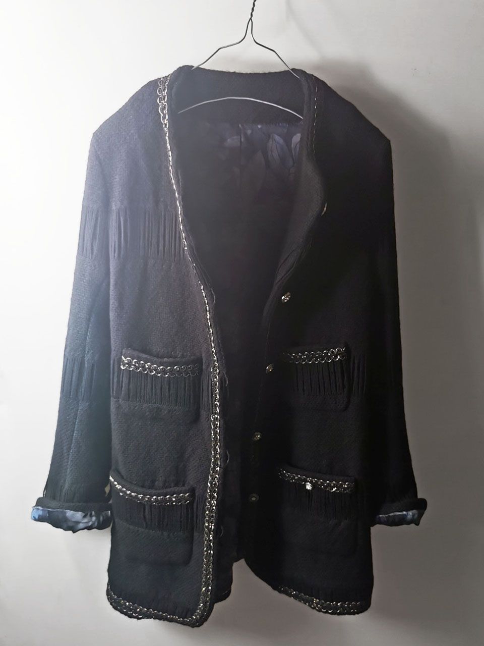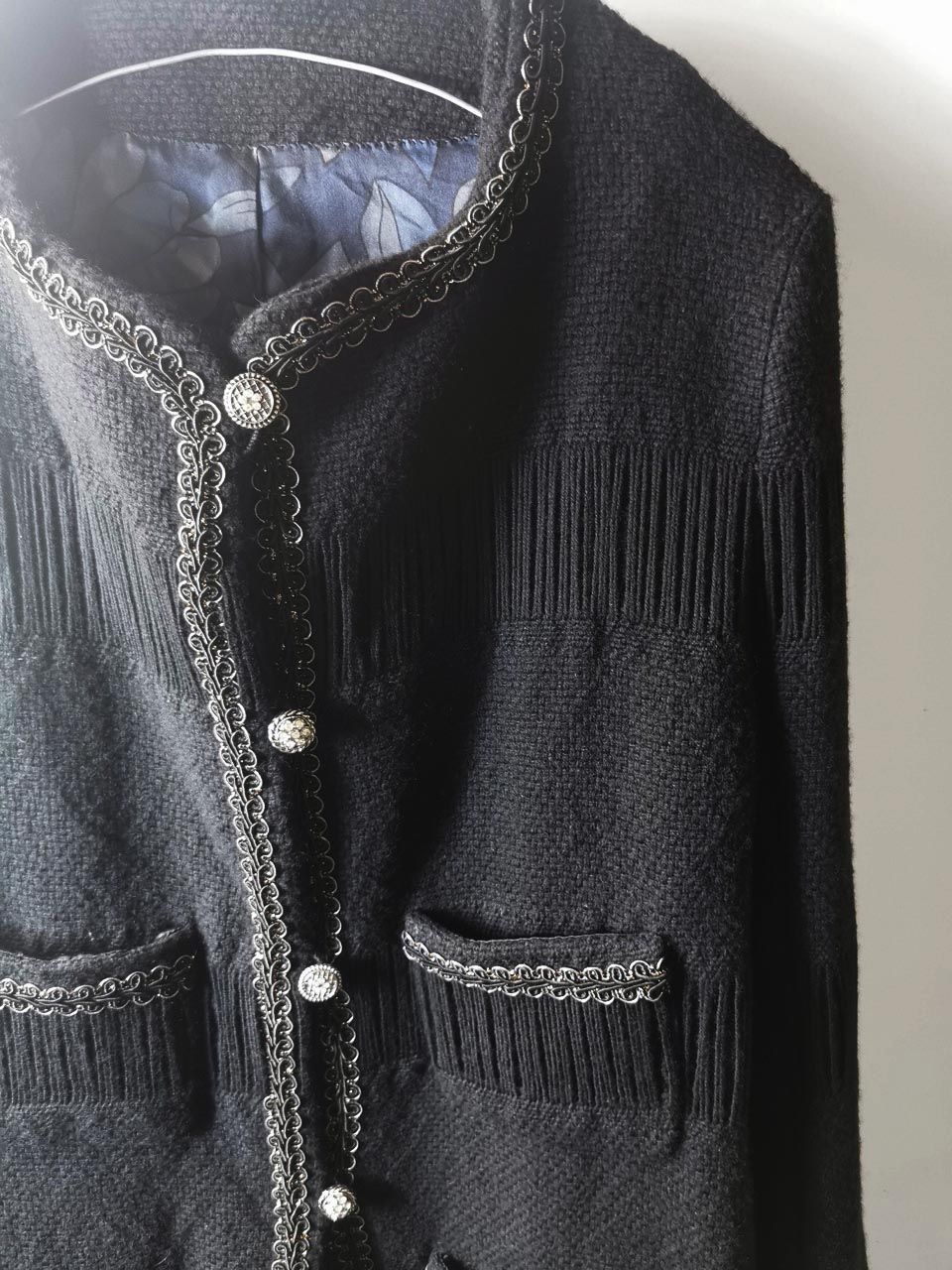 THIS special hand dyed black version of the super limited edition RSWJ05 handmade jacket design is one of only 2 pieces of its kind made by hand in the entire world, each exclusively from a design that was created specially for the 2016 “Examen Reginae” collection, the most extreme hand built women’s collection ever presented in Paris for ready to wear. It was made using our original modified mid-length late 20th century single-breasted 5-button 4-pocket jacket pattern from our extensive tailoring research...