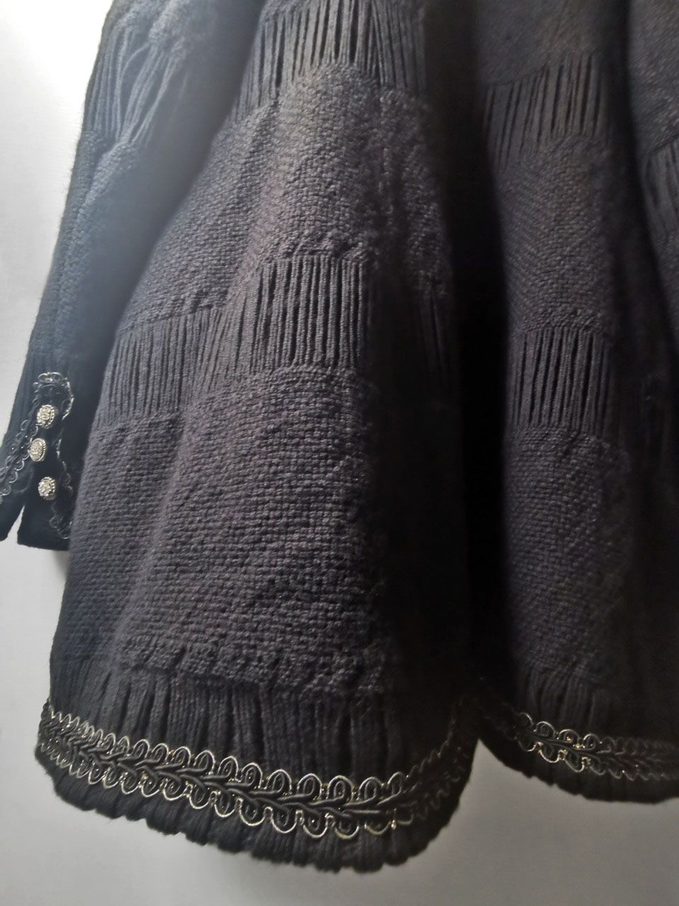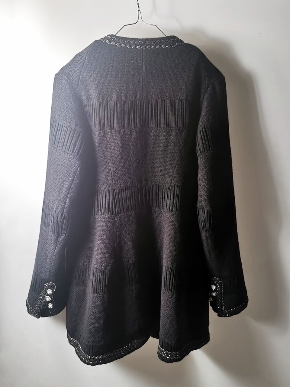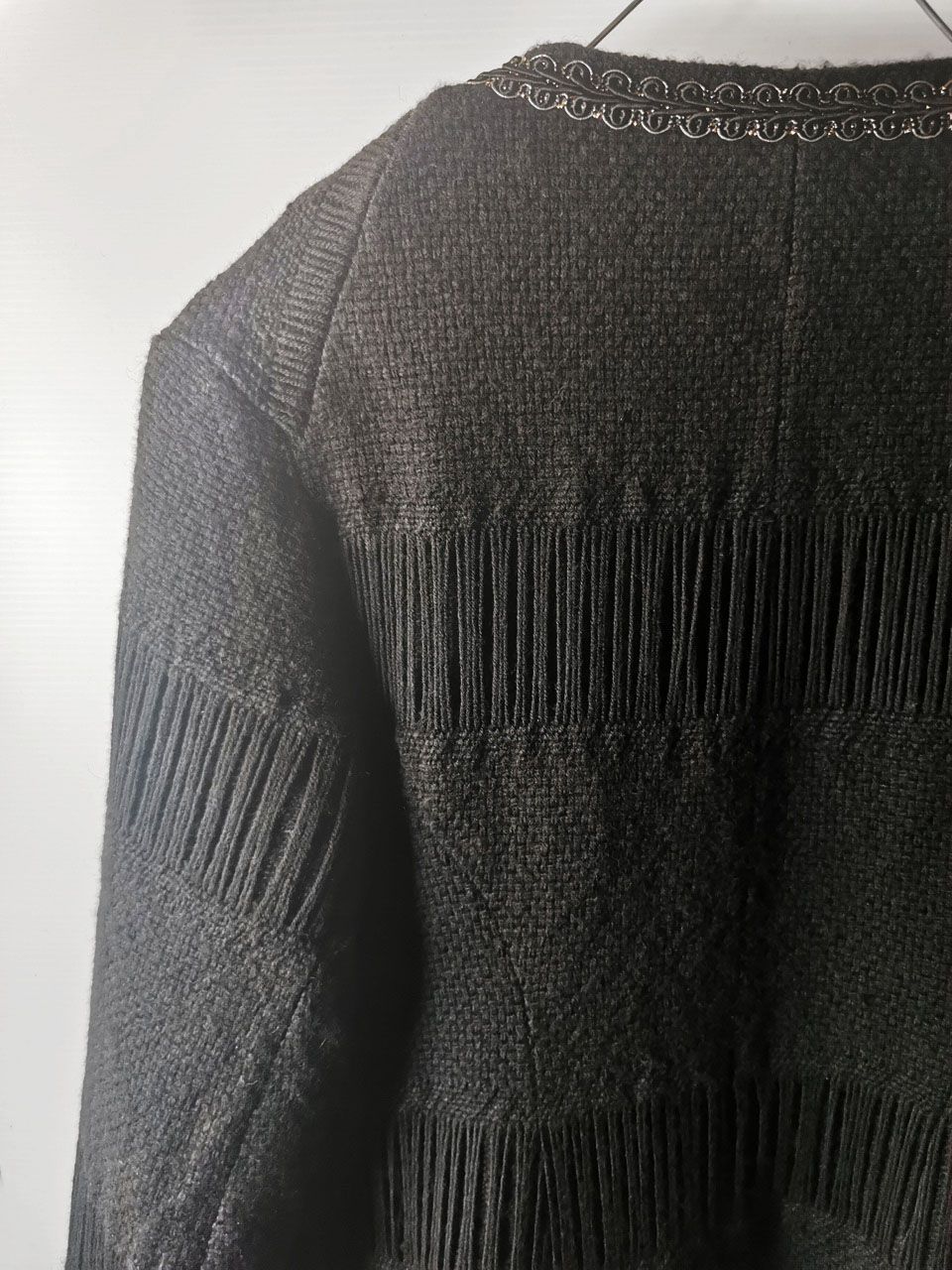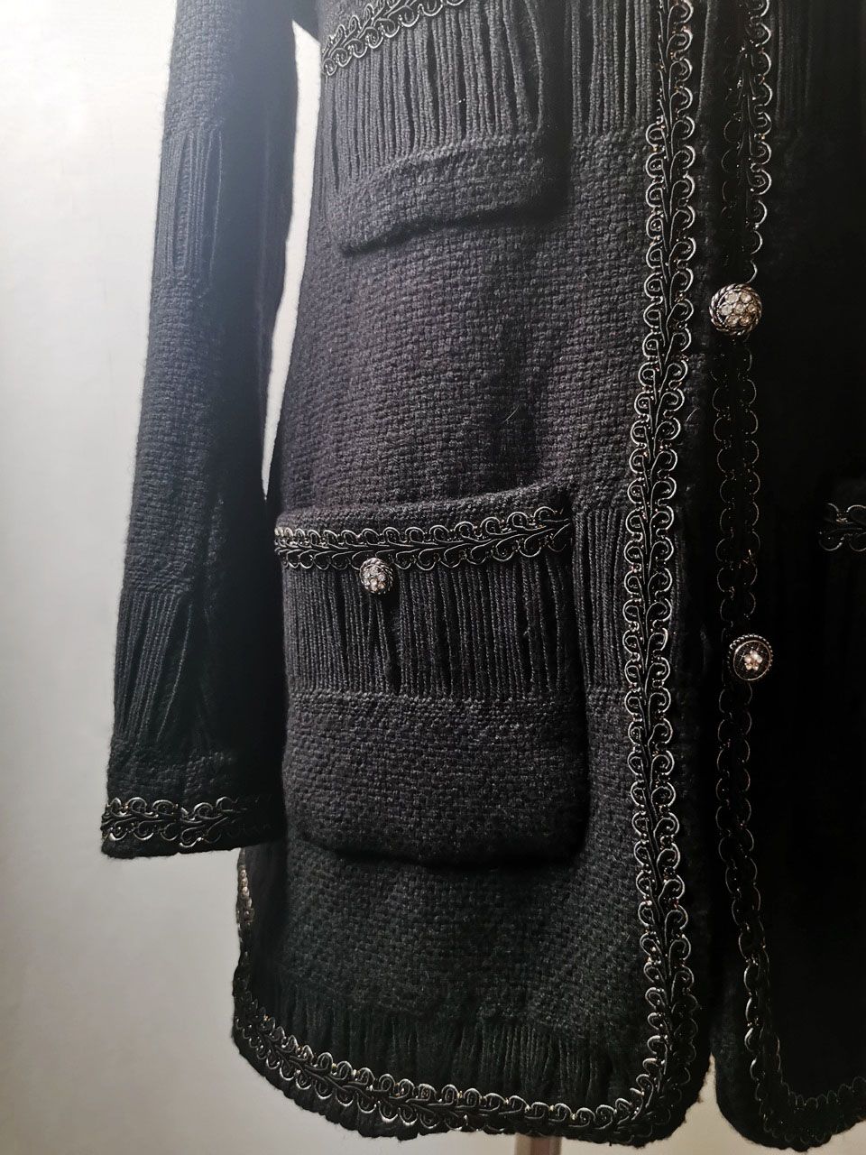 THIS special hand dyed black version of the super limited edition RSWJ05 handmade jacket design is one of only 2 pieces of its kind made by hand in the entire world, each exclusively from a design that was created specially for the 2016 “Examen Reginae” collection, the most extreme hand built women’s collection ever presented in Paris for ready to wear. It was made using our original modified mid-length late 20th century single-breasted 5-button 4-pocket jacket pattern from our extensive tailoring research, and individually cut by hand using an amazing exclusive “jump weave” design fabric entirely woven by hand using pure Merino wool yarns by Carlo Colombo at Tessitura La Colombina in Badoere di Morgano, where it takes 3 days working on one of the original 18th century looms carefully kept and maintained for generations to make enough cloth just to make a single jacket. It was then fully-lined with luxury pure silk 16 momme raso satin exclusive abstract floral print design made only for us by the legendary Brenna from Como Italy--the world’s leading center for fine silk fabric creation--then specially double hand dyed in our world-famous GBS Superworkrooms at Cavarzere Venezia with a painstaking process which required over 2 full days to achieve its beautiful black and mottled lining colors, patina effects, shaping and softness. The design features exquisite interior metal hem chains made exclusively for us in Padova attached to the bodice hemlines all by our extreme skill handwork, entirely hand sewn pockets and luxury metallicized Venetian lace and trim details all around jacket fronts-sleeves-pockets also attached entirely by hand, beautiful handstitched detailing work all around the interior linings and facings, stunning jeweled buttons made exclusively for us in Padova, Italy-- and no less than 13 of our signature silk hand-stitched buttonholes and button loops (each one required 12-18 minutes to cut and sew each one on the challenging handwoven fabric) in luxurious pure silk Bozzolo Reale Milano Seta threads. The special piece is handsigned and numbered by the designer and also features our world leading pure silk label created exclusively for us by Mion SpA in Torreglia which is the first label in the luxury industry to completely eliminate plastic polyester yarns in it—beautifully attached all by hand using pure silk thread. Variations in color and color density, as well as various yarn and weave disparities, are not imperfections or irregularities, but specific characteristics of the special fabric, and hand making technique. Please treat buttons and buttonholes with extreme care. We recommend professional clean only or hand wash cold water and protecting buttons with foil or plastic wrap when washing. Do not put in washing machine or machine dryer.