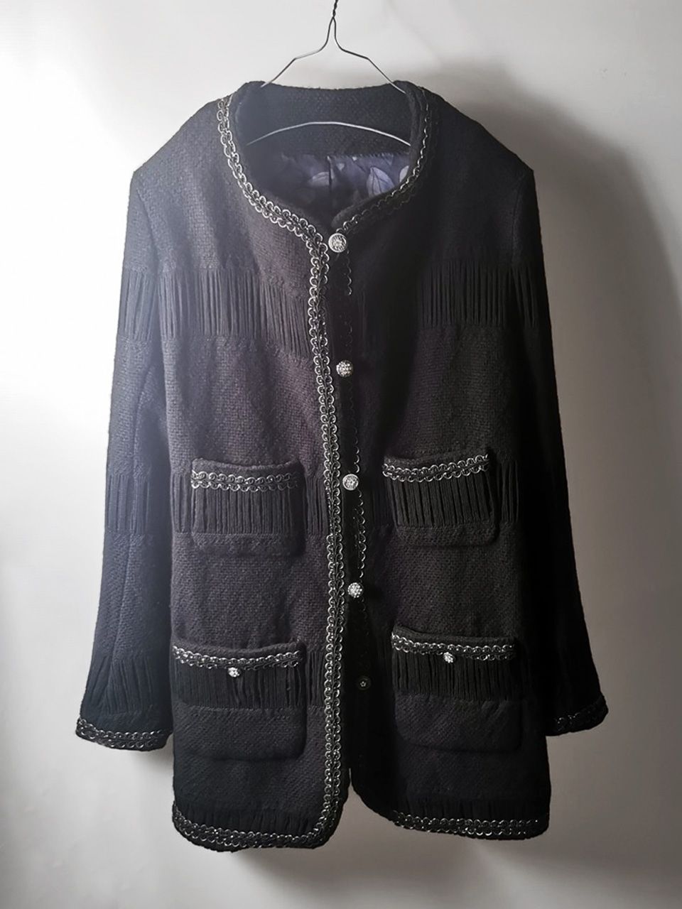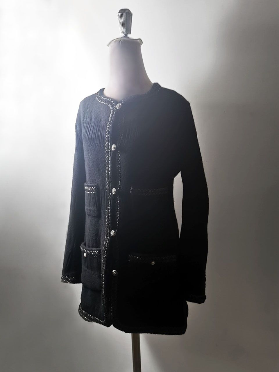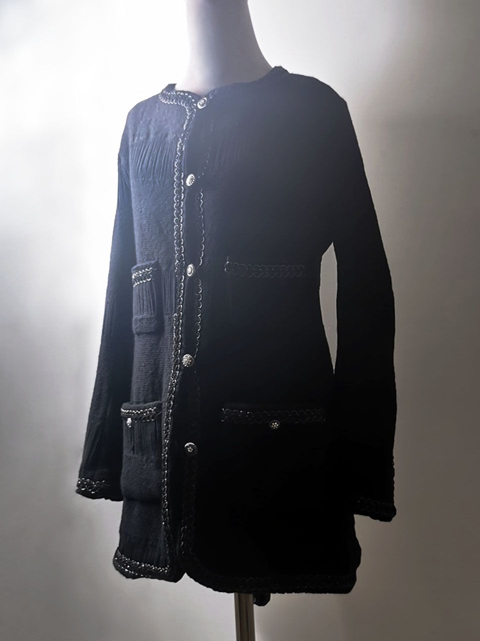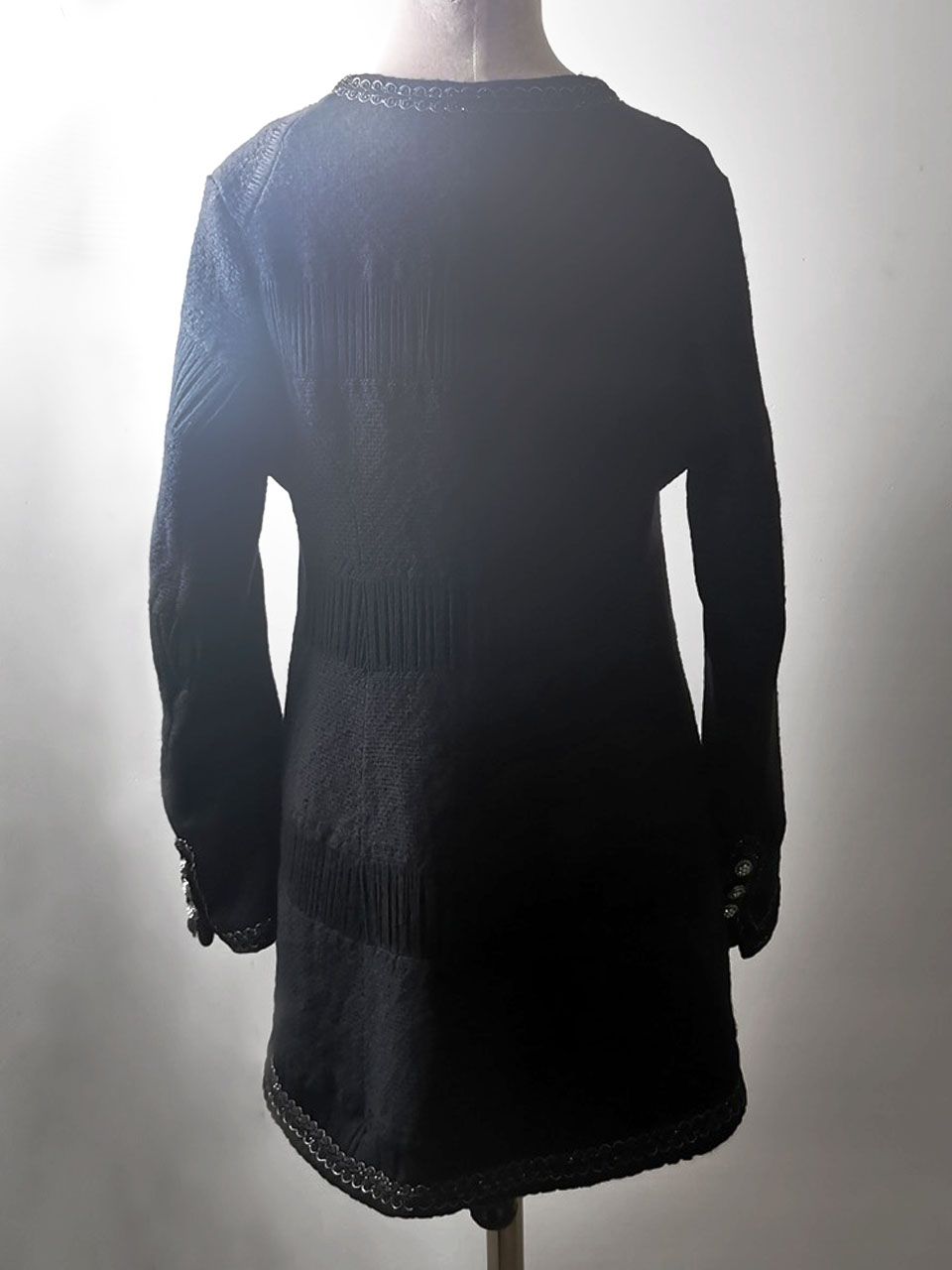THIS special hand dyed black version of the super limited edition RSWJ05 handmade jacket design is one of only 2 pieces of its kind made by hand in the entire world, each exclusively from a design that was created specially for the 2016 “Examen Reginae” collection, the most extreme hand built women’s collection ever presented in Paris for ready to wear. It was made using our original modified mid-length late 20th century single-breasted 5-button 4-pocket jacket pattern from our extensive tailoring research, and individually cut by hand using an amazing exclusive “jump weave” design fabric entirely woven by hand using pure Merino wool yarns by Carlo Colombo at Tessitura La Colombina in Badoere di Morgano, where it takes 3 days working on one of the original 18th century looms carefully kept and maintained for generations to make enough cloth just to make a single jacket. It was then fully-lined with luxury pure silk 16 momme raso satin exclusive abstract floral print design made only for us by the legendary Brenna from Como Italy--the world’s leading center for fine silk fabric creation--then specially double hand dyed in our world-famous GBS Superworkrooms at Cavarzere Venezia with a painstaking process which required over 2 full days to achieve its beautiful black and mottled lining colors, patina effects, shaping and softness. The design features exquisite interior metal hem chains made exclusively for us in Padova attached to the bodice hemlines all by our extreme skill handwork, entirely hand sewn pockets and luxury metallicized Venetian lace and trim details all around jacket fronts-sleeves-pockets also attached entirely by hand, beautiful handstitched detailing work all around the interior linings and facings, stunning jeweled buttons made exclusively for us in Padova, Italy-- and no less than 13 of our signature silk hand-stitched buttonholes and button loops (each one required 12-18 minutes to cut and sew each one on the challenging handwoven fabric) in luxurious pure silk Bozzolo Reale Milano Seta threads. The special piece is handsigned and numbered by the designer and also features our world leading pure silk label created exclusively for us by Mion SpA in Torreglia which is the first label in the luxury industry to completely eliminate plastic polyester yarns in it—beautifully attached all by hand using pure silk thread. Variations in color and color density, as well as various yarn and weave disparities, are not imperfections or irregularities, but specific characteristics of the special fabric, and hand making technique. Please treat buttons and buttonholes with extreme care. We recommend professional clean only or hand wash cold water and protecting buttons with foil or plastic wrap when washing. Do not put in washing machine or machine dryer.