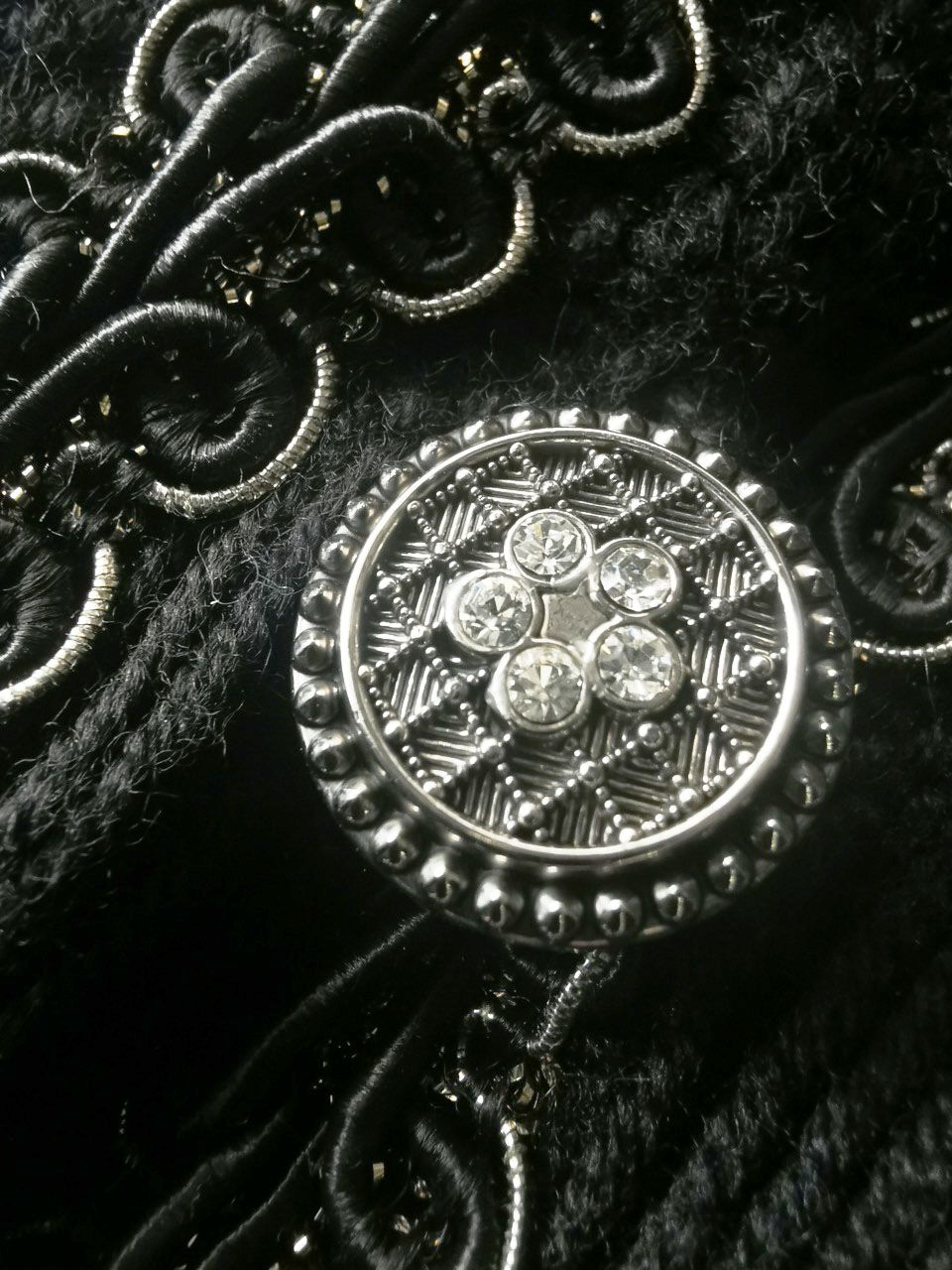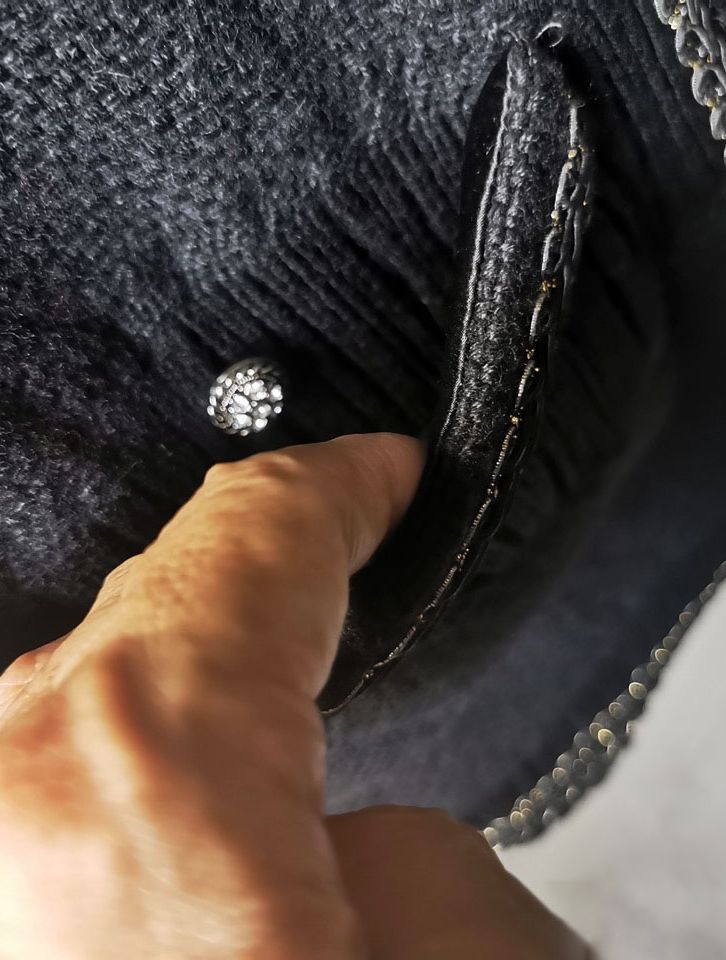 ...stunning jeweled buttons made exclusively for us in Padova, Italy-- and no less than 13 of our signature silk hand-stitched buttonholes and button loops (each one required 12-18 minutes to cut and sew each one on the challenging handwoven fabric) in luxurious pure silk Bozzolo Reale Milano Seta threads...