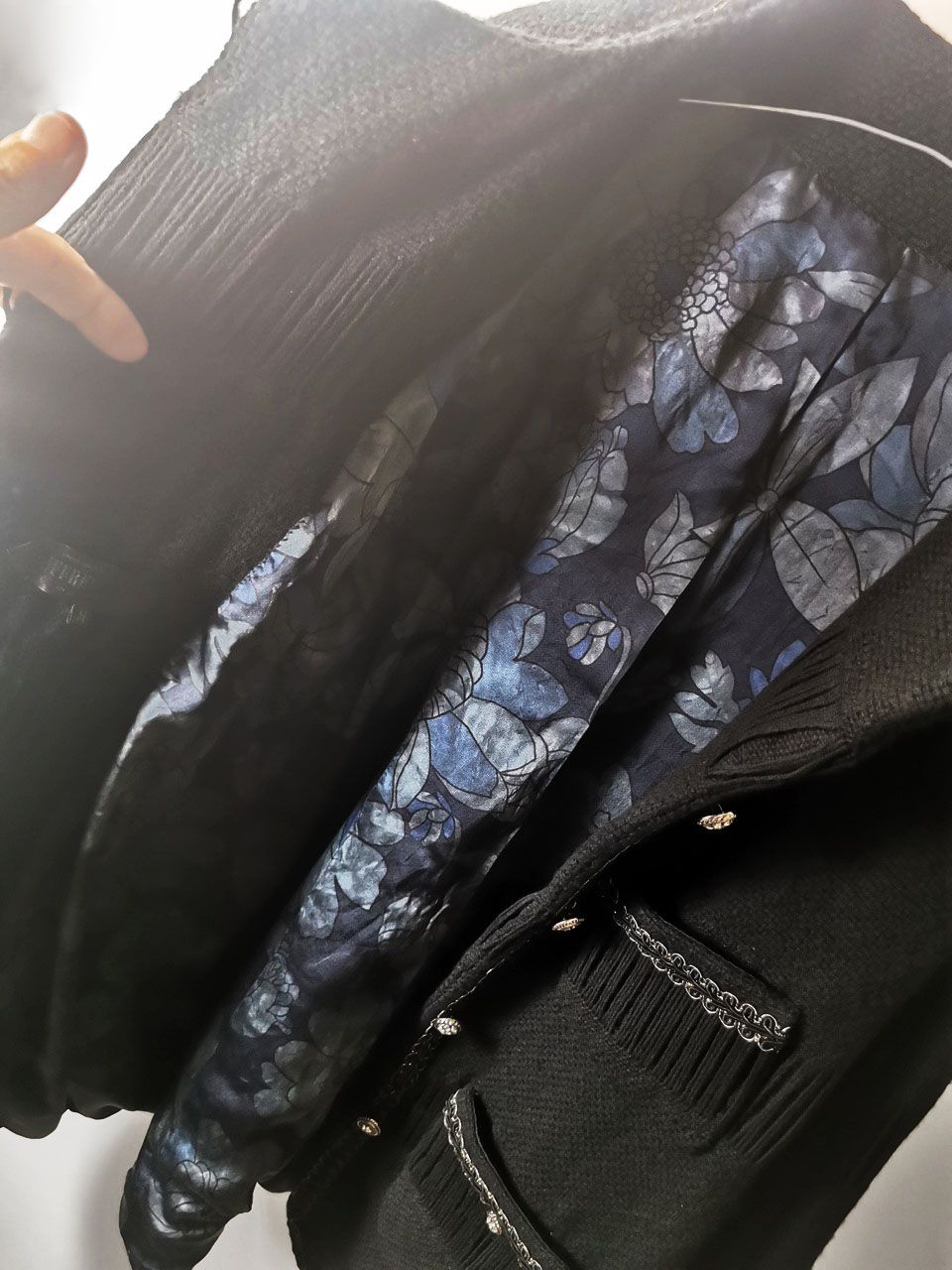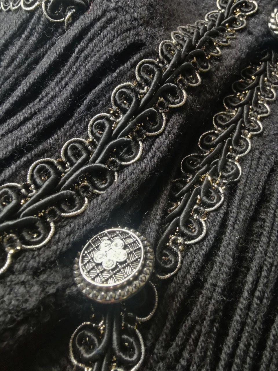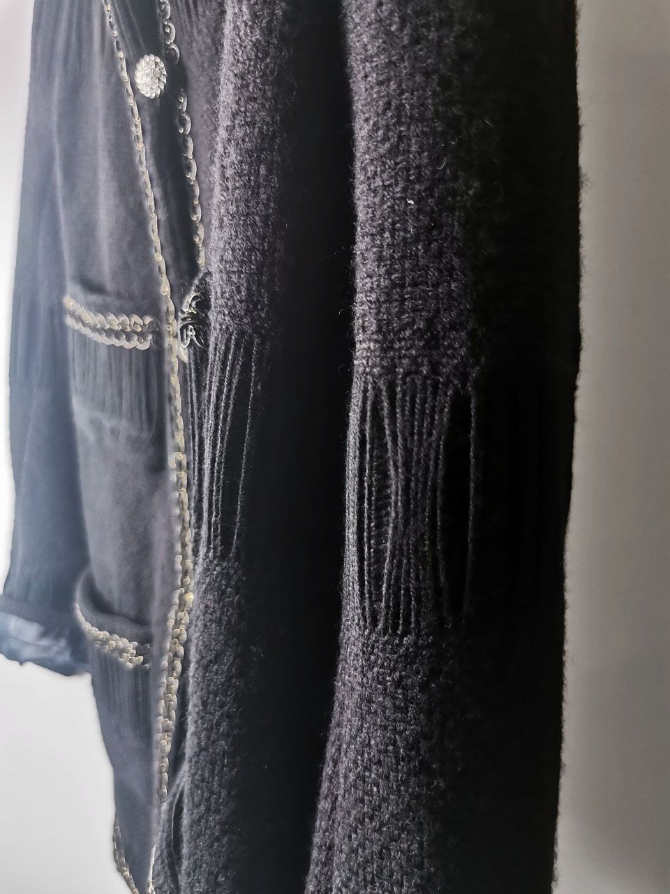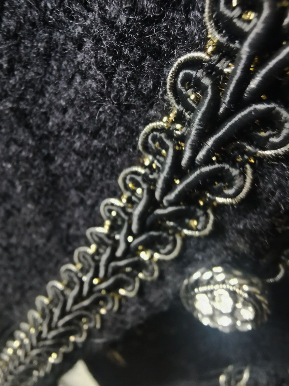 The design features exquisite interior metal hem chains made exclusively for us in Padova attached to the bodice hemlines all by our extreme skill handwork, entirely hand sewn pockets and luxury metallicized Venetian lace and trim details all around jacket fronts-sleeves-pockets also attached entirely by hand, beautiful handstitched detailing work all around the interior linings and facings...