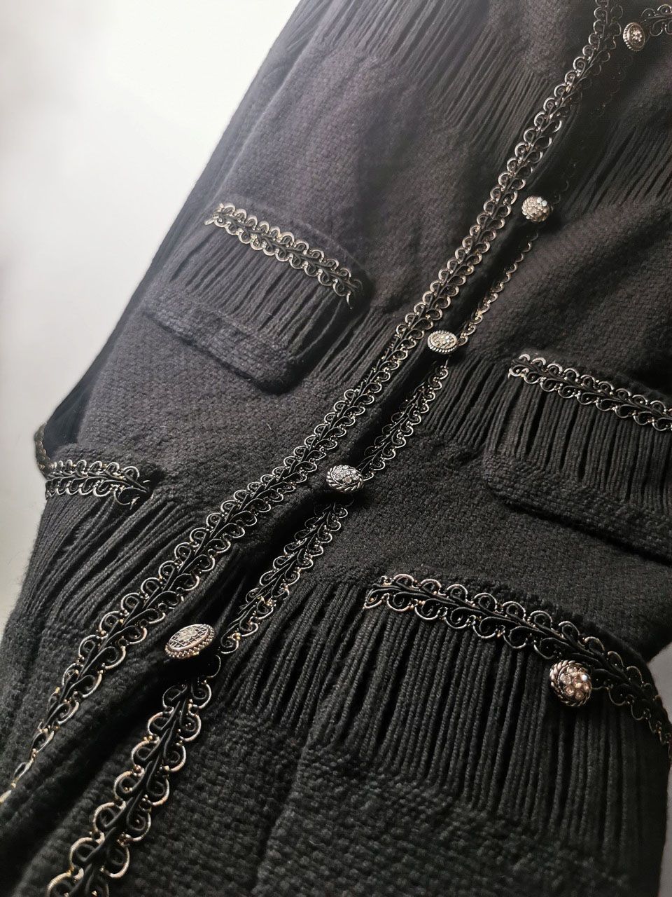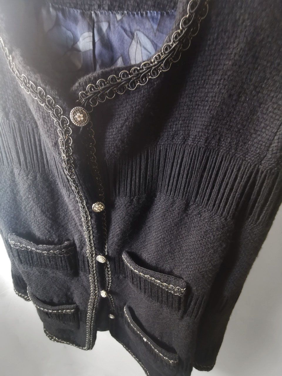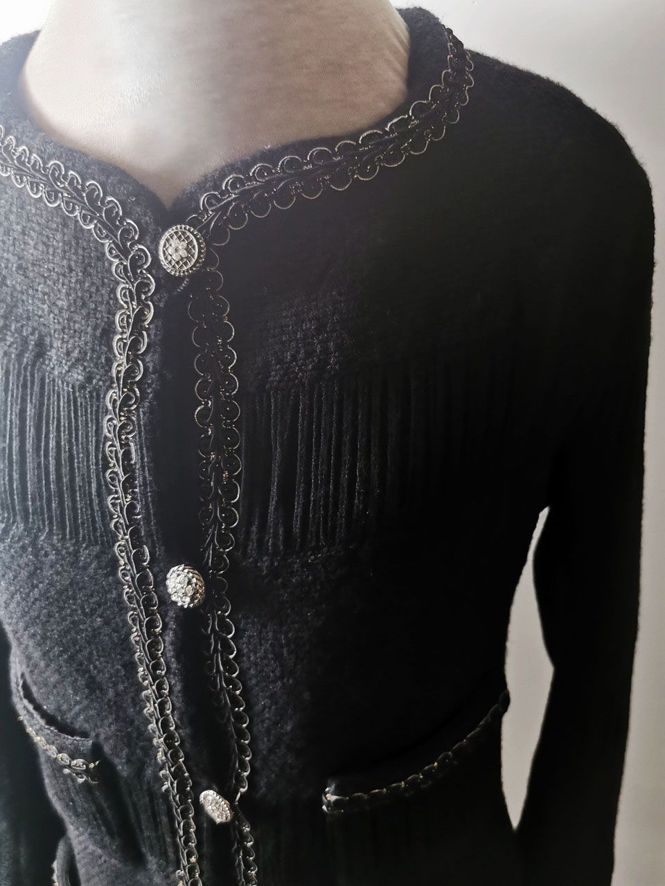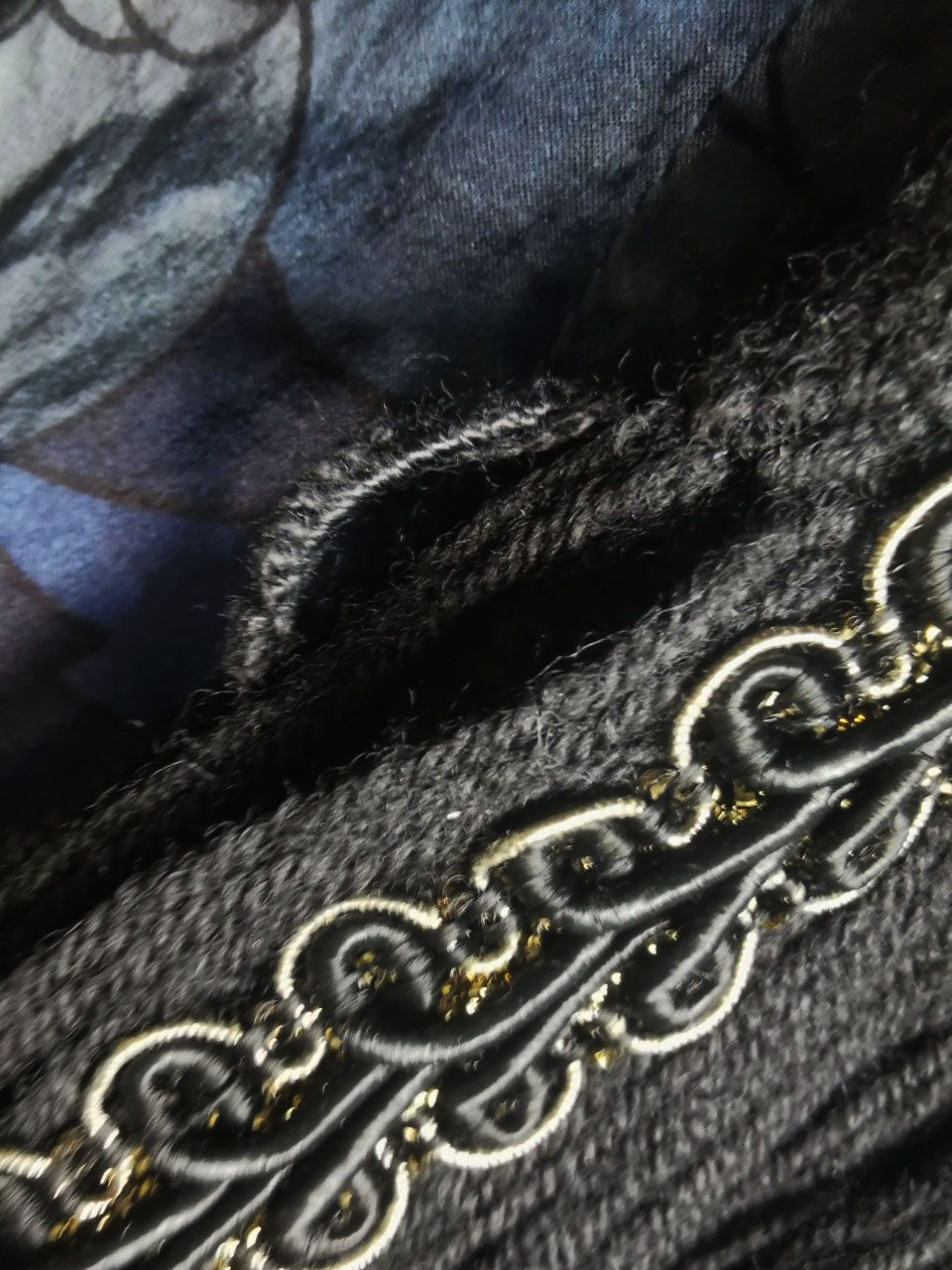 The design features exquisite interior metal hem chains made exclusively for us in Padova attached to the bodice hemlines all by our extreme skill handwork, entirely hand sewn pockets and luxury metallicized Venetian lace and trim details all around jacket fronts-sleeves-pockets also attached entirely by hand, beautiful handstitched detailing work all around the interior linings and facings...