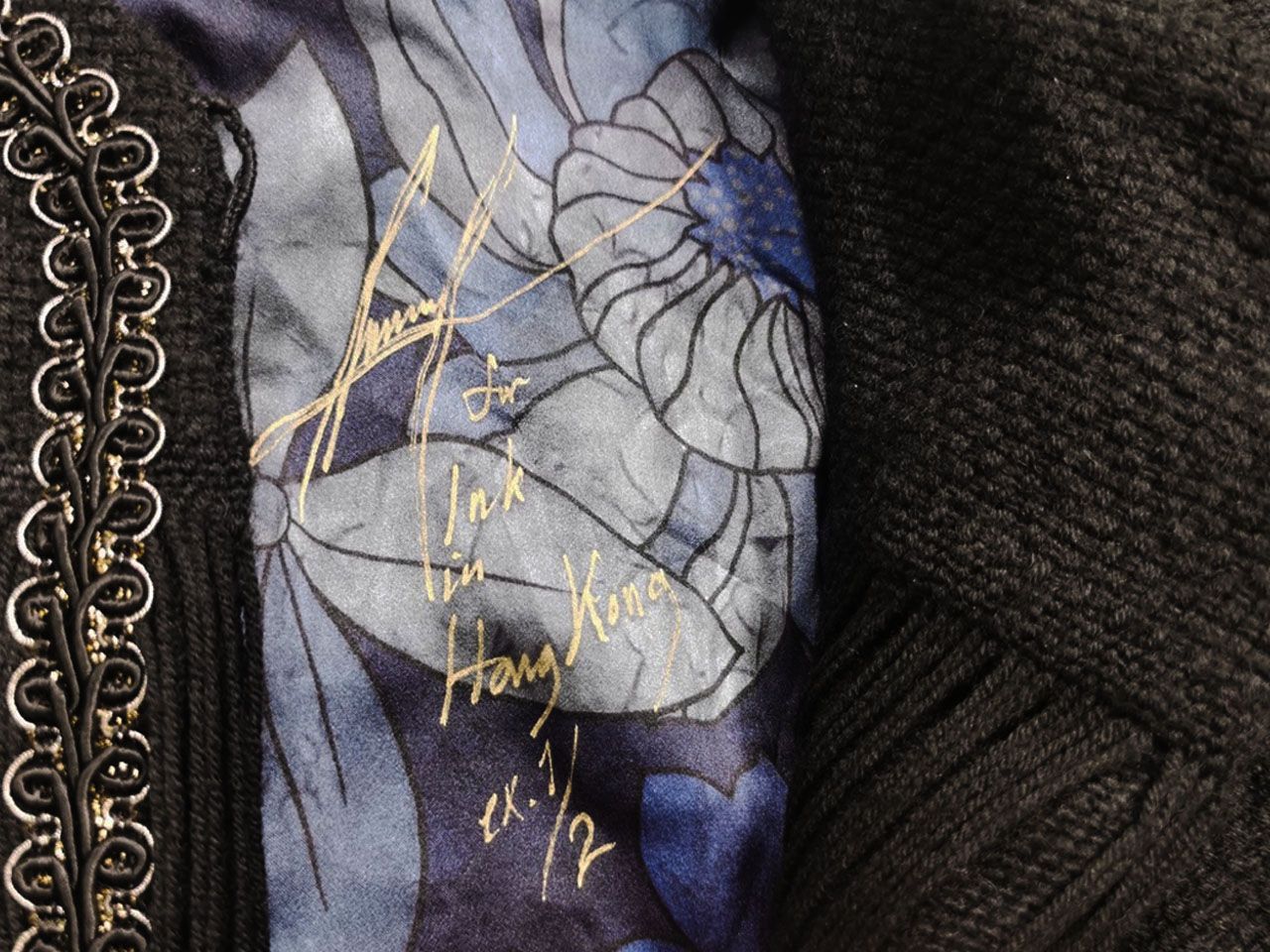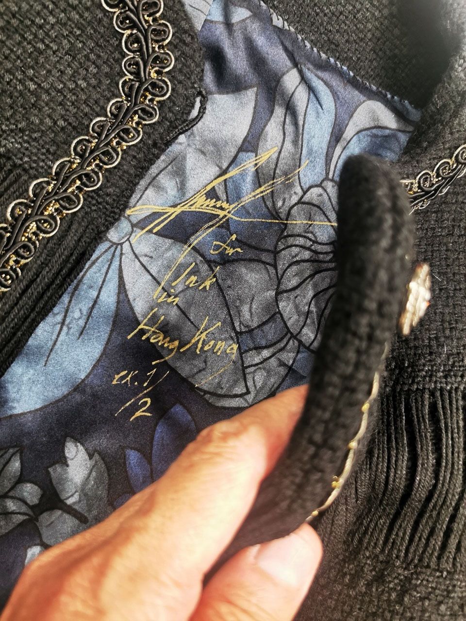 The special piece is handsigned and numbered by the designer and also features our world leading pure silk label created exclusively for us by Mion SpA in Torreglia which is the first label in the luxury industry to completely eliminate plastic polyester yarns in it—beautifully attached all by hand using pure silk thread...