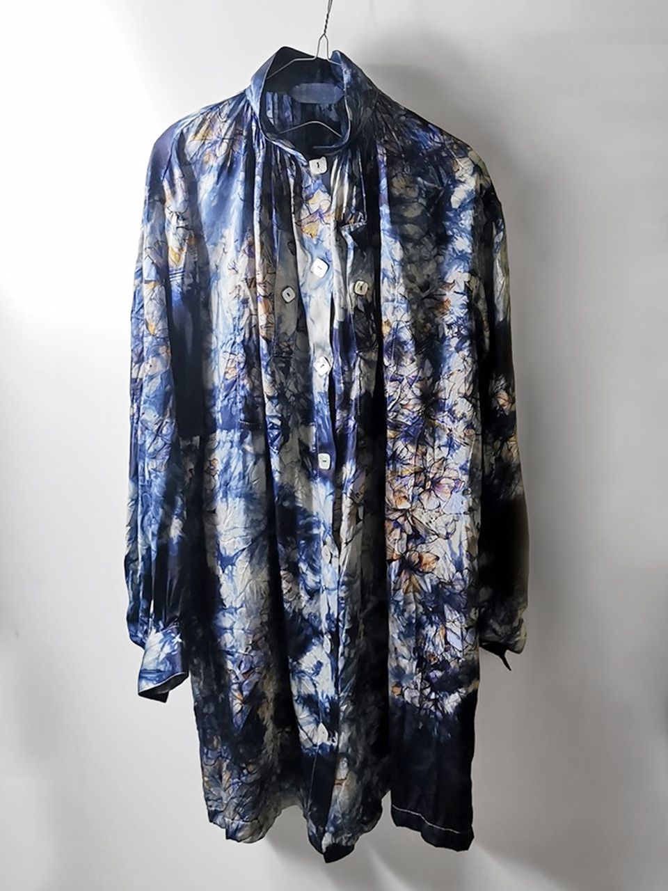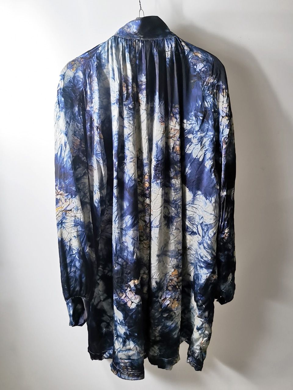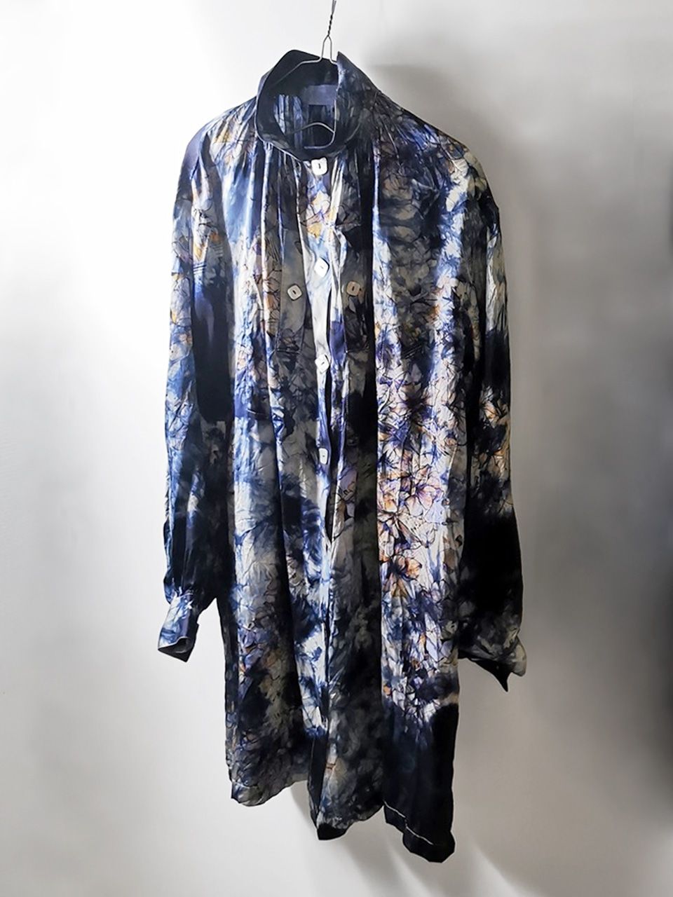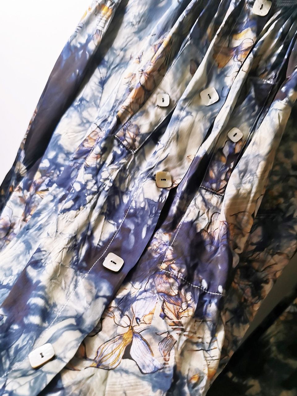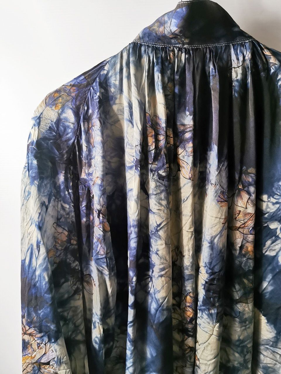 This special version of the super limited edition SEWD01 dress design is one of only 2 pieces of its kind made by hand in the entire world, each exclusively for T.O in Kochi, Japan from our antique 19th century tailored French prairie dress pattern, from our extensive tailoring research and cut using a pure silk 16 momme raso satin exclusive floral print design made for us by the Giordano family in Como Italy, the world's leading region for fine silk fabric creation, then individually hand dyed in our world famous GBS Superworkrooms at Cavarzere Venezia with our advanced extreme artisanal “accident dye” technique that uniquely renders its exceptional uneven colors, mottled patina effects and incredible softness. The design also features button-down welt pockets at the chest, amazing large rectangular shaped real mother-of-pearl button designs created exclusively for us by the world’s greatest living buttonmakers—Claudio and Cinzia Fontana in Parma, and no less than 11 of our signature real hand stitched buttonholes (that required 10-12 minutes to cut and sew each one, over 2 hours of expert and painstaking work on buttonholes and buttons for the single dress) in pure silk Bozzolo Reale Seta Milan threads. The piece also features our world leading pure silk hand dyed label created exclusively for us by Mion SpA in Torreglia which is the first label in the luxury industry to completely eliminate plastic polyester yarns in it– beautifully attached all by hand using pure silk threads. Variations in color and color density are not imperfections or irregularities, but specific characteristics of the special hand washing technique.