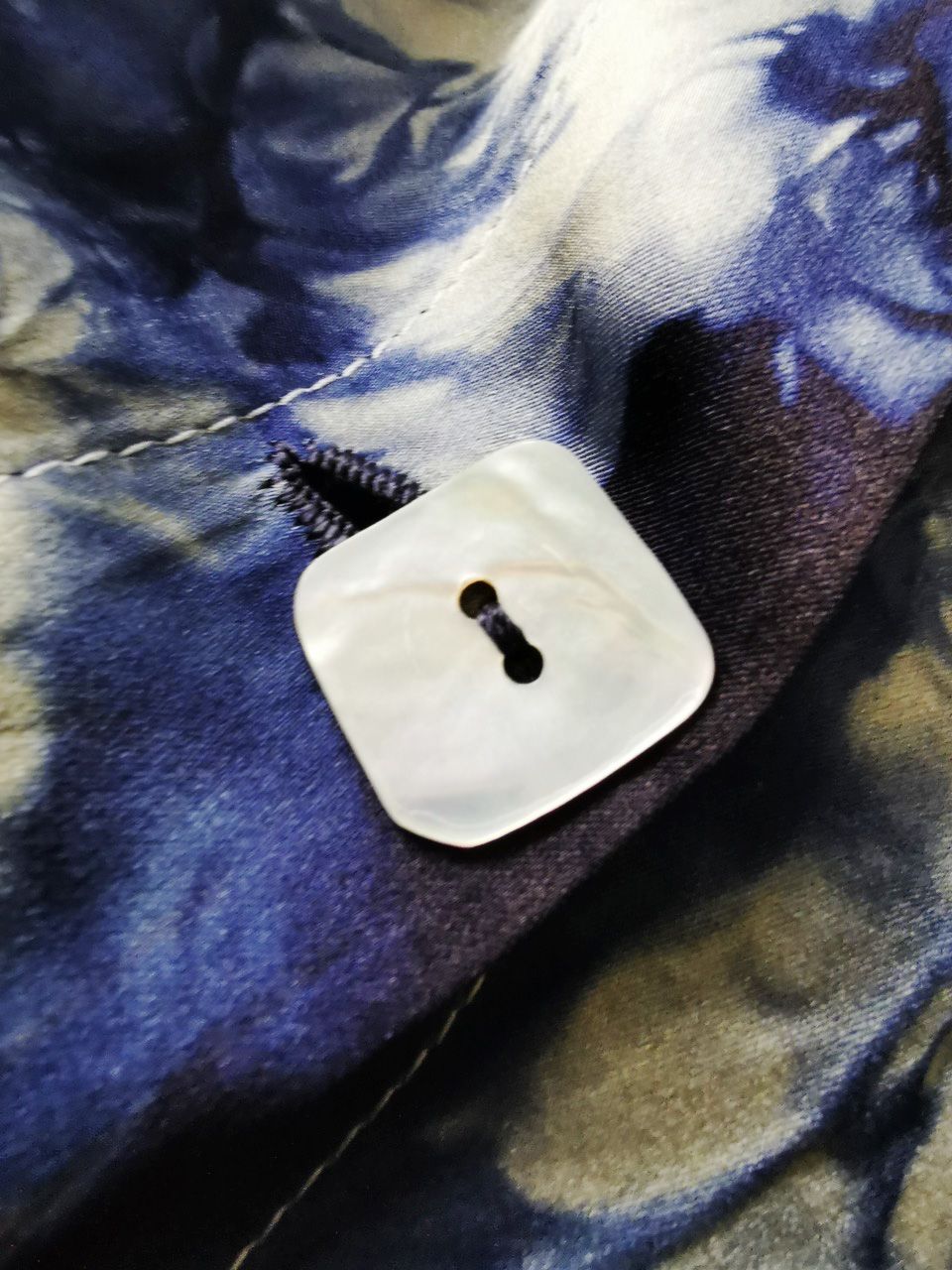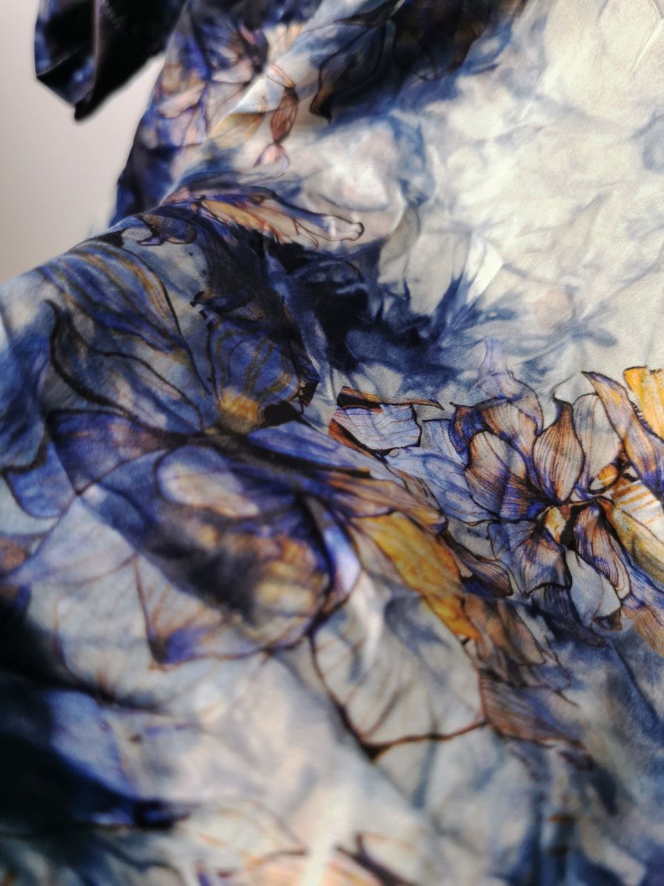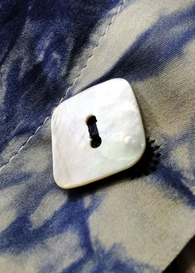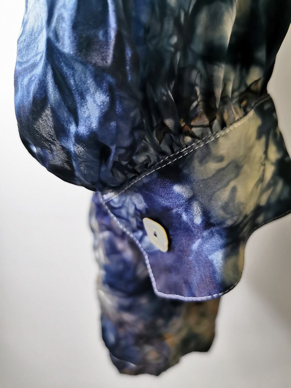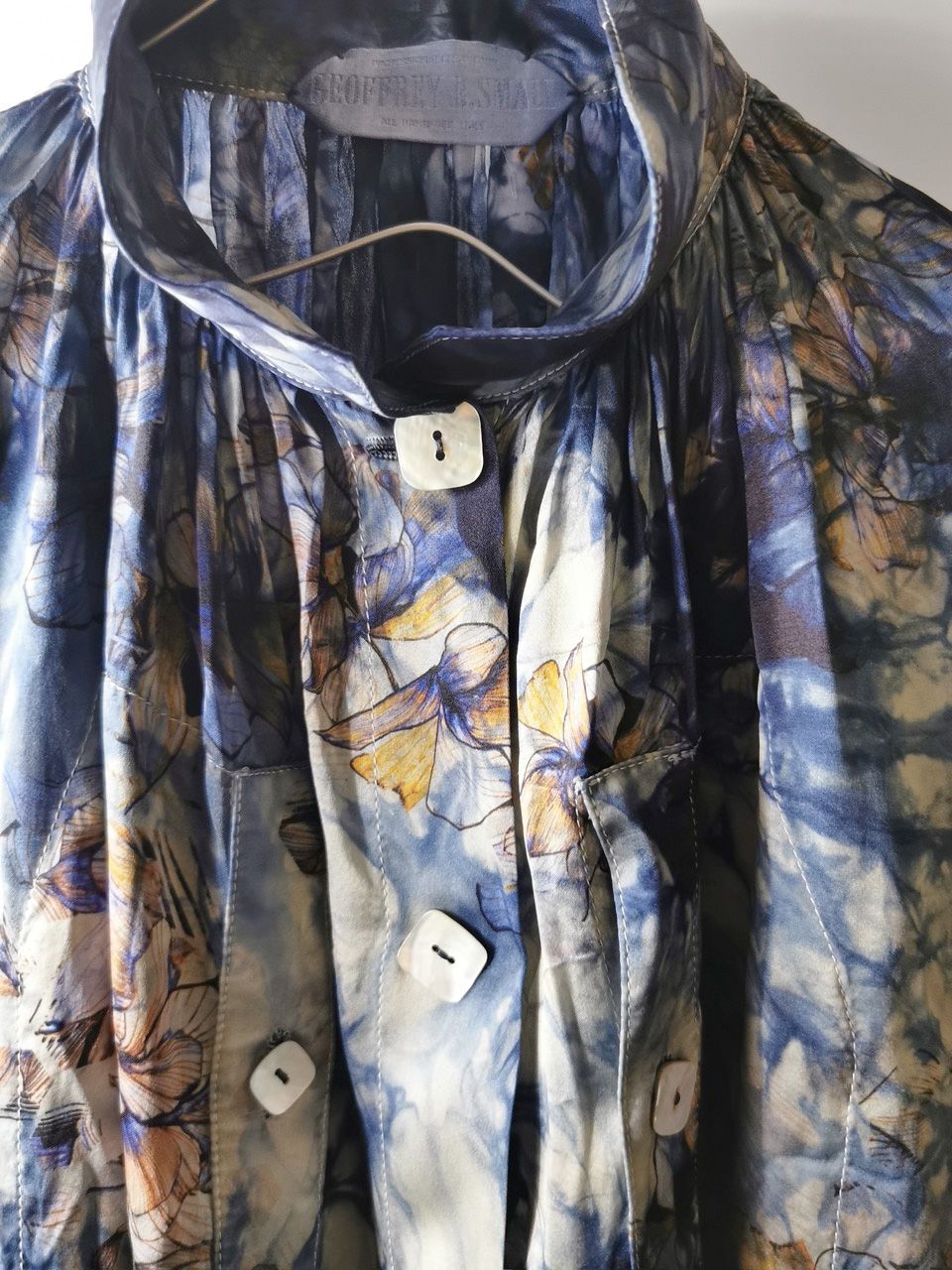 This special version of the super limited edition SEWD01 dress design is one of only 2 pieces of its kind made by hand in the entire world, each exclusively for T.O in Kochi, Japan from our antique 19th century tailored French prairie dress pattern, from our extensive tailoring research and cut using a pure silk 16 momme raso satin exclusive floral print design made for us by the Giordano family in Como Italy, the world's leading region for fine silk fabric creation, then individually hand dyed in our world famous GBS Superworkrooms at Cavarzere Venezia with our advanced extreme artisanal “accident dye” technique that uniquely renders its exceptional uneven colors, mottled patina effects and incredible softness. The design also features button-down welt pockets at the chest, amazing large rectangular shaped real mother-of-pearl button designs created exclusively for us by the world’s greatest living buttonmakers—Claudio and Cinzia Fontana in Parma, and no less than 11 of our signature real hand stitched buttonholes (that required 10-12 minutes to cut and sew each one, over 2 hours of expert and painstaking work on buttonholes and buttons for the single dress) in pure silk Bozzolo Reale Seta Milan threads. The piece also features our world leading pure silk hand dyed label created exclusively for us by Mion SpA in Torreglia which is the first label in the luxury industry to completely eliminate plastic polyester yarns in it– beautifully attached all by hand using pure silk threads. Variations in color and color density are not imperfections or irregularities, but specific characteristics of the special hand washing technique.